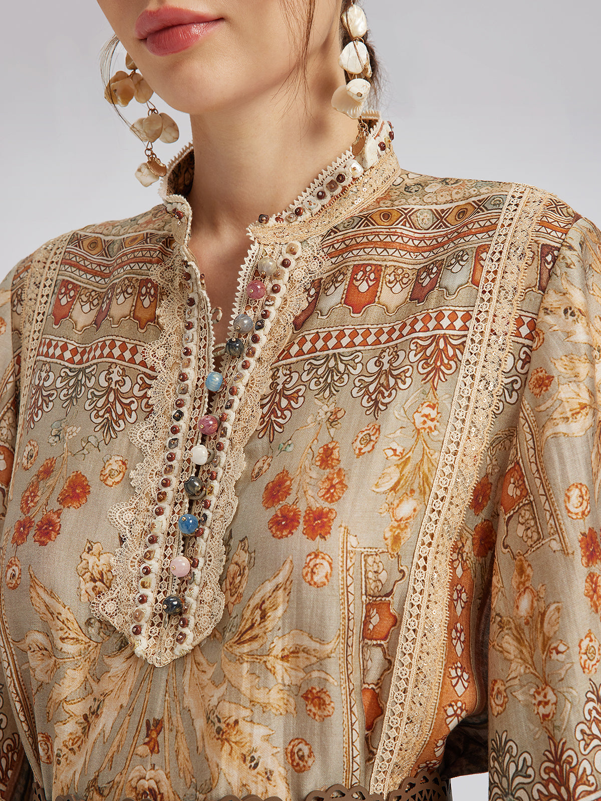The artistic botanical print is vivid and refined, with vintage, elegant tones that evoke a lush secret garden captured on the dress. Delicately placed lace accents at the neckline, cuffs, and hem break up the density of the print, adding layered softness and movement. A relaxed cut offers both comfort and shape.