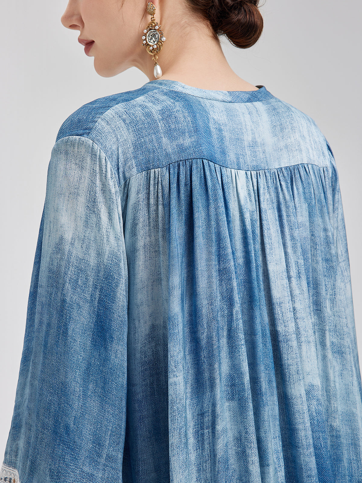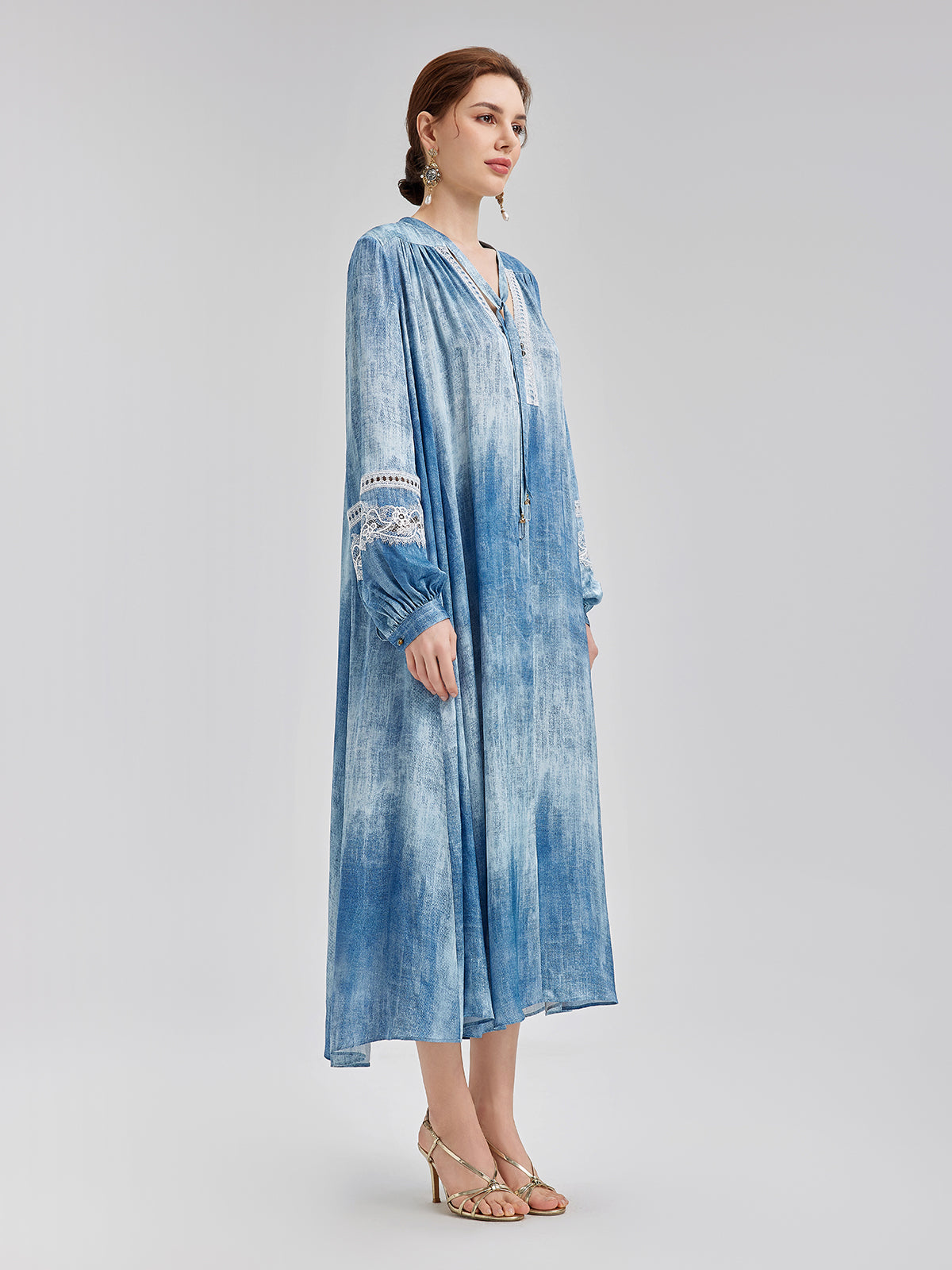 Crafted from viscose with a natural, washed vintage effect, this dress features a structured silhouette and vintage-inspired prints. The V-neck is accented with delicate lace trim, which is mirrored at the cuffs. An adjustable neck tie allows for versatile styling, while the loose A-line cut flatters all body types. (Comes with a matching fabric belt; white belt not included.)