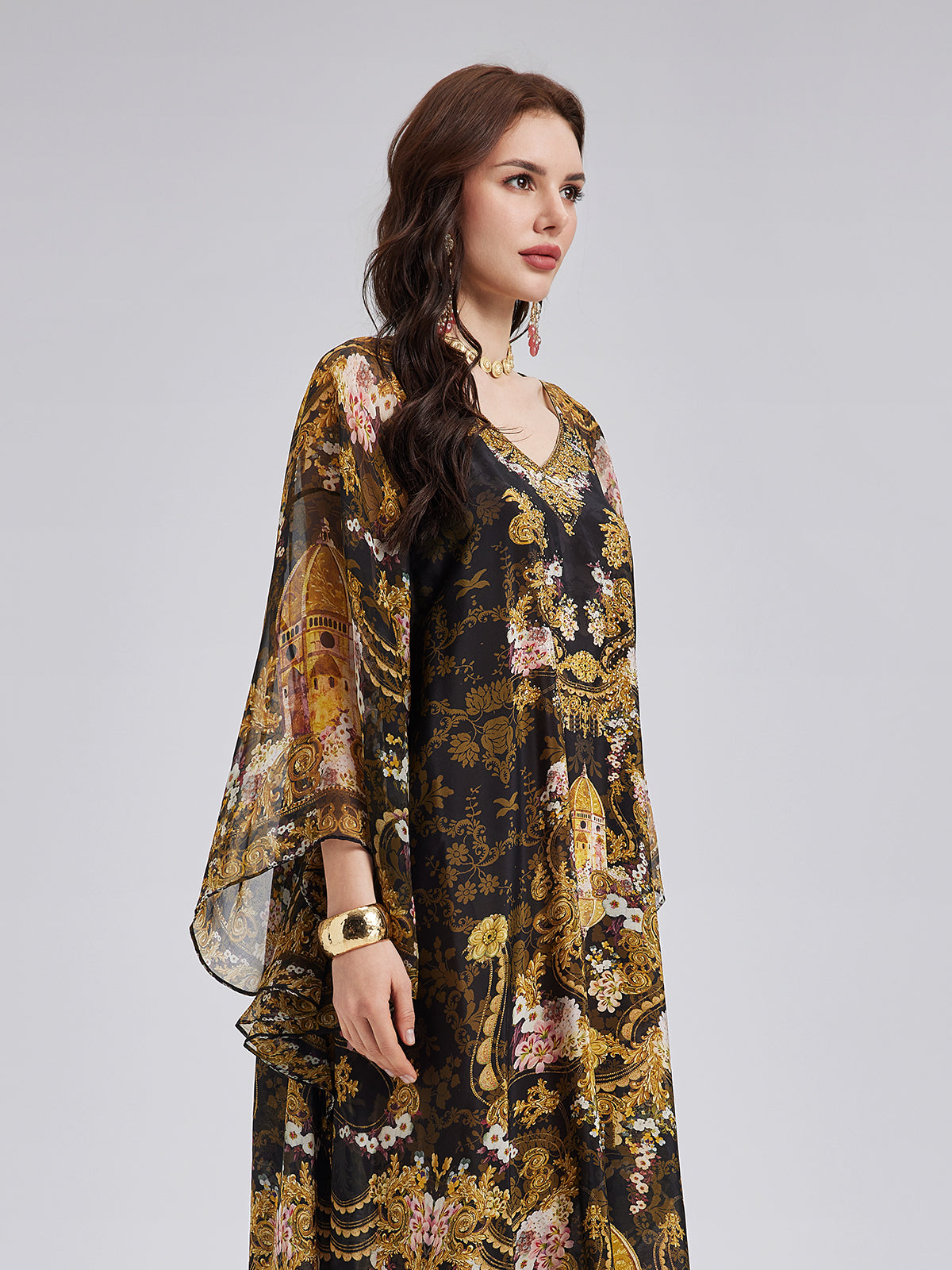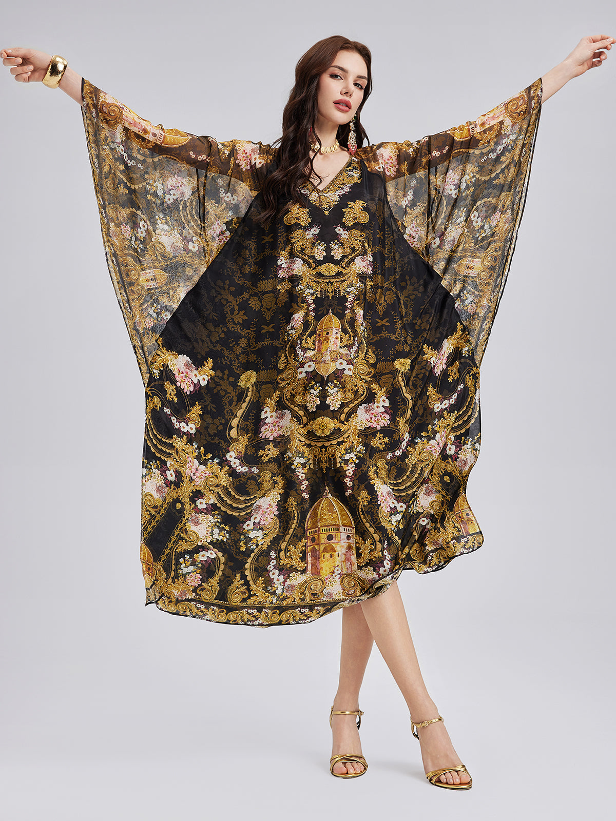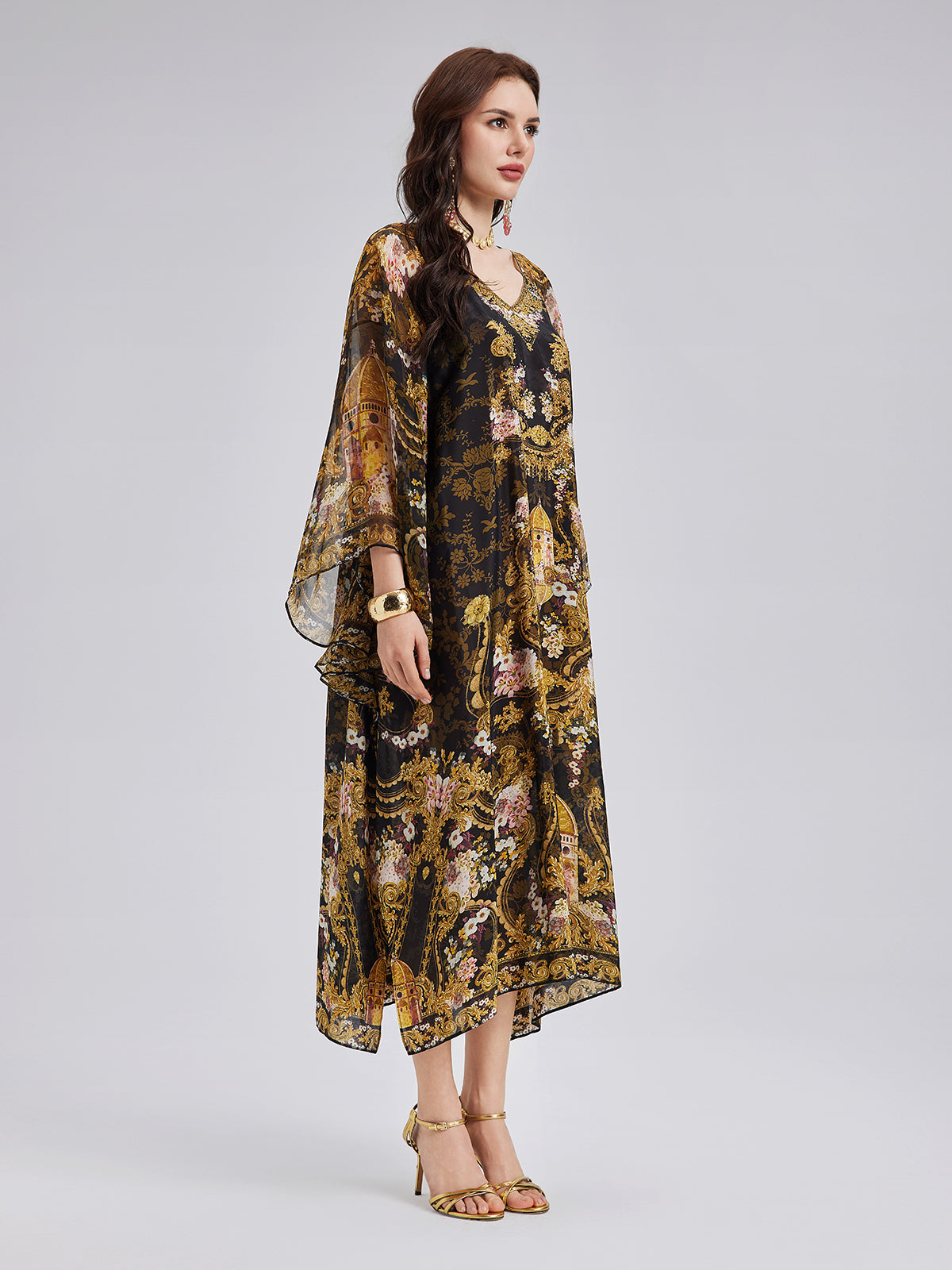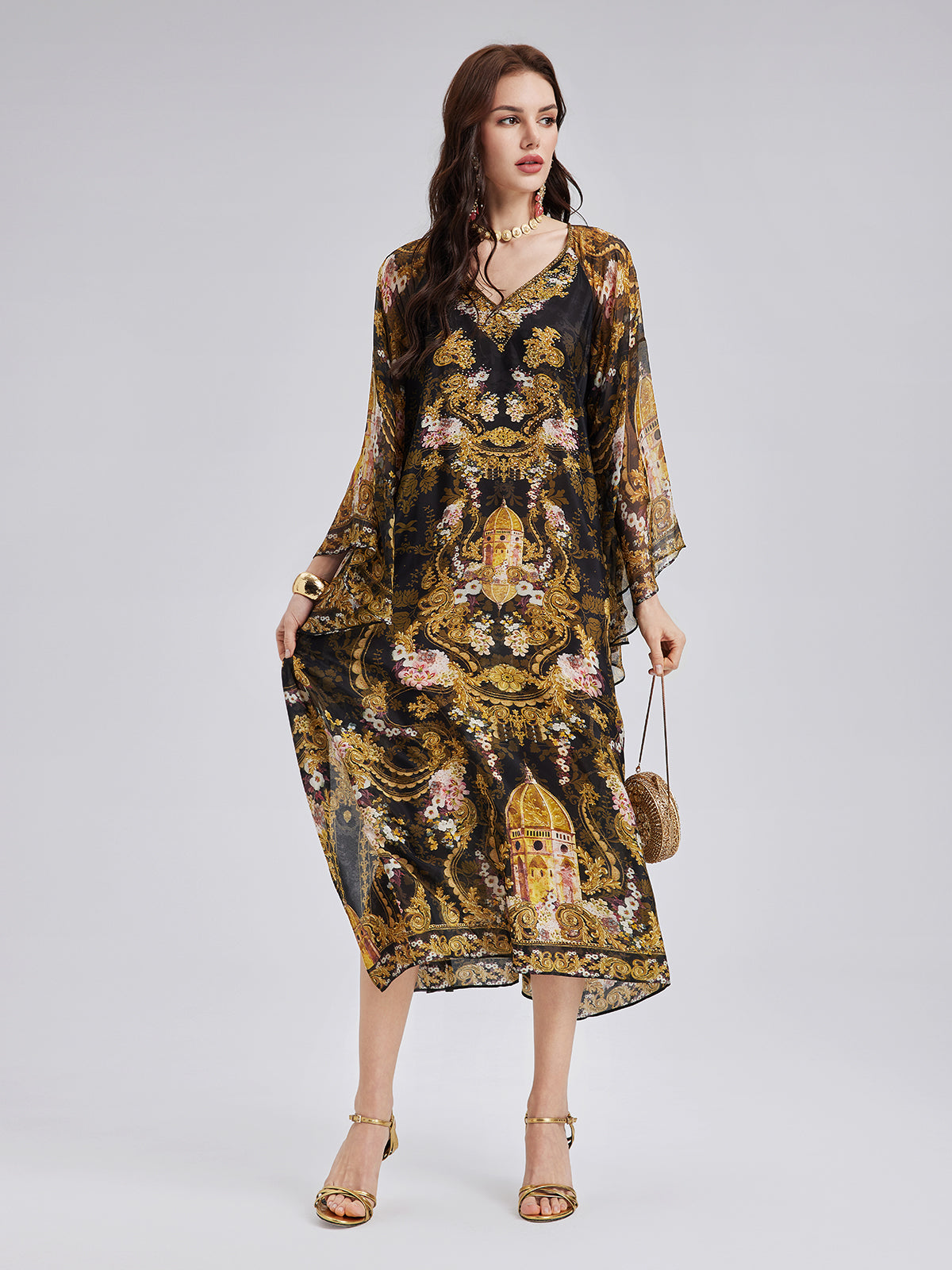 Made from high-quality Baroque-print silk, this dress is soft, breathable, and comfortable on the skin. The vivid, long-lasting print exudes luxury and elegance. The loose fit offers freedom of movement while flattering the figure, and the batwing sleeves elegantly conceal the arms.