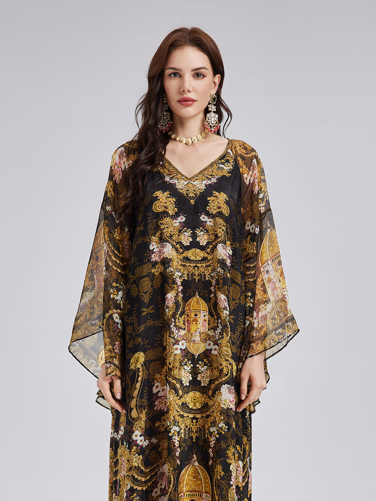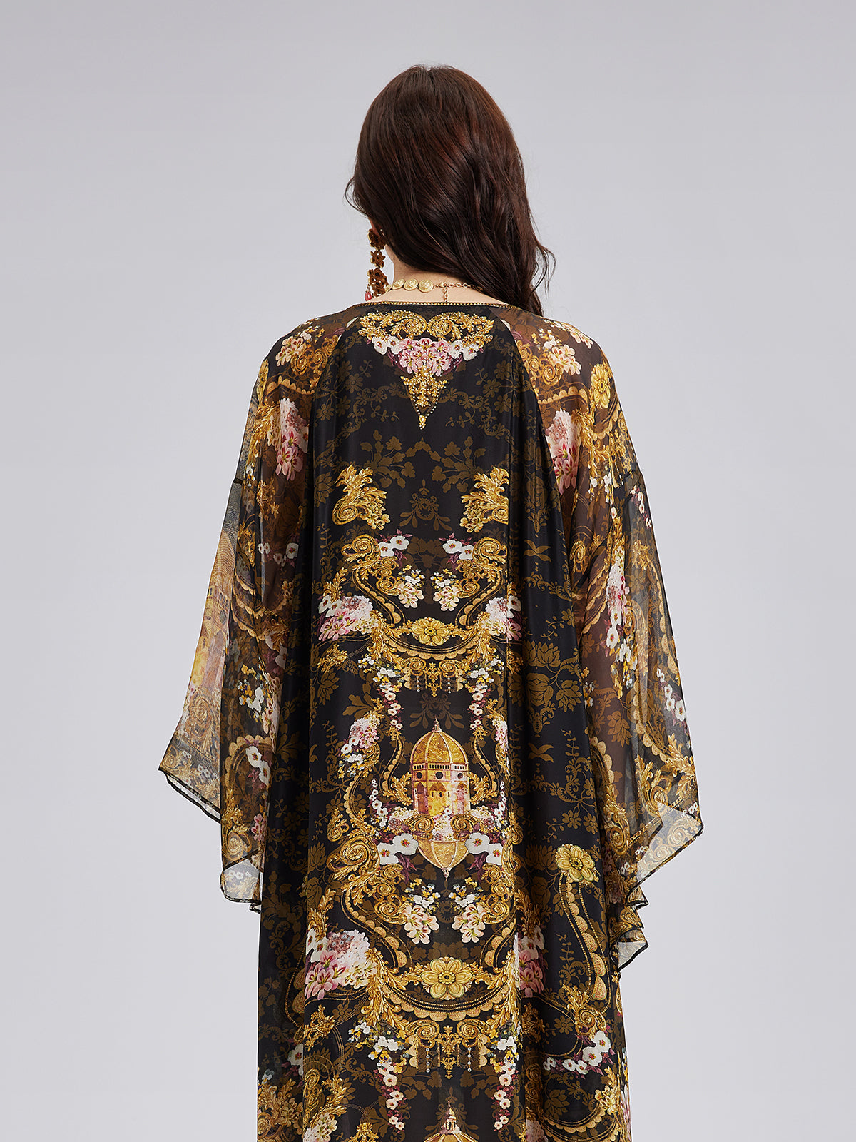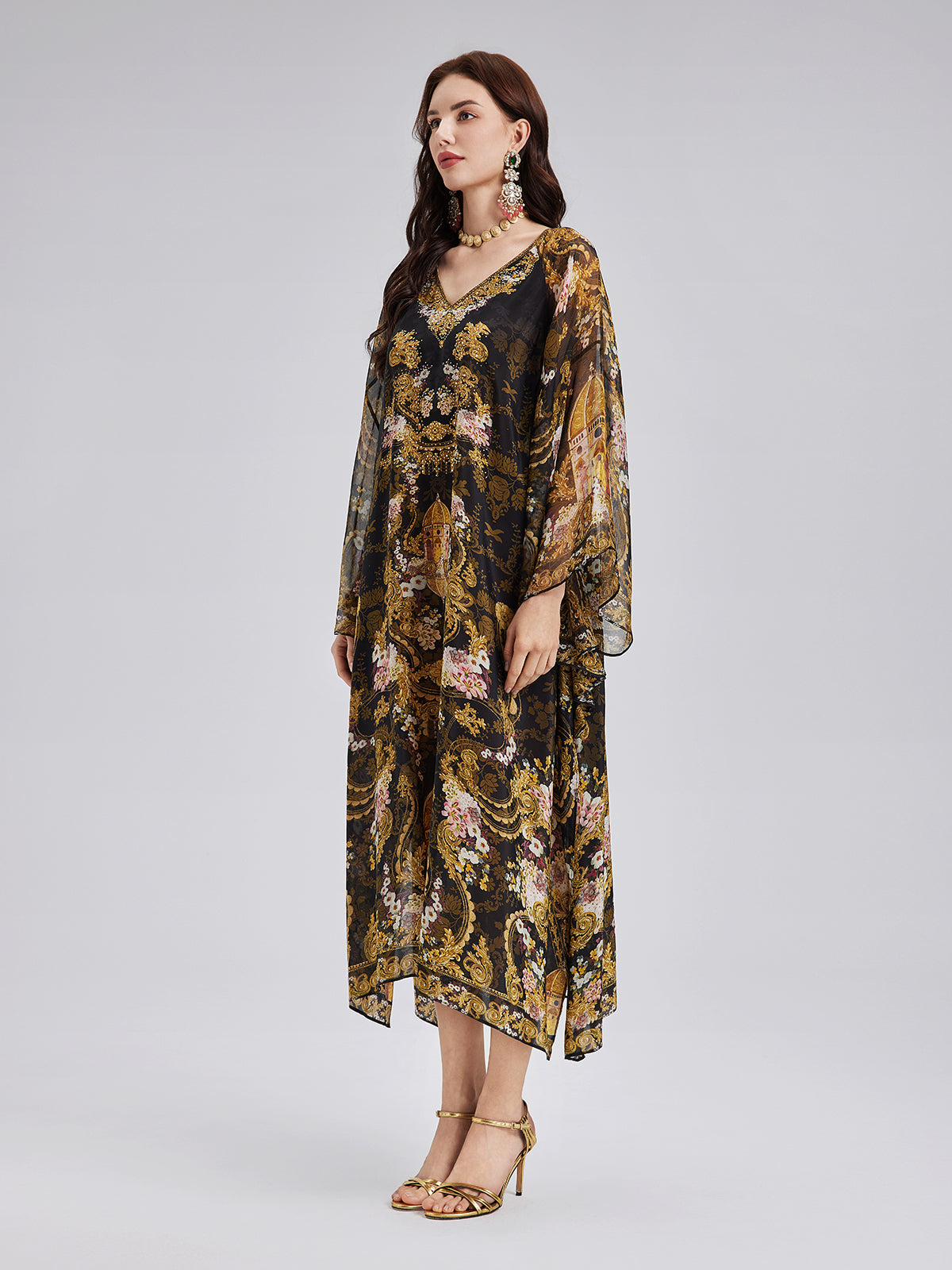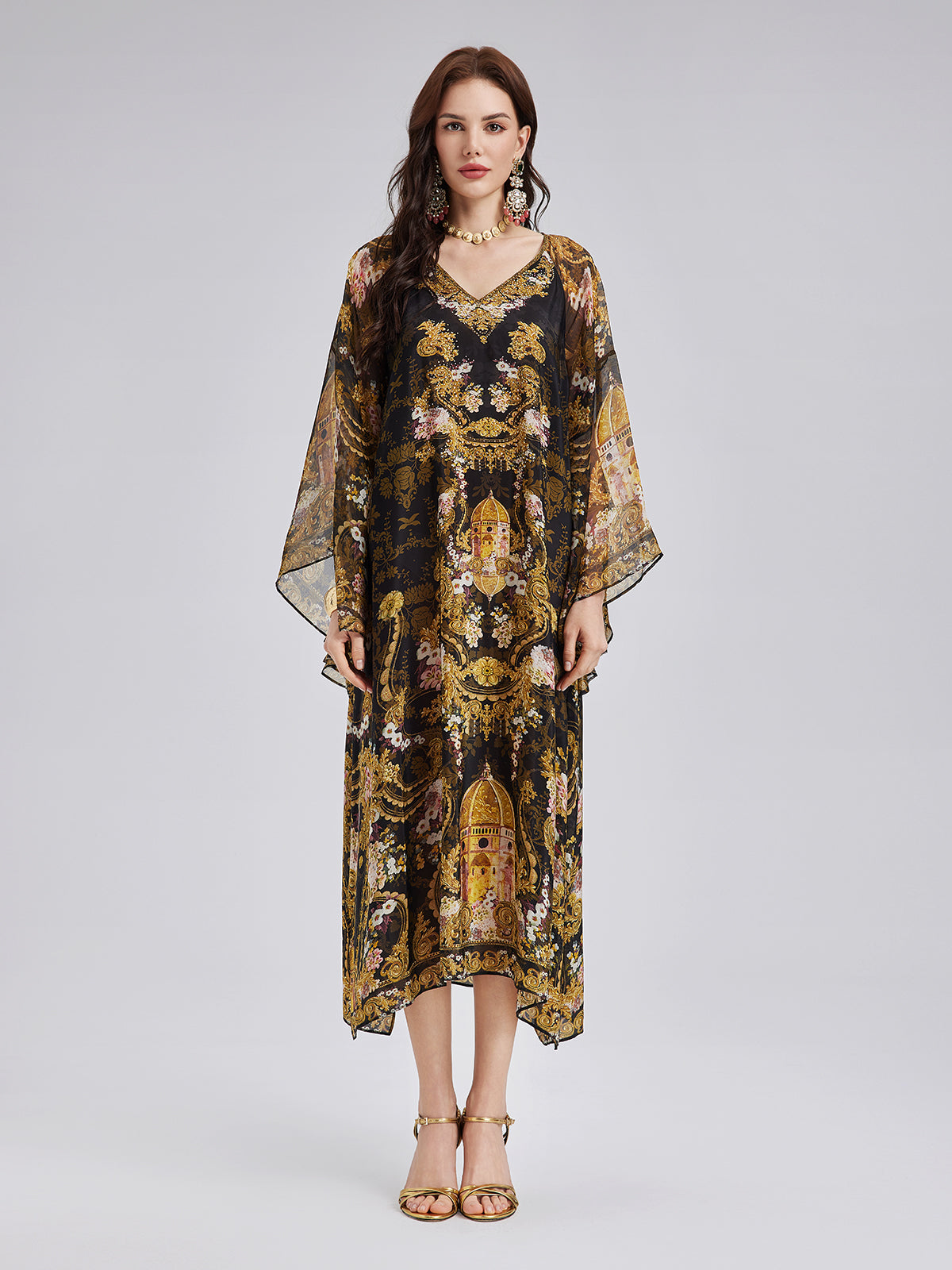 Made from high-quality Baroque-print silk, this dress is soft, breathable, and comfortable on the skin. The vivid, long-lasting print exudes luxury and elegance. The loose fit offers freedom of movement while flattering the figure, and the batwing sleeves elegantly conceal the arms.