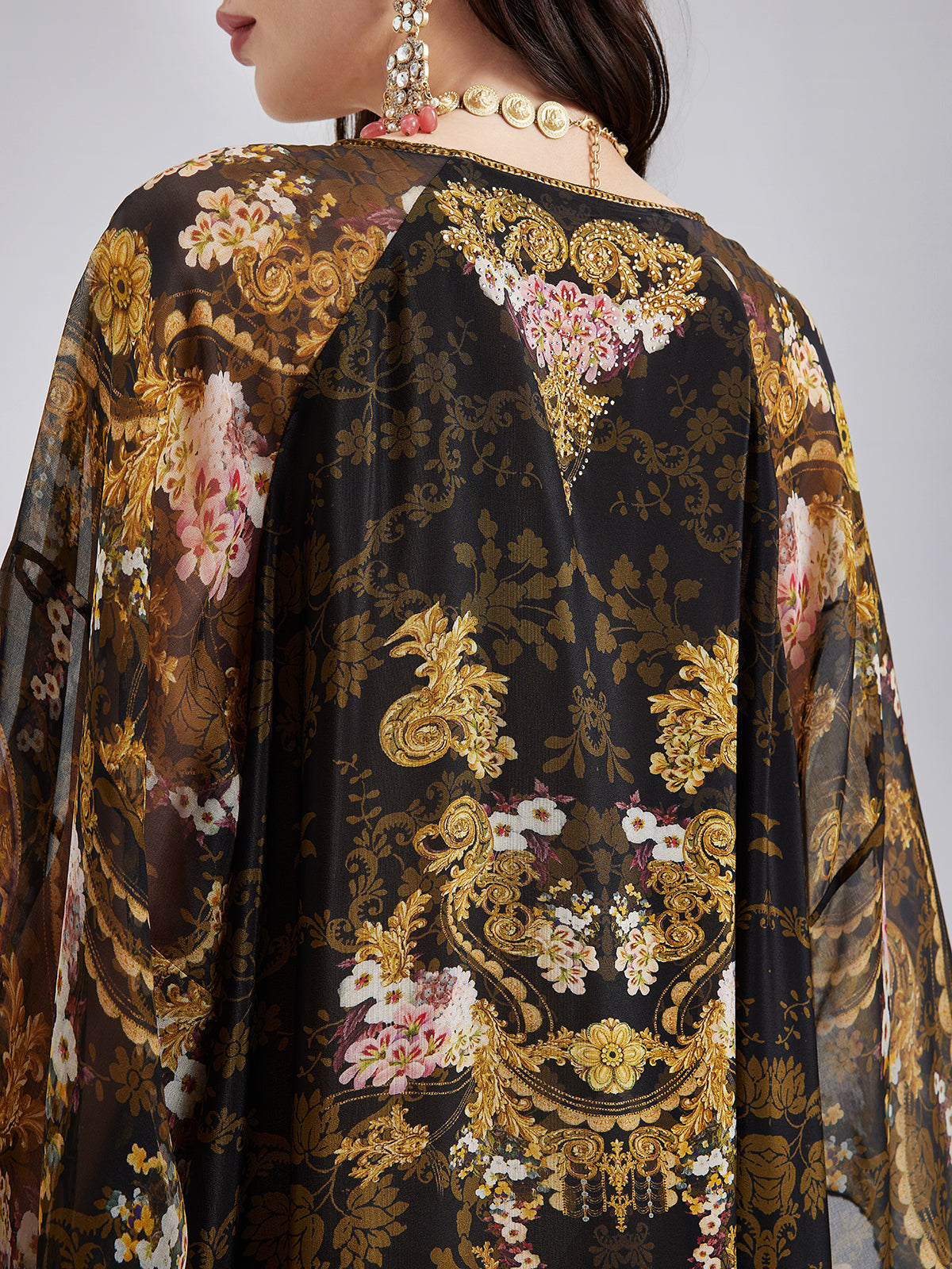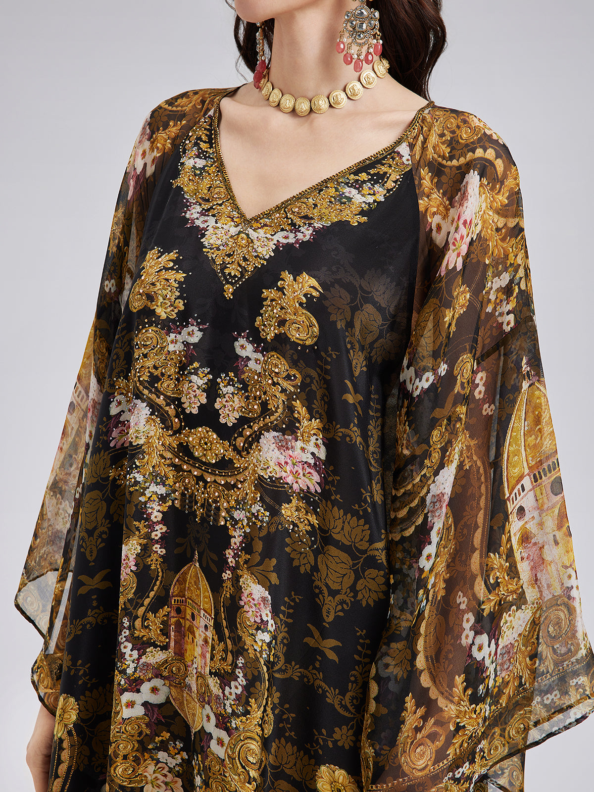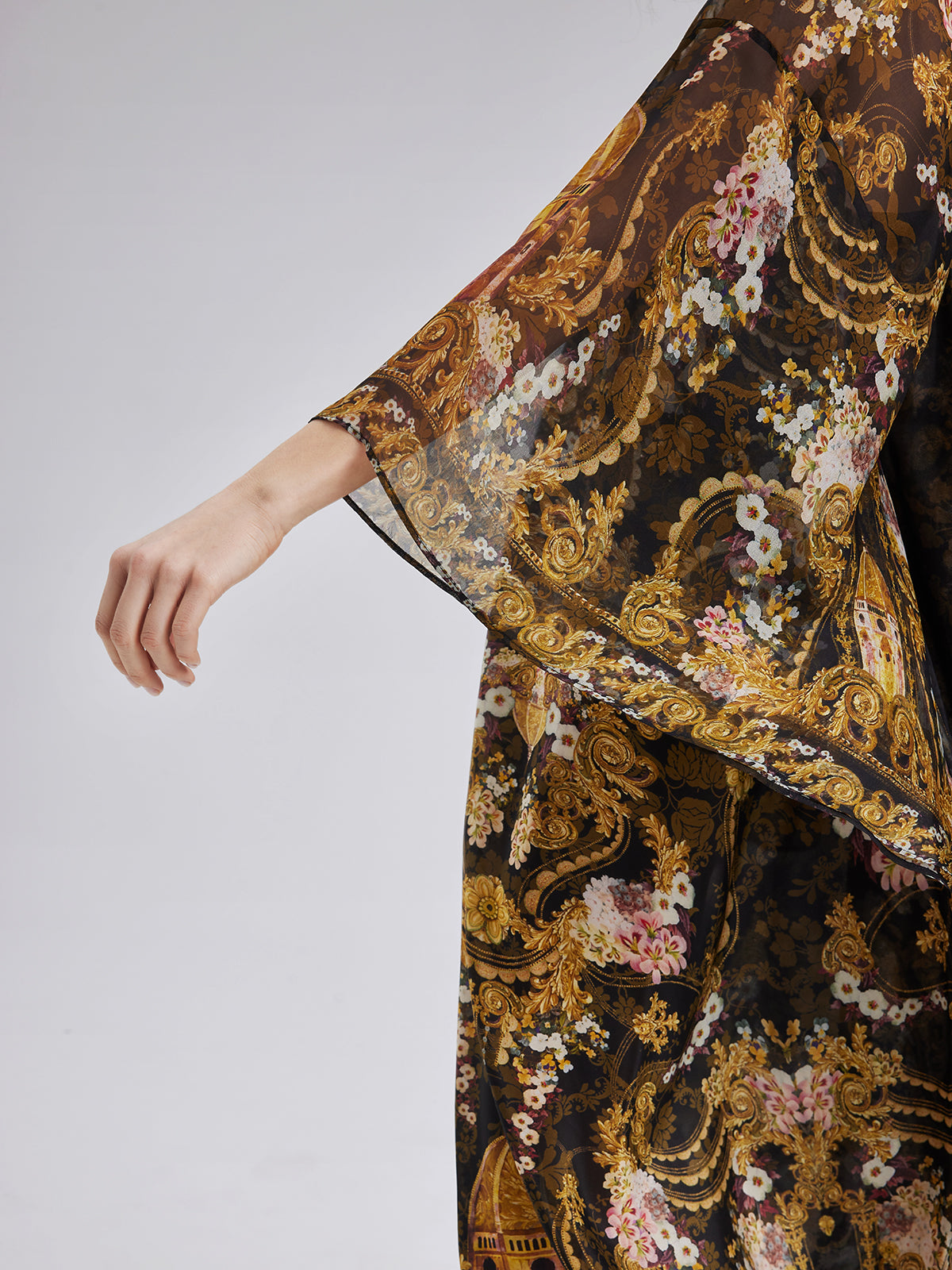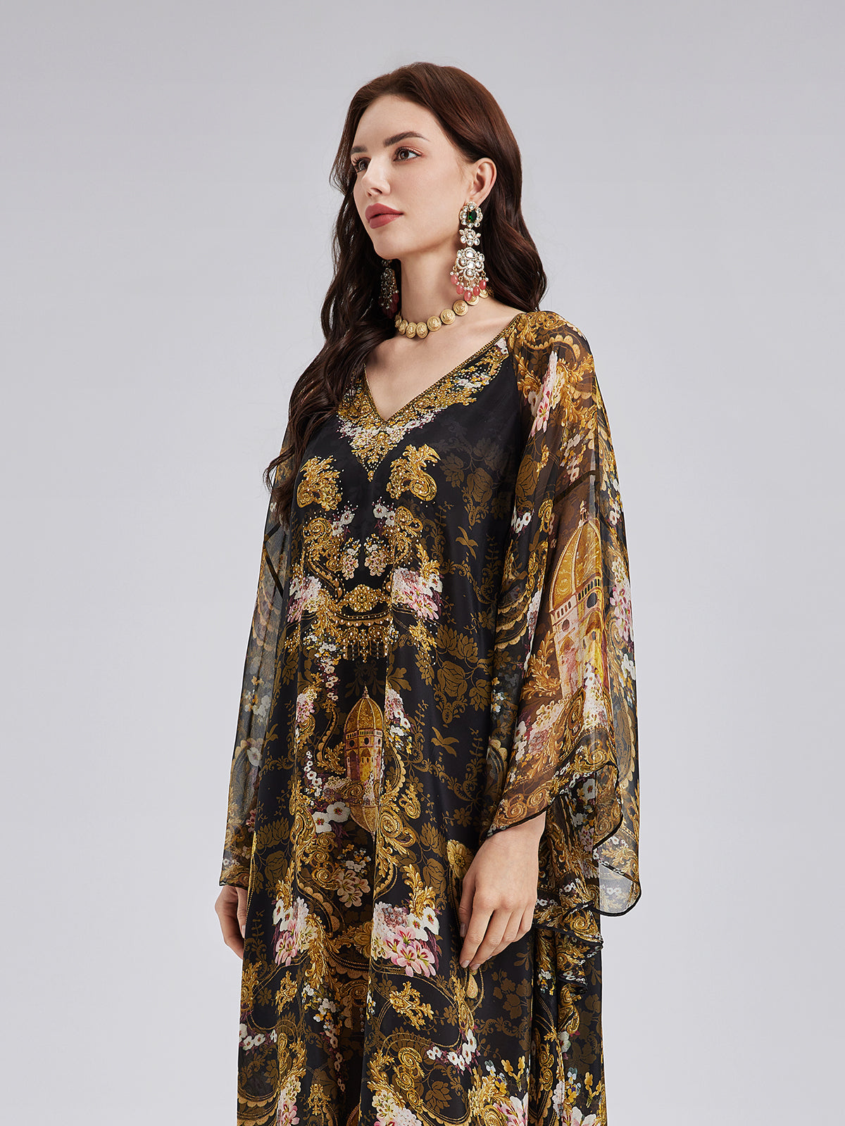 Made from high-quality Baroque-print silk, this dress is soft, breathable, and comfortable on the skin. The vivid, long-lasting print exudes luxury and elegance. The loose fit offers freedom of movement while flattering the figure, and the batwing sleeves elegantly conceal the arms.