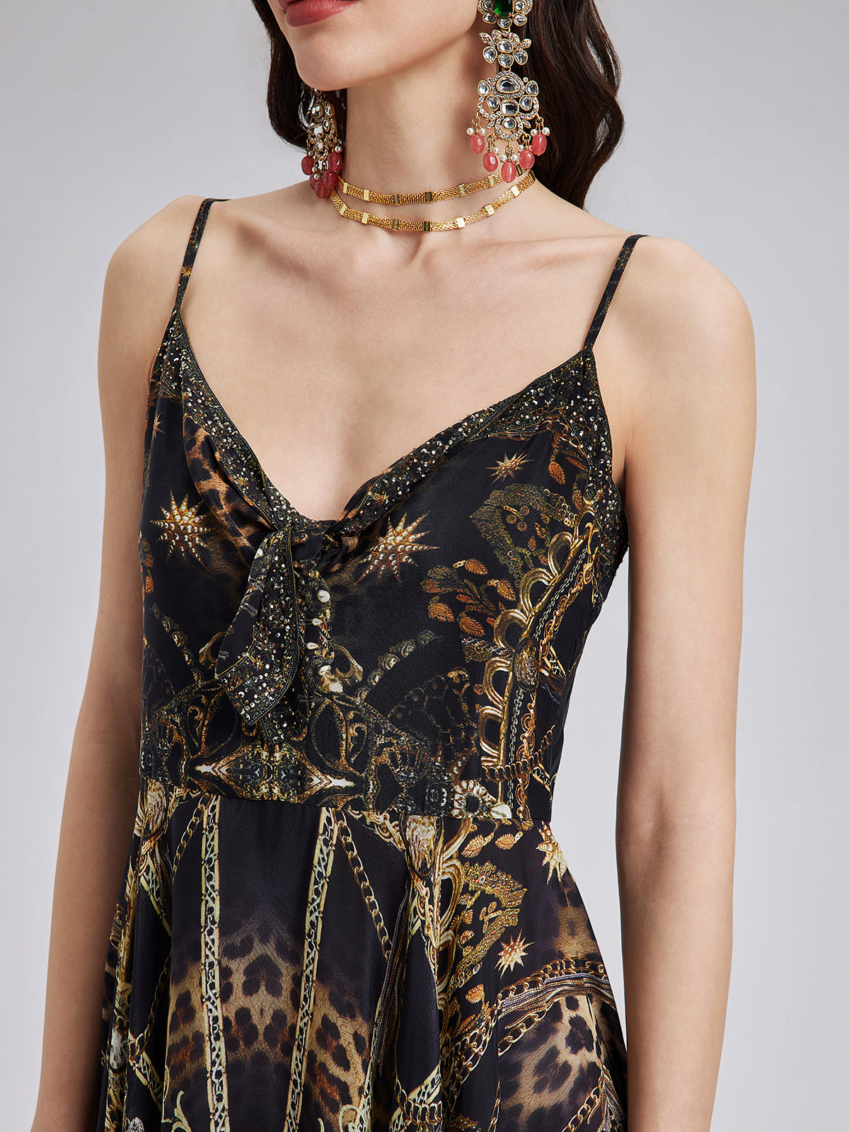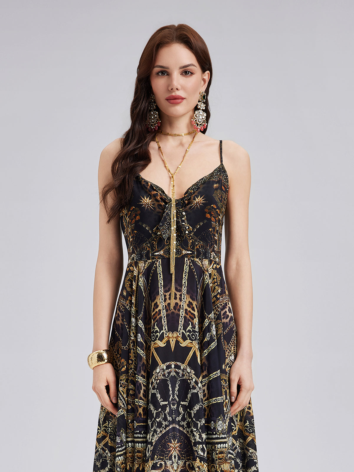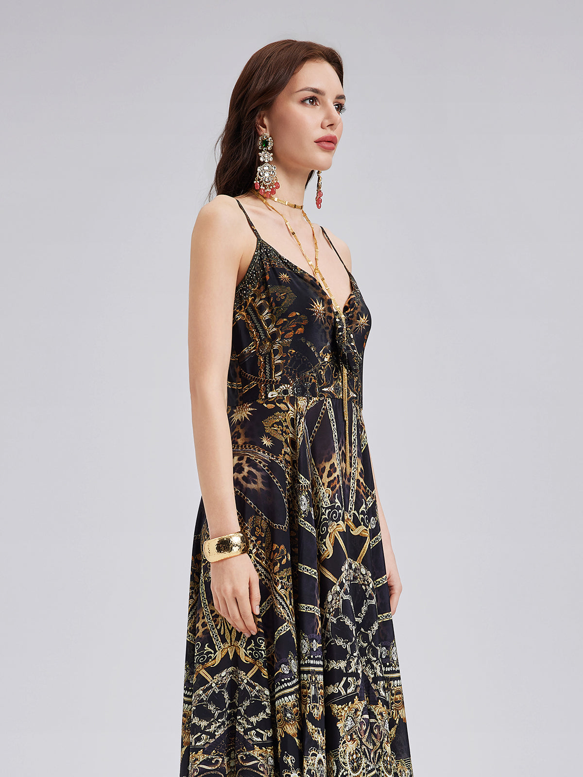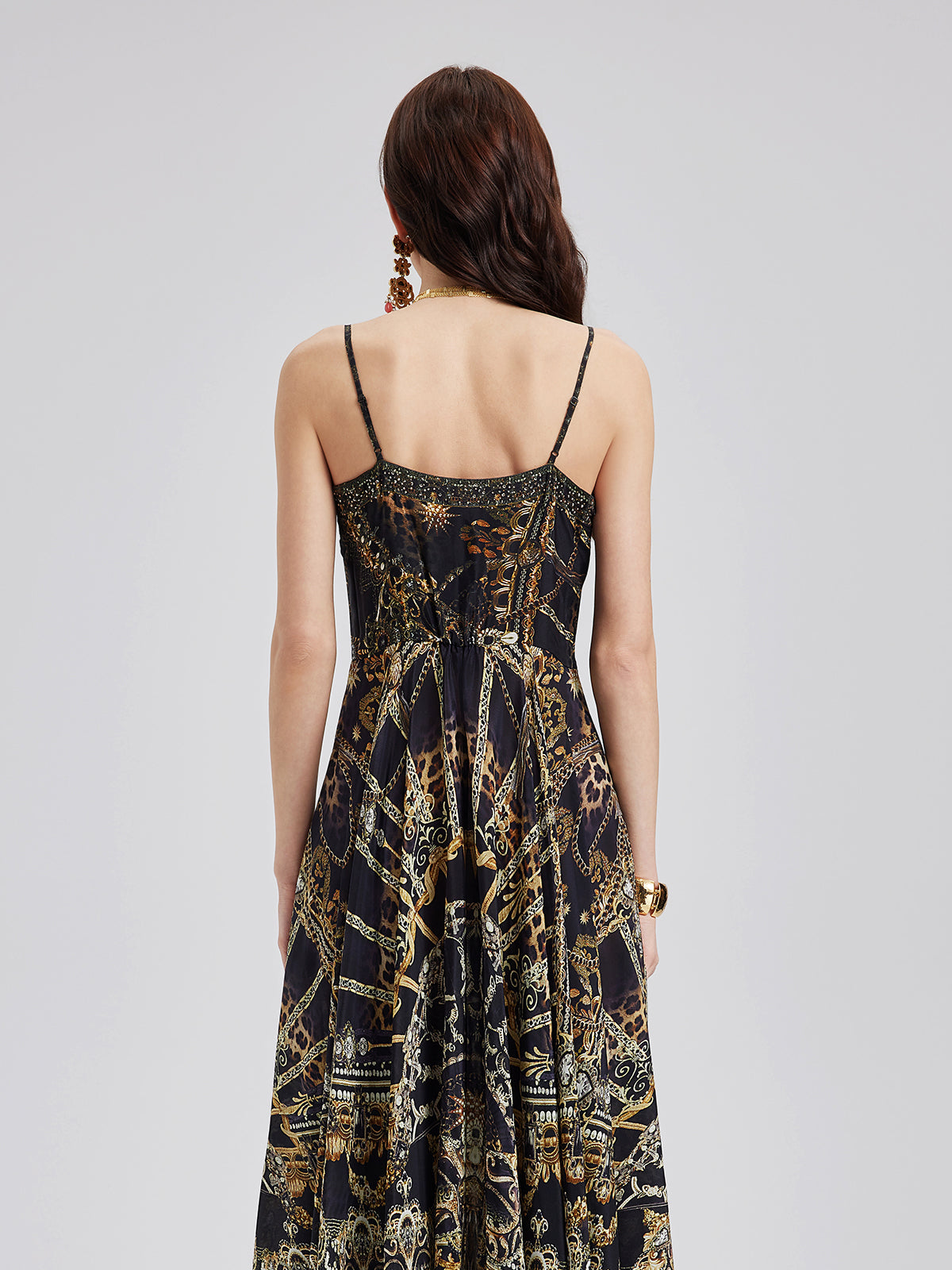 Made from luxurious silk with an intricate Baroque print, this dress is soft, breathable, and elegantly refined. A cinched waist enhances the silhouette, while delicate rhinestone embellishments at the neckline add a touch of sparkle and sophistication.