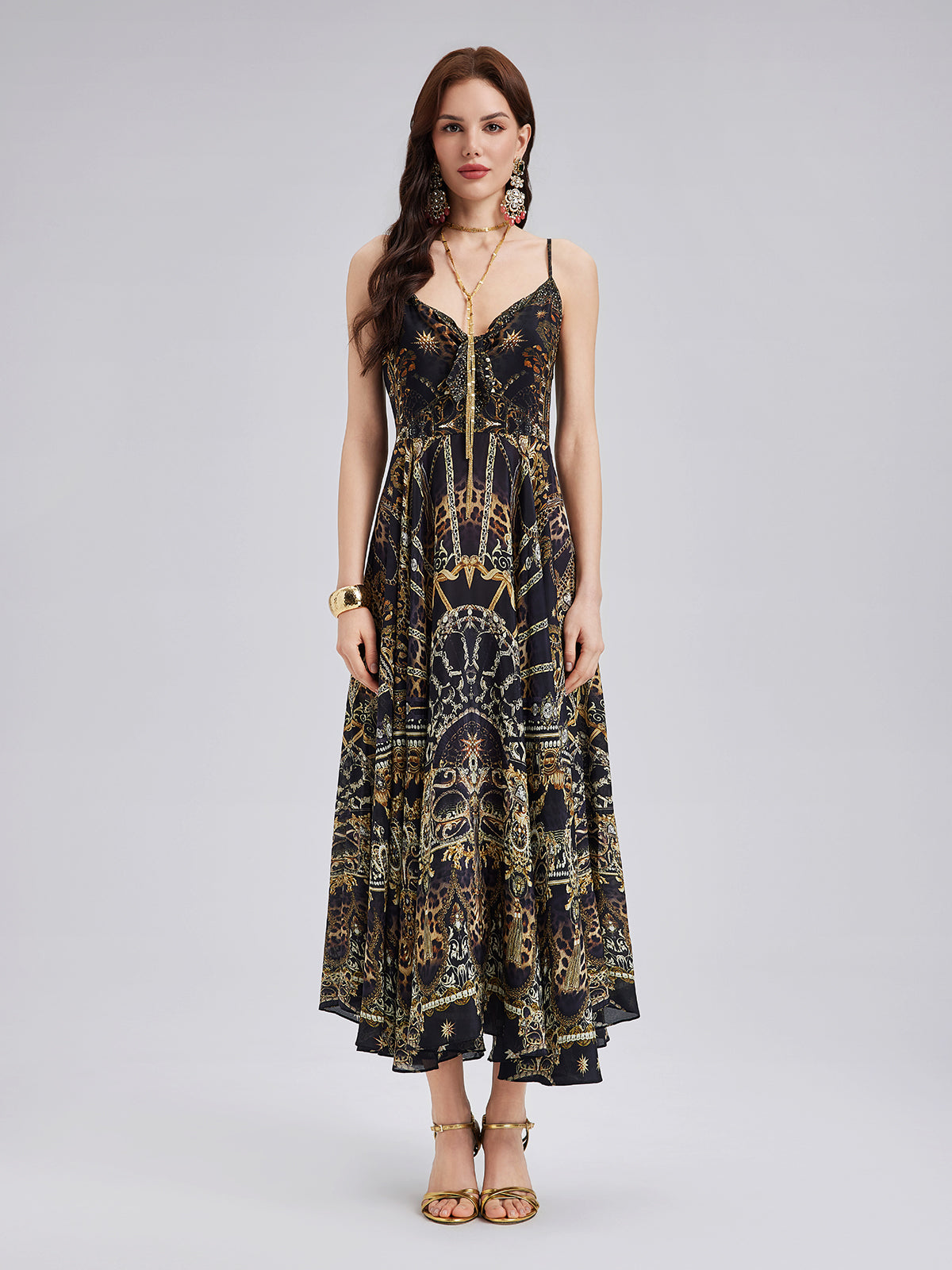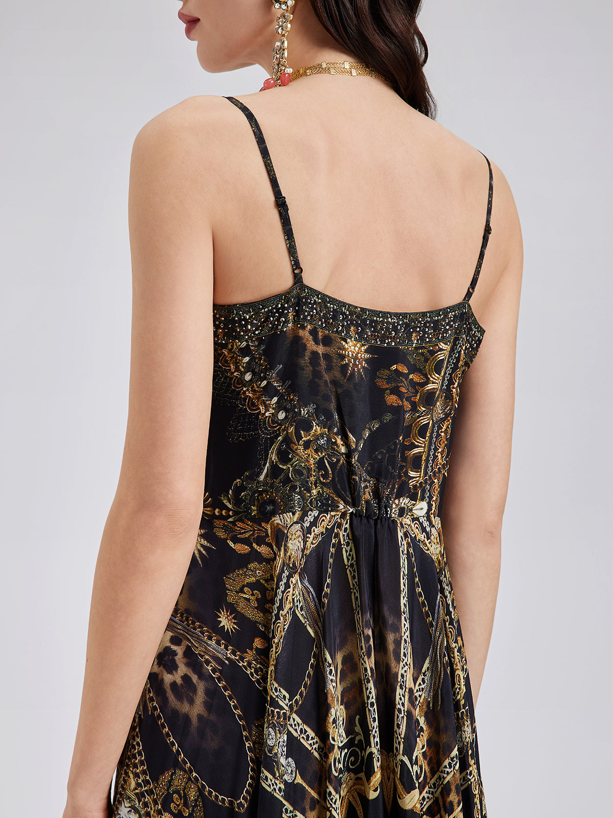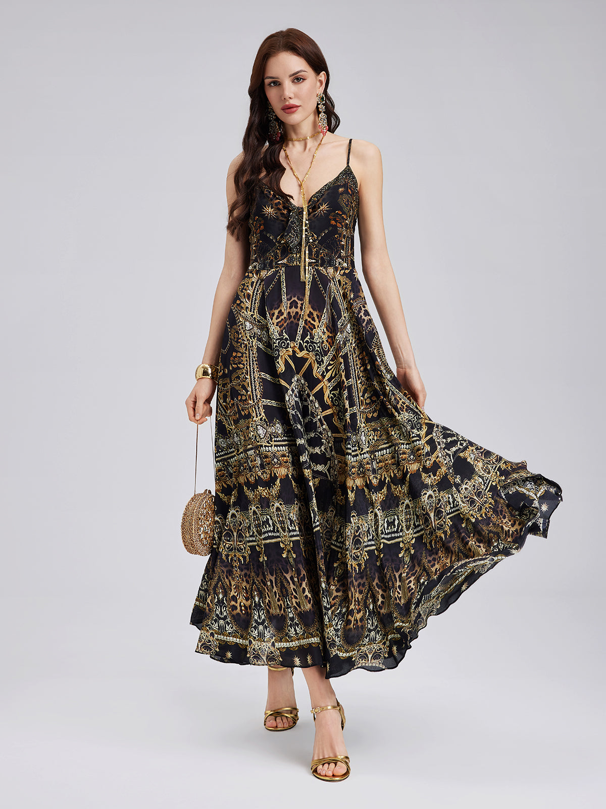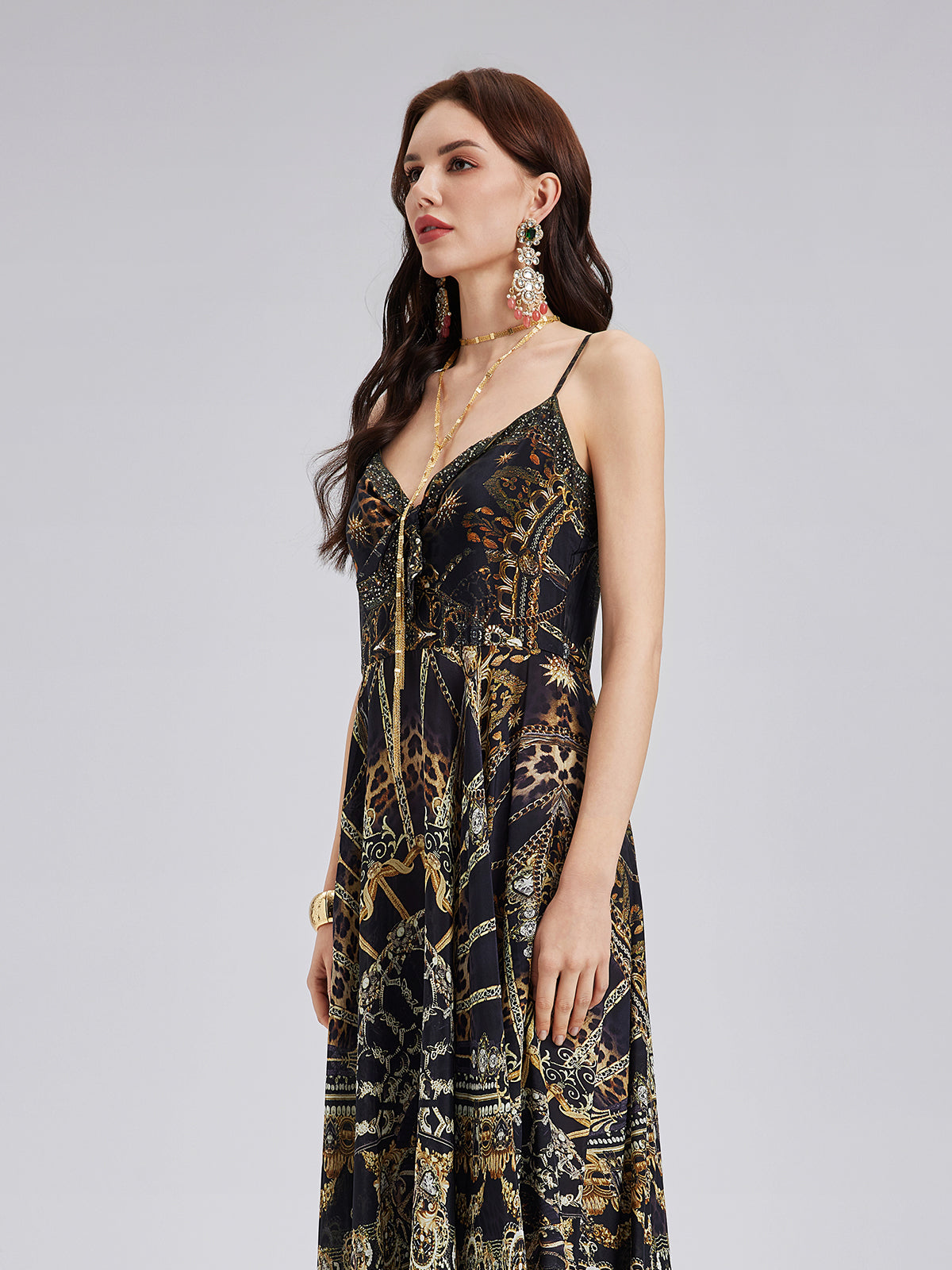 Made from luxurious silk with an intricate Baroque print, this dress is soft, breathable, and elegantly refined. A cinched waist enhances the silhouette, while delicate rhinestone embellishments at the neckline add a touch of sparkle and sophistication.