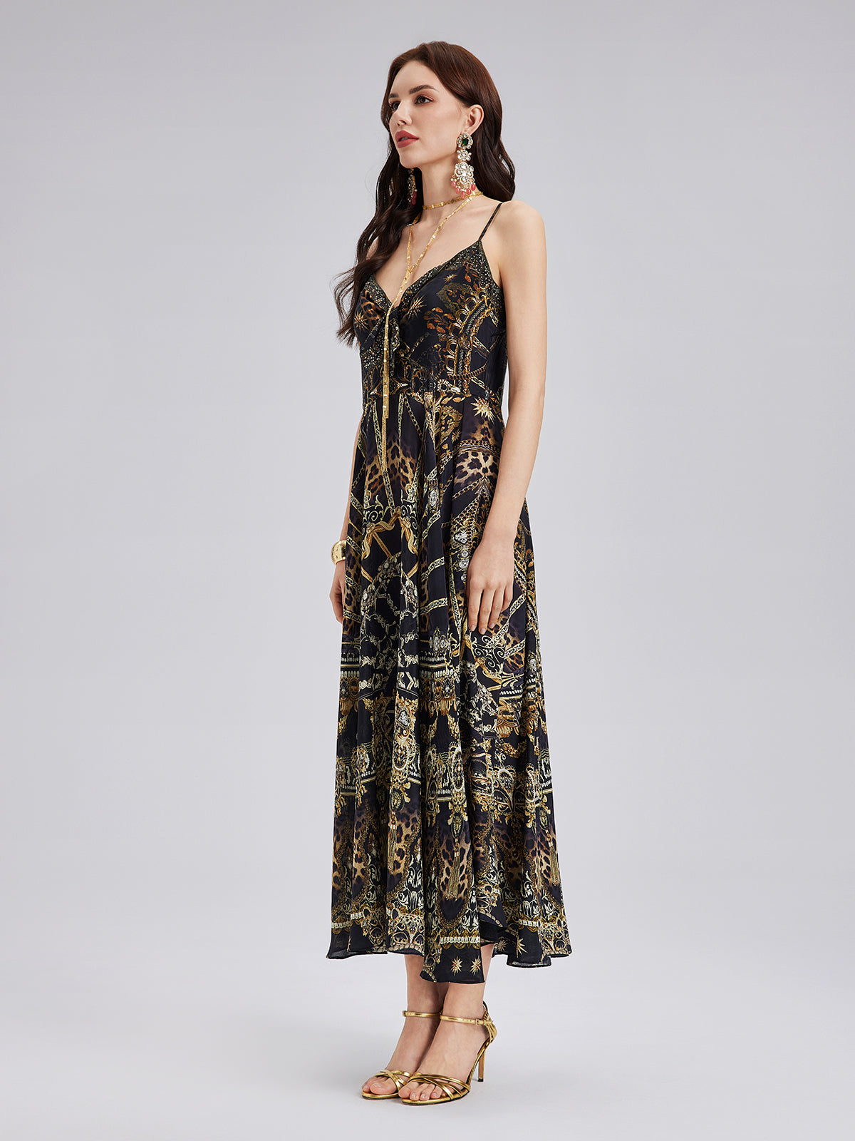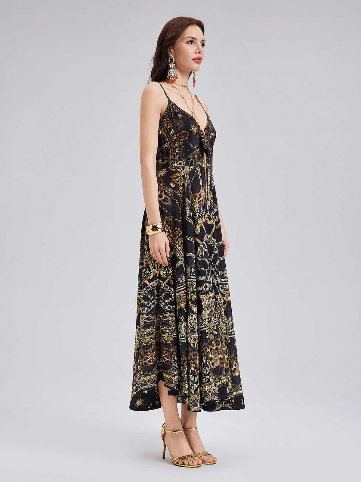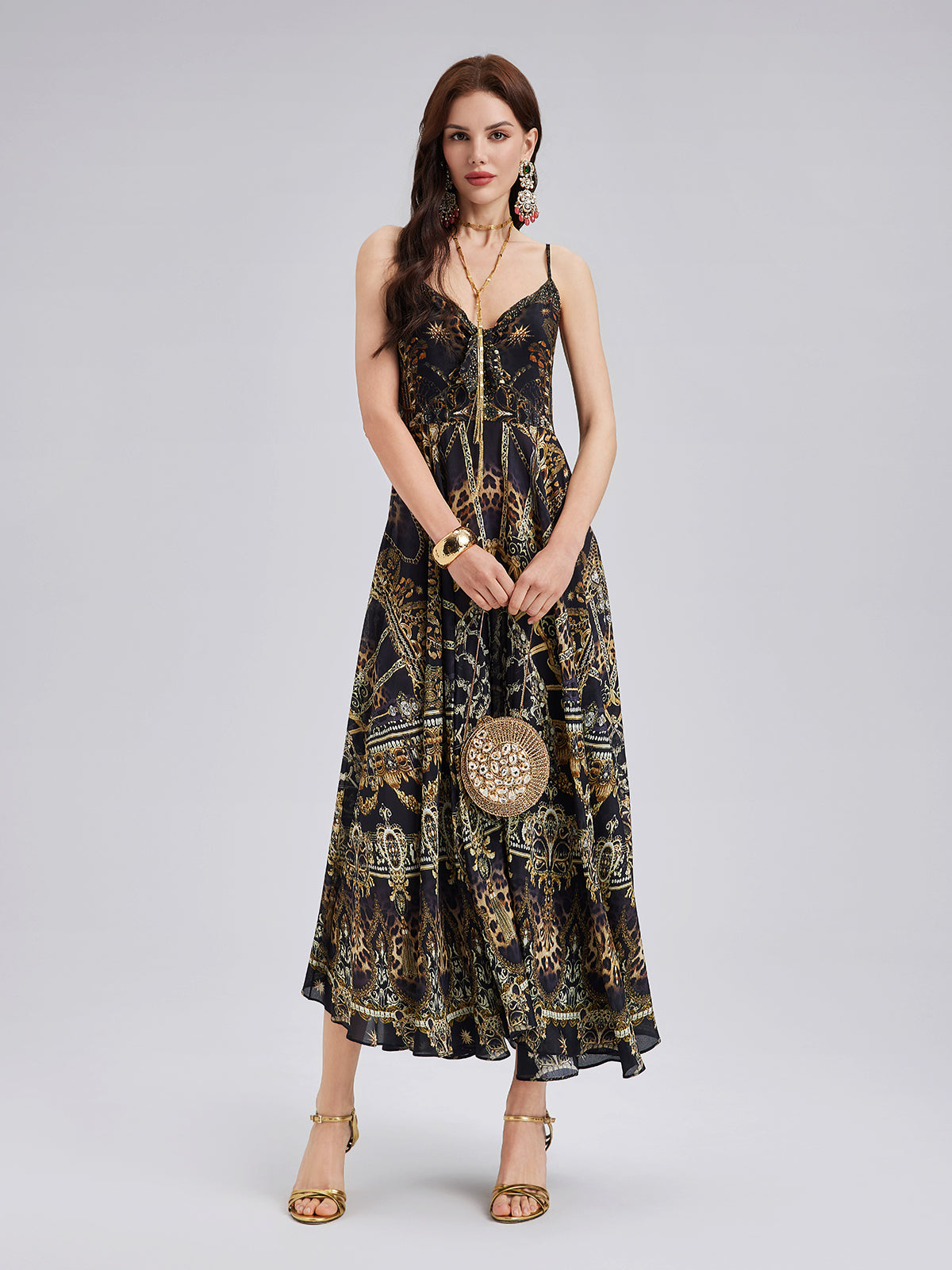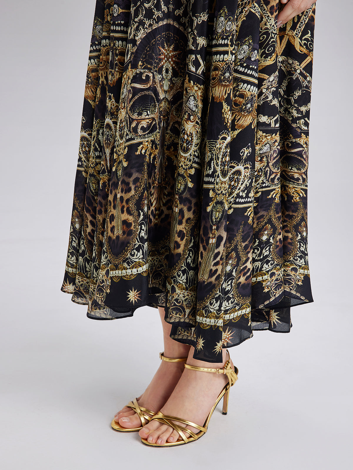 Made from luxurious silk with an intricate Baroque print, this dress is soft, breathable, and elegantly refined. A cinched waist enhances the silhouette, while delicate rhinestone embellishments at the neckline add a touch of sparkle and sophistication.
