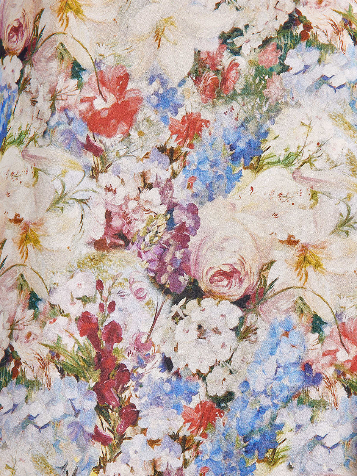 This dress blends printed silk organza with lace panels, evoking the ethereal beauty of clouds and blooms woven into fabric. A silk camisole underneath ensures gentle luxury, while the back zip allows effortless dressing. Lace-trimmed seams add a polished touch, and the voluminous skirt flows gracefully with every step.