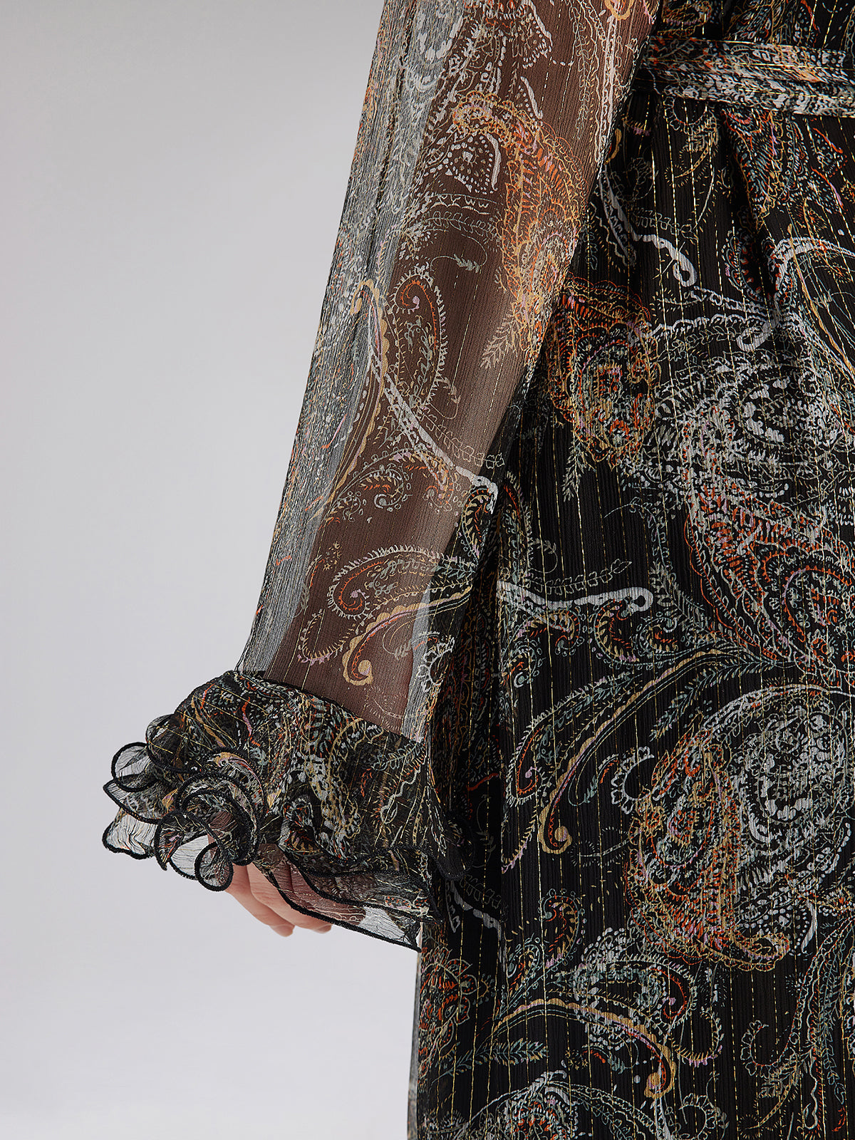 Premium mulberry silk offers a soft feel, natural sheen, and elegant drape. Loose A-line fit suits all body types. V-neckline flatters the face and neck. Ruffled collar and sleeves add airy charm, with hand-rolled floral ruffles for refined detail. (Includes stretchy knit slip and matching fabric belt.)