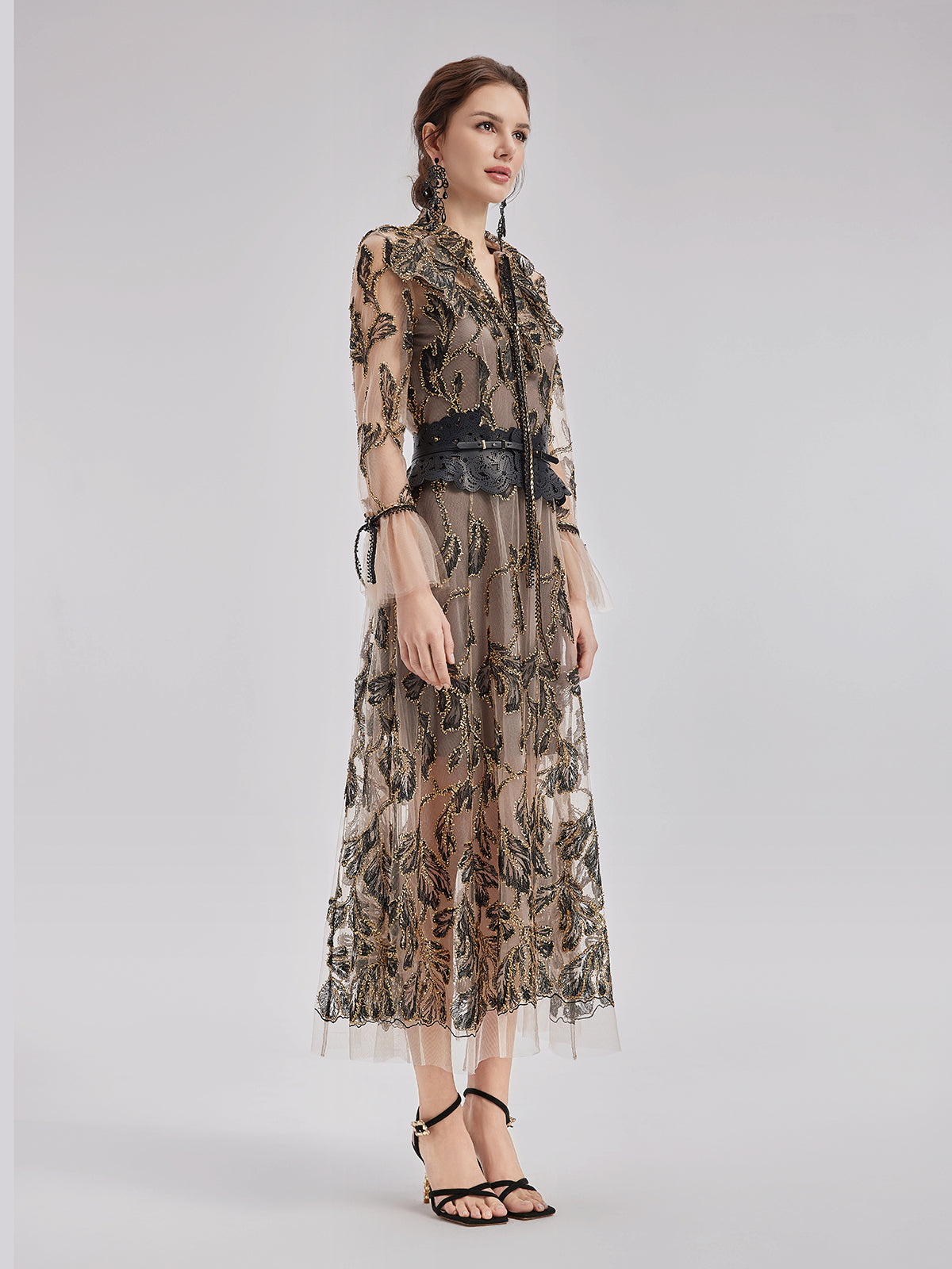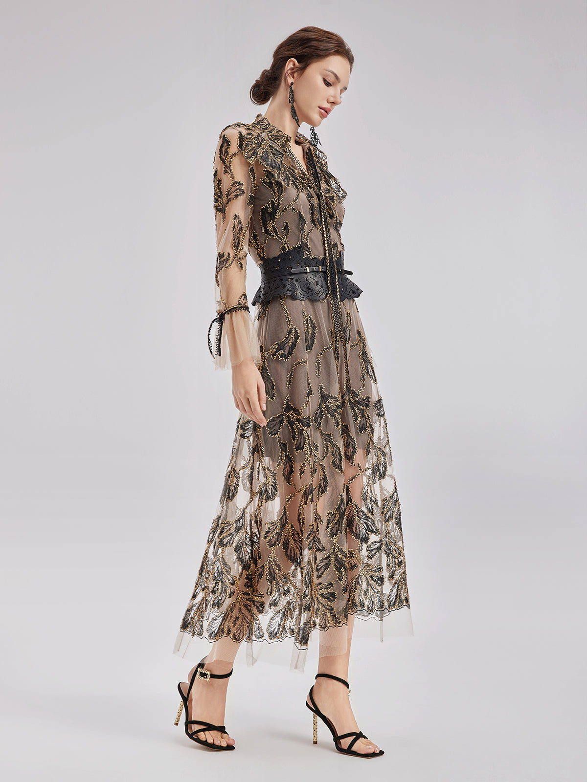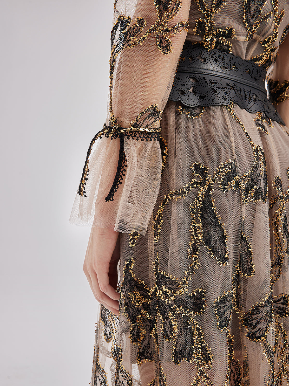 Handwoven chain details with floral patterns enhance the dress’s 3D effect. Gold and black embroidery adds luxury, while the sheer mesh design exudes elegance. The flowing skirt and tassel cuffs offer grace and movement, perfect for any formal occasion.
