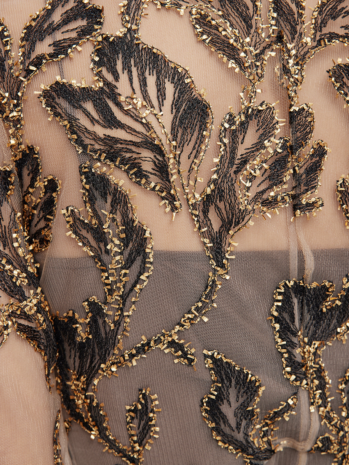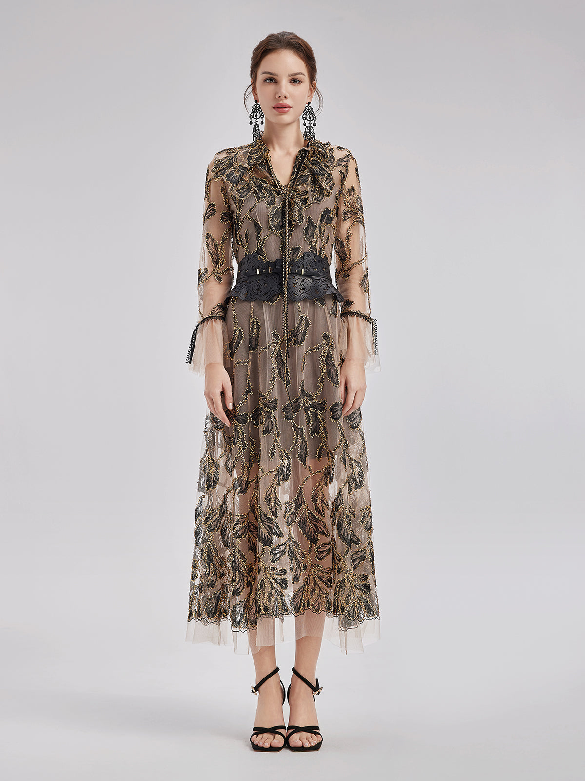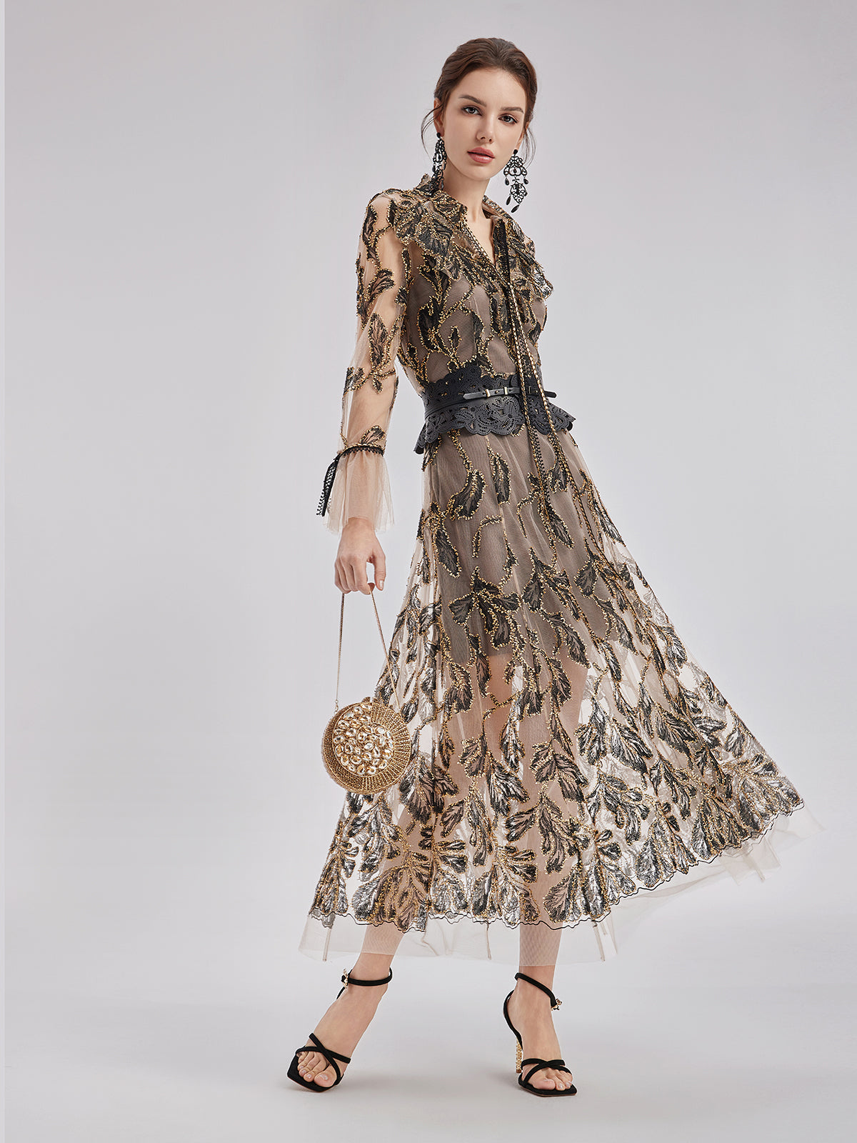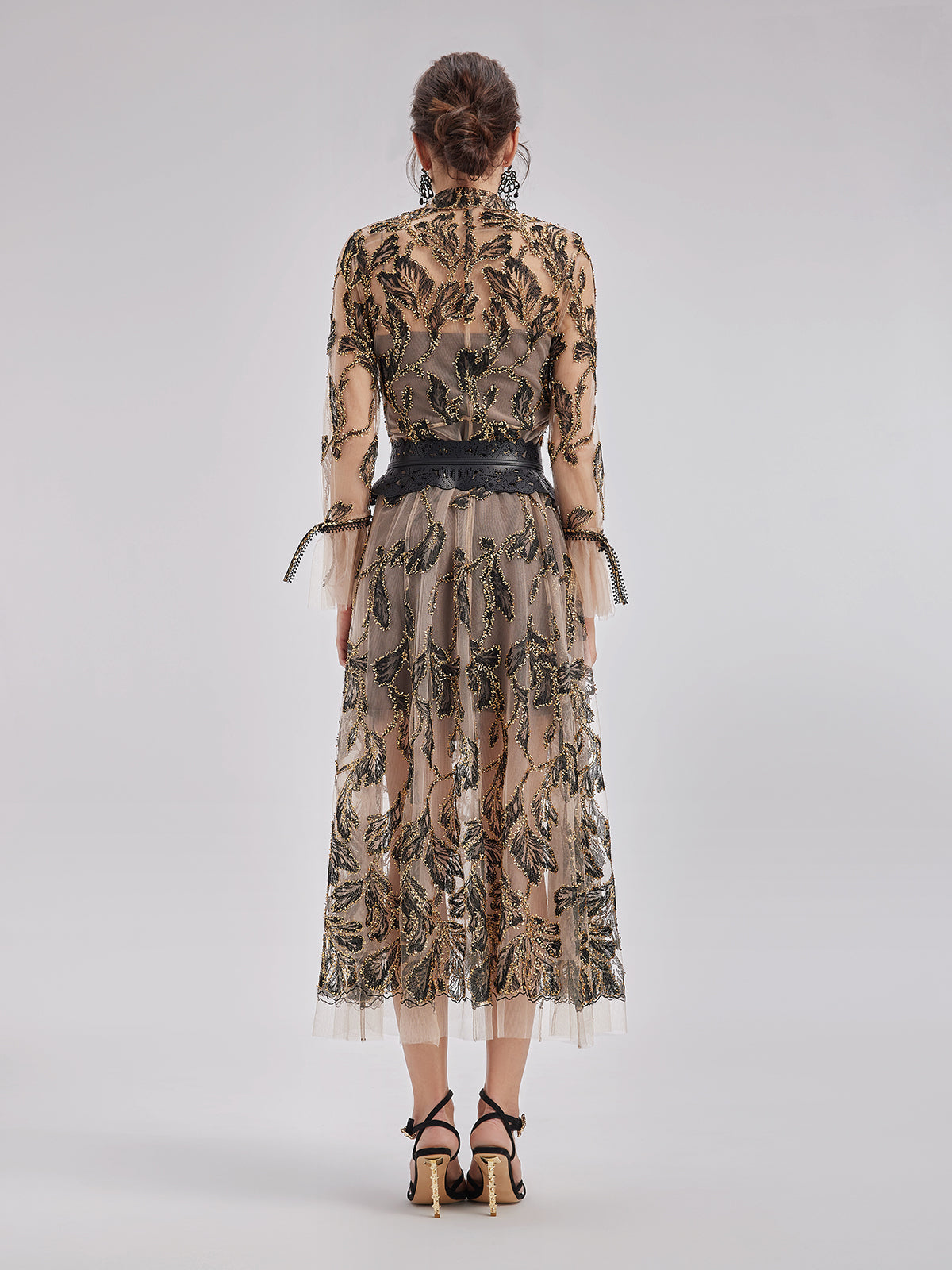 Handwoven chain details with floral patterns enhance the dress’s 3D effect. Gold and black embroidery adds luxury, while the sheer mesh design exudes elegance. The flowing skirt and tassel cuffs offer grace and movement, perfect for any formal occasion.