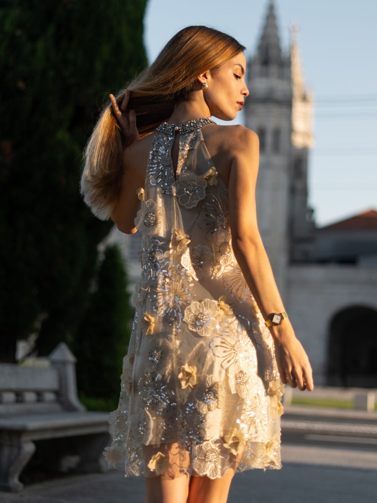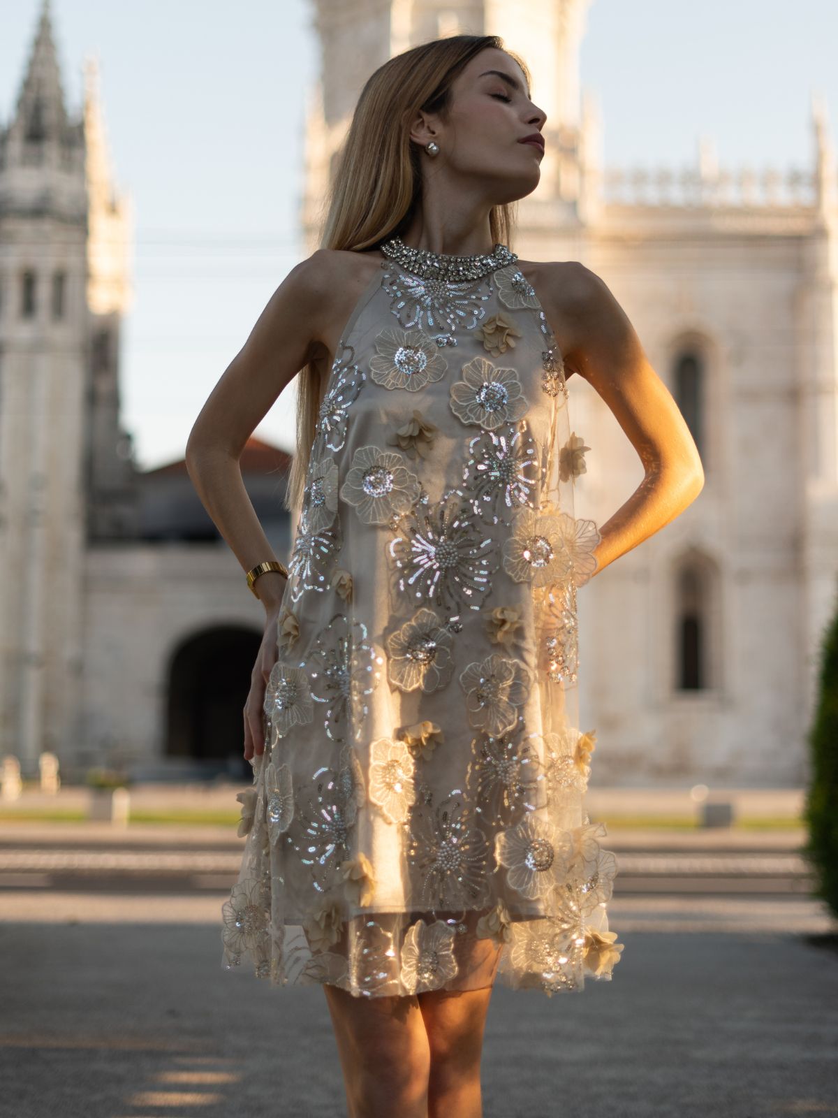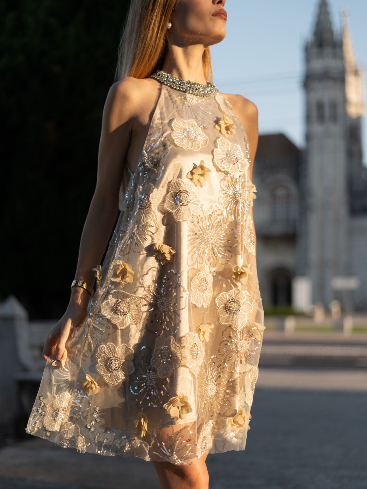 Adorned with luxurious floral embroidery and 3D flowers, this dress adds depth and movement. The A-line silhouette and high neckline with crystal details enhance its sweet, elegant, and luxurious appeal, perfect for formal occasions.