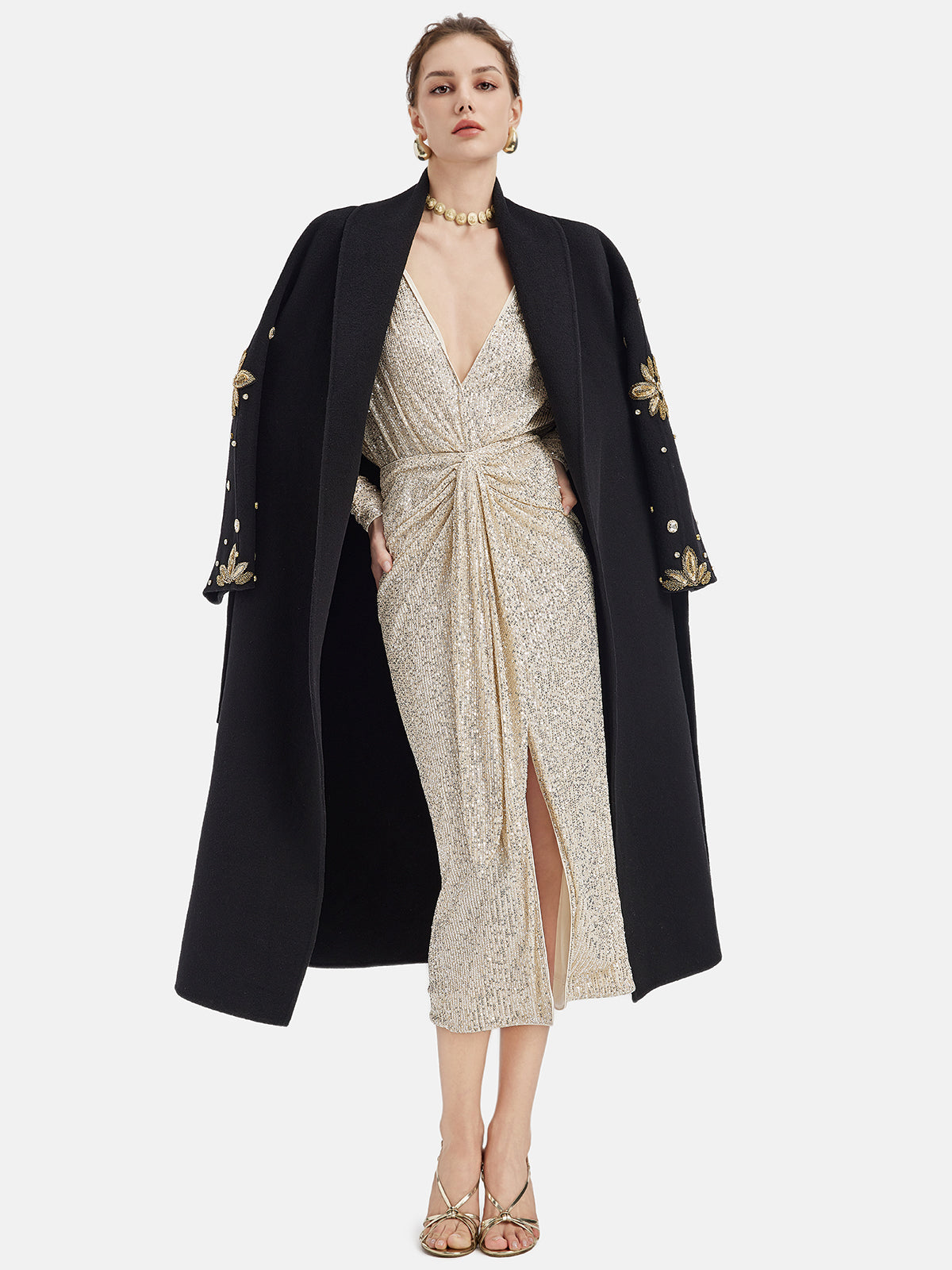 This dress features a shimmering fabric that reflects dazzling light, making it perfect for parties and formal events. The deep V-neck showcases the elegant neckline, adding a touch of allure, while the high slit enhances movement and highlights the legs for a sexy yet sophisticated look.