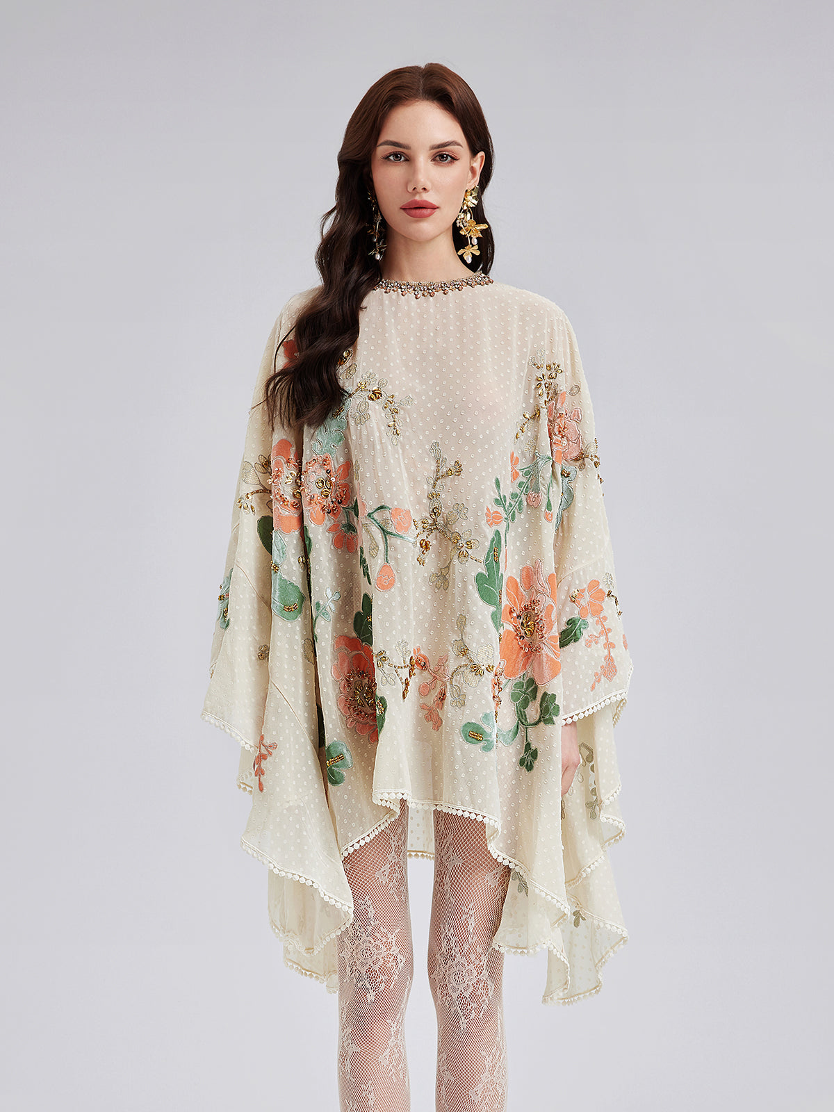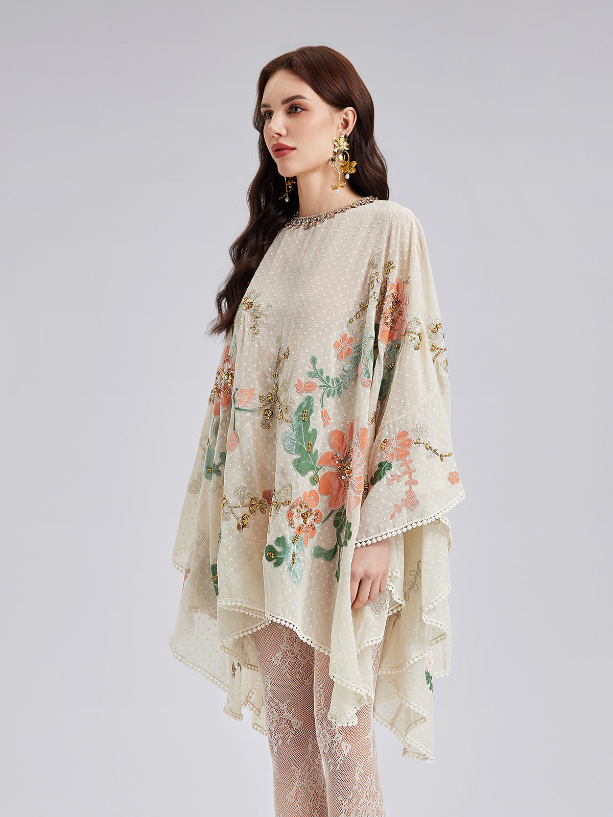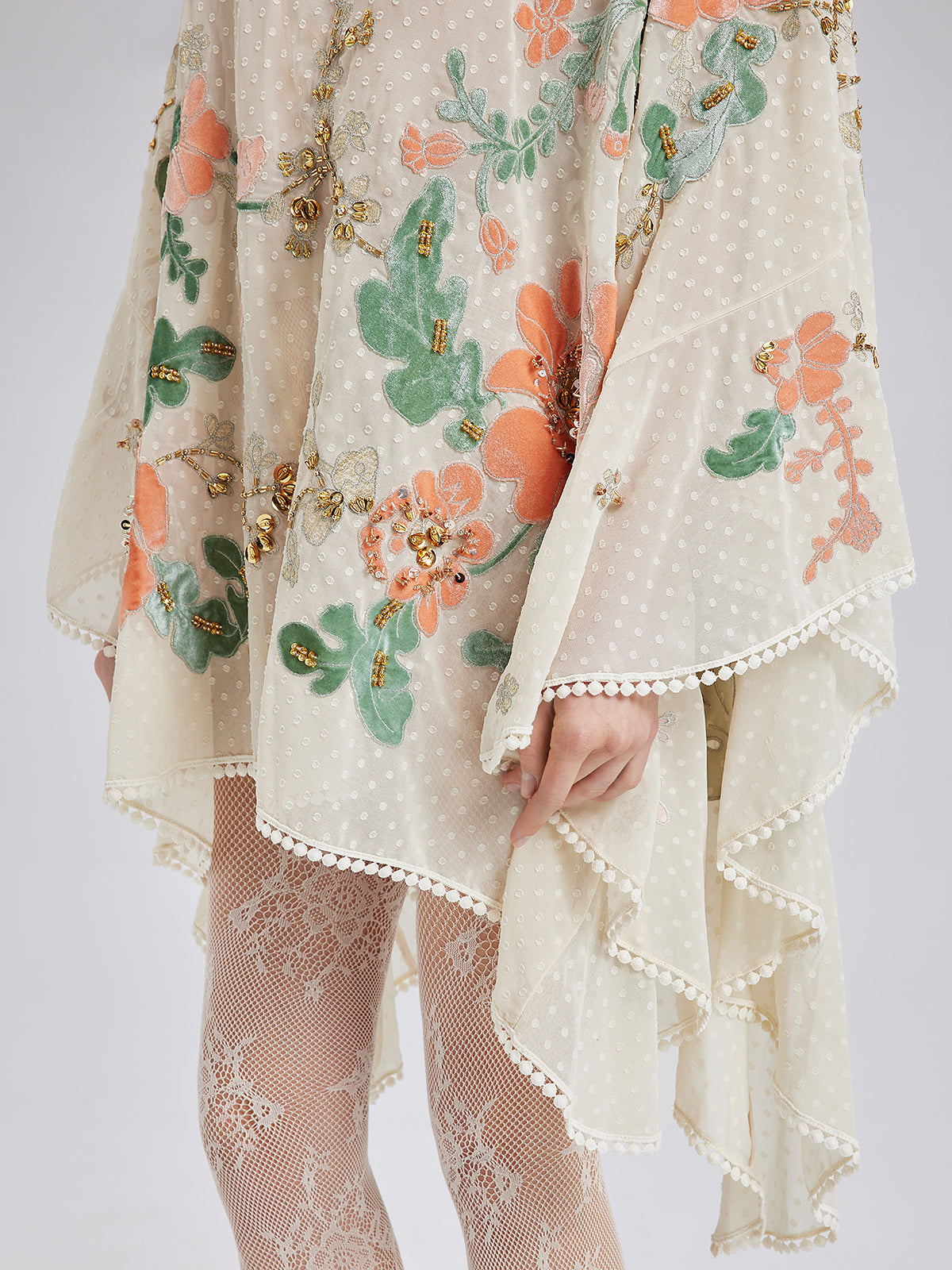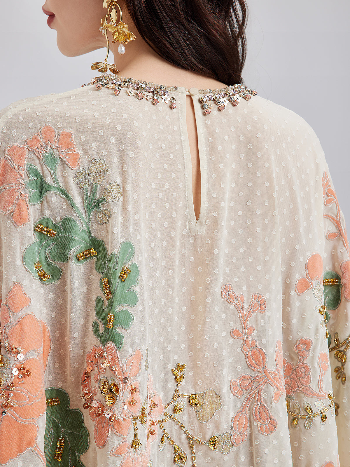 Intricate embroidery and hand-sewn beads create a rich, layered design with vibrant colors. A beaded neckline adds a luxe touch, while the asymmetrical hemline brings movement and modernity. Crafted from premium fabric for both elegance and comfort.