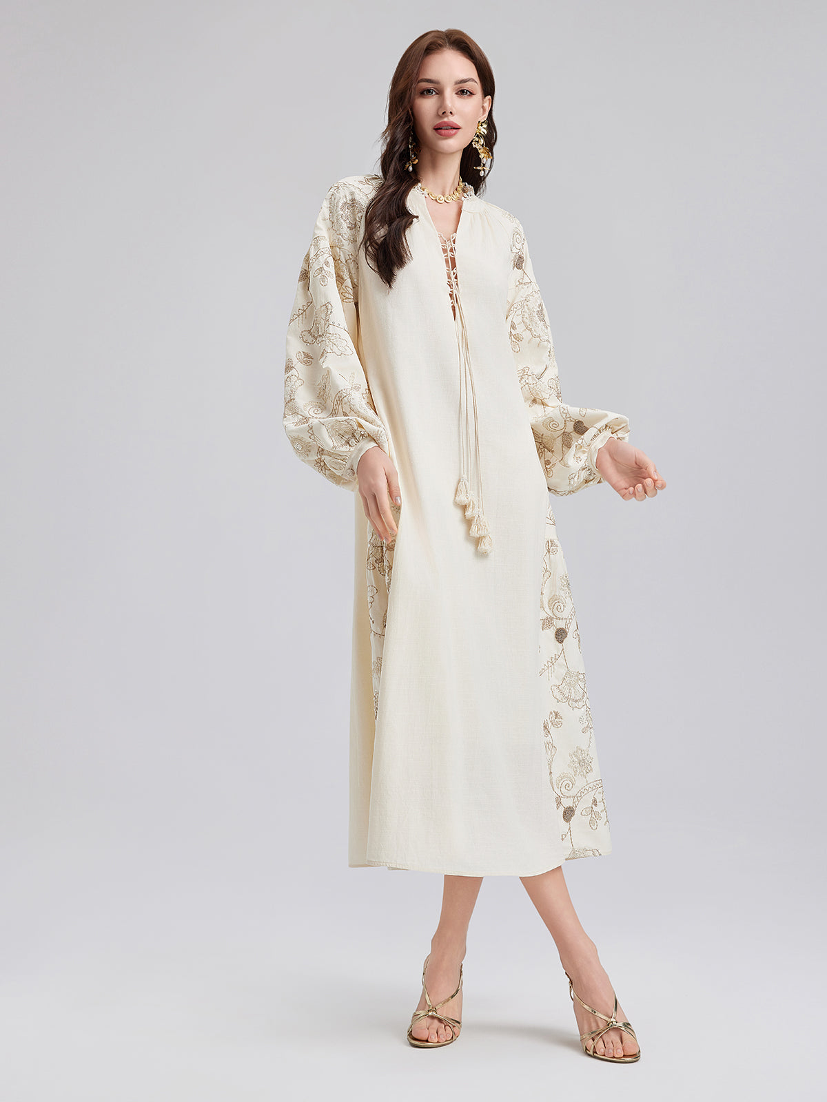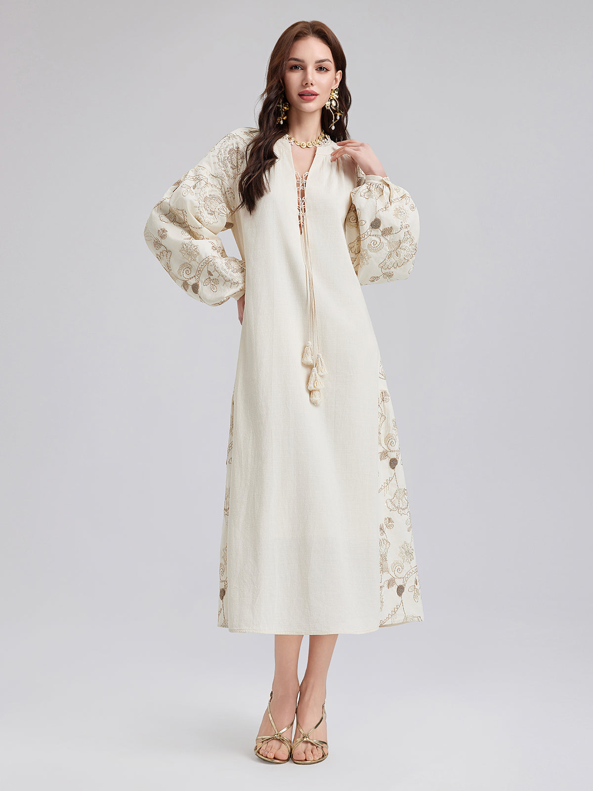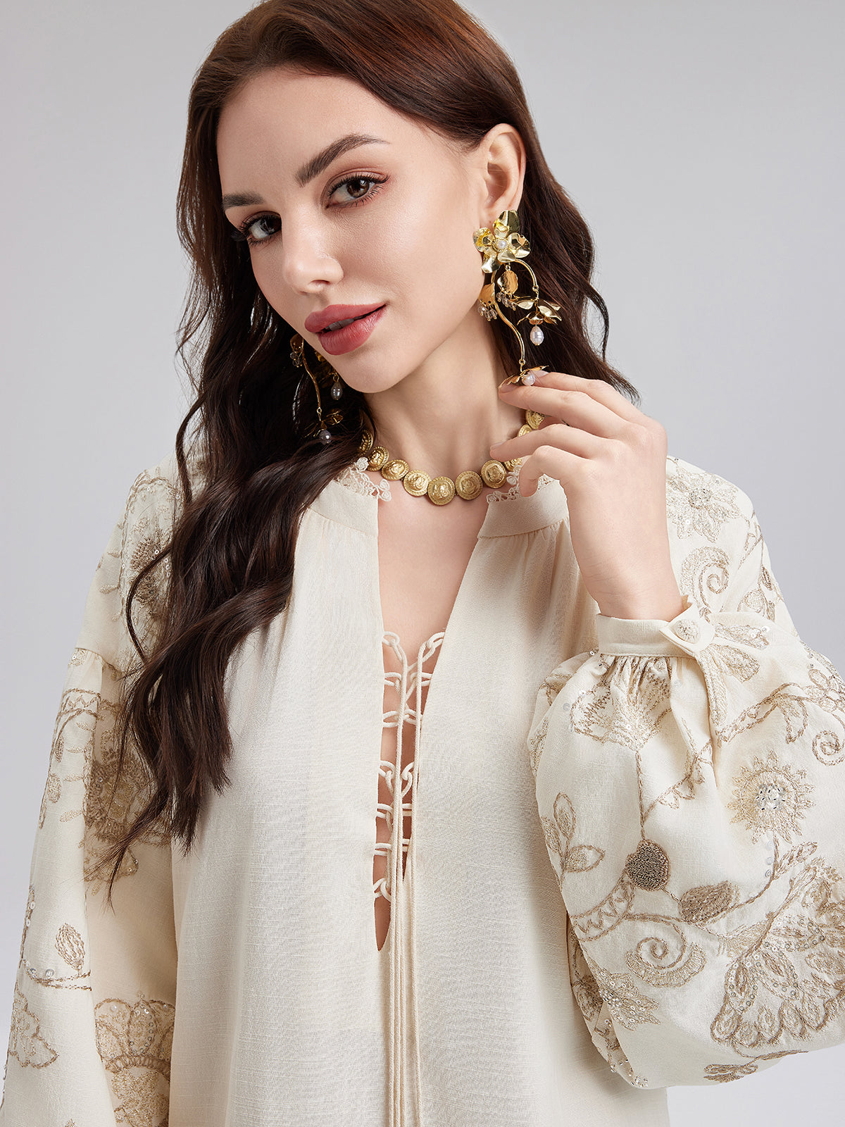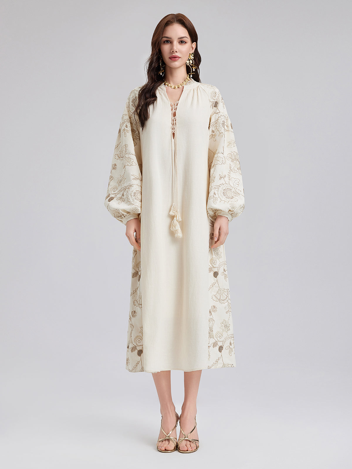Made from premium cotton, it’s soft and sweat-absorbent.The luxurious silk lining feels smooth and keeps you cool. The sleeves and body are adorned with delicate floral thread embroidery. The loose A-line suits all body types, and the neckline includes an adjustable tie design.