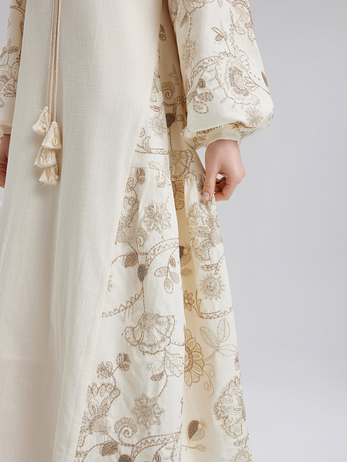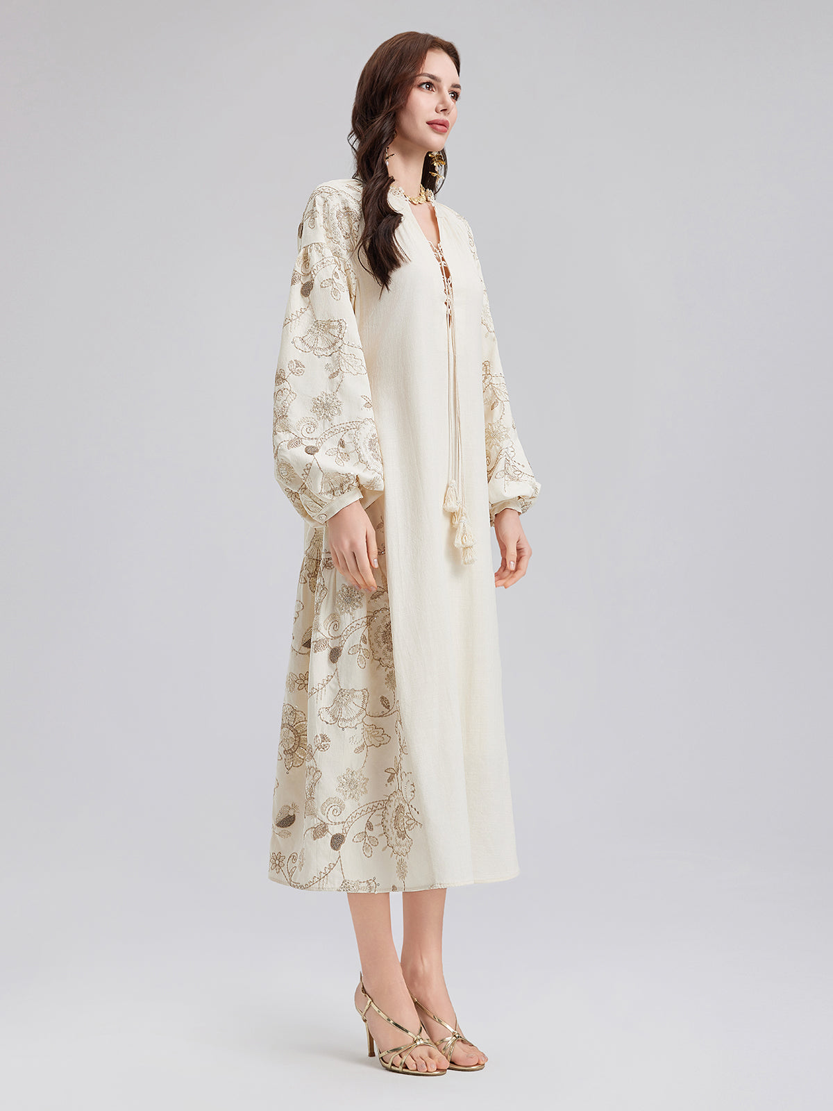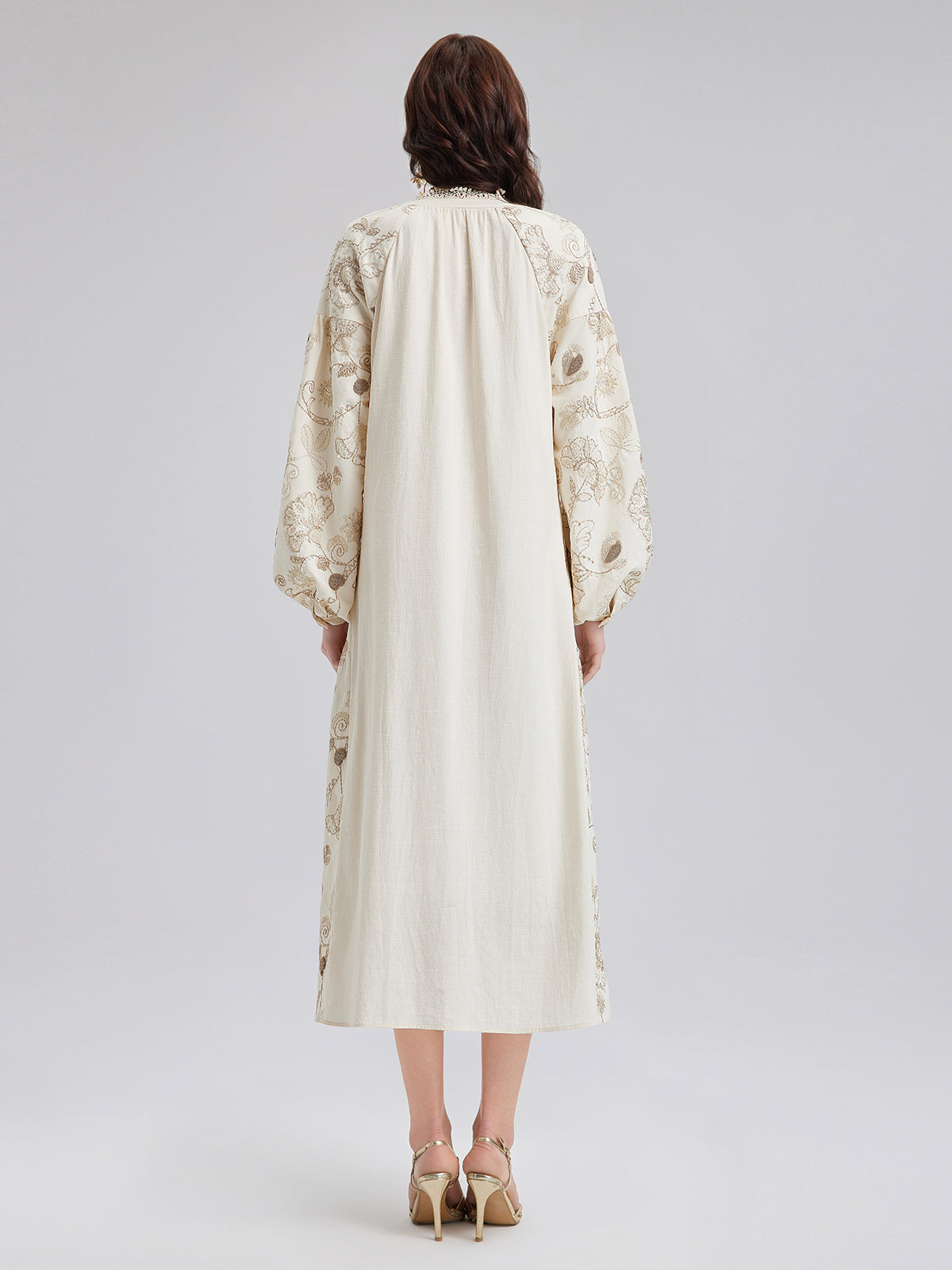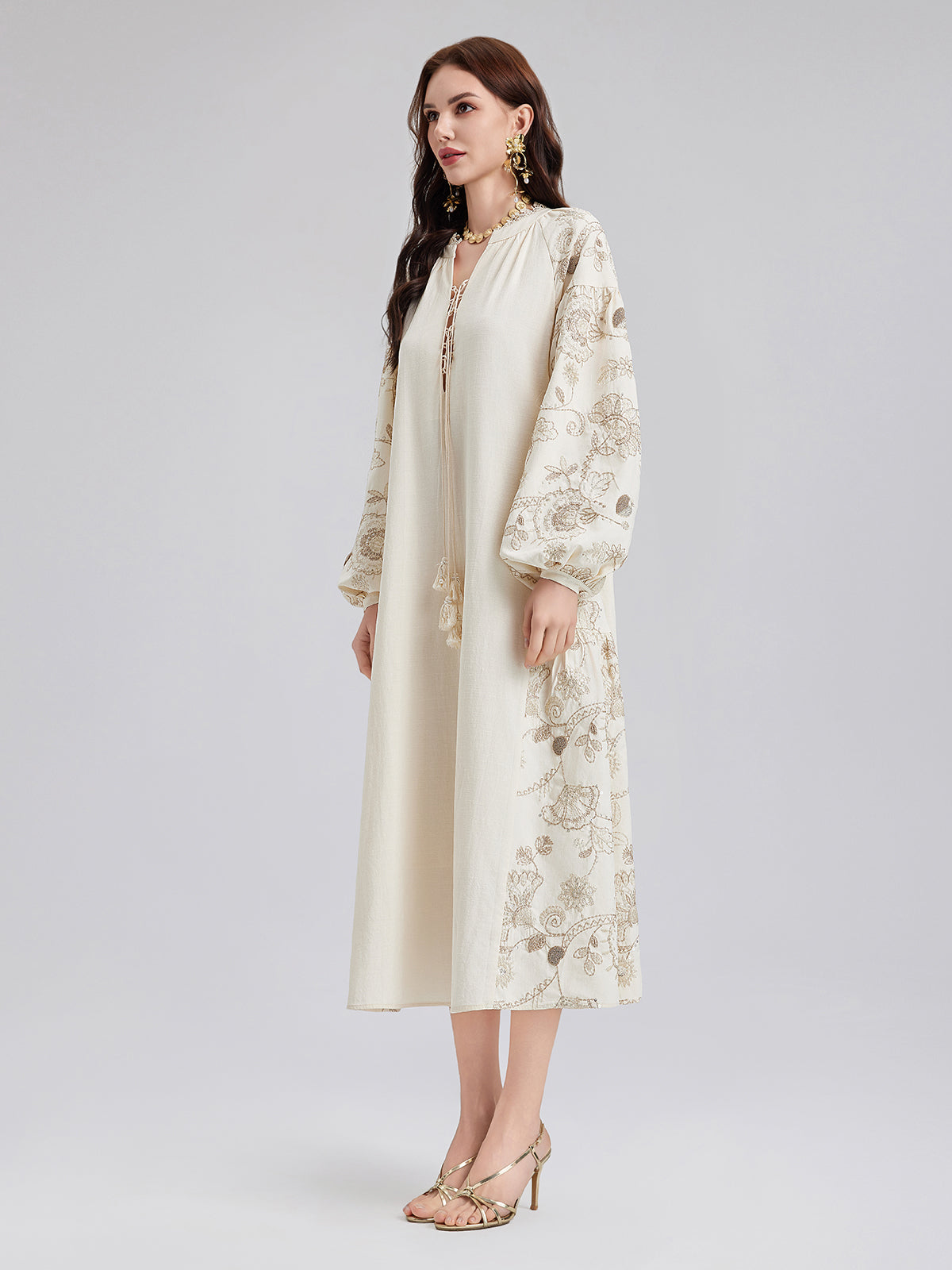 Made from premium cotton, it’s soft and sweat-absorbent.The luxurious silk lining feels smooth and keeps you cool. The sleeves and body are adorned with delicate floral thread embroidery. The loose A-line suits all body types, and the neckline includes an adjustable tie design.