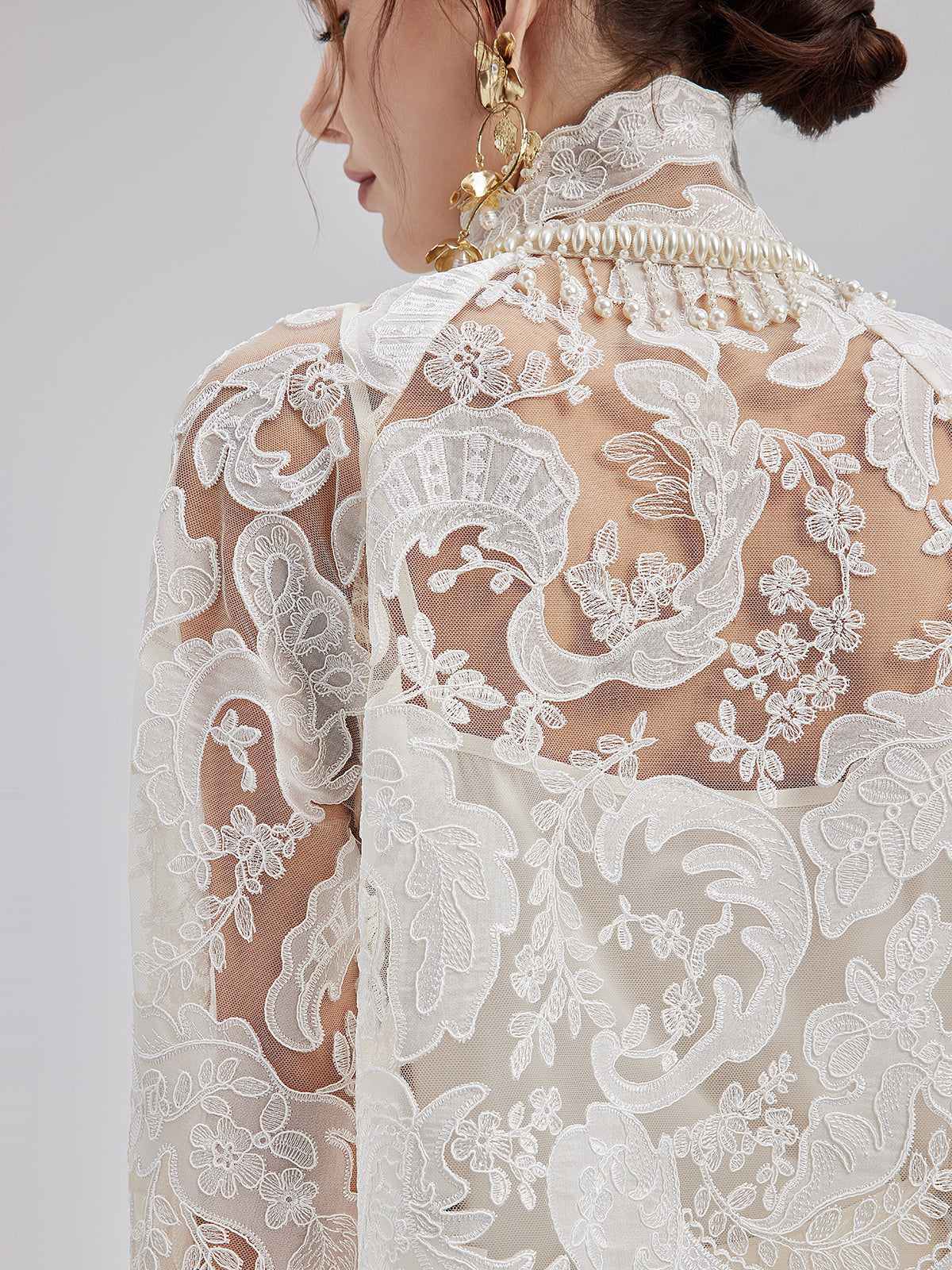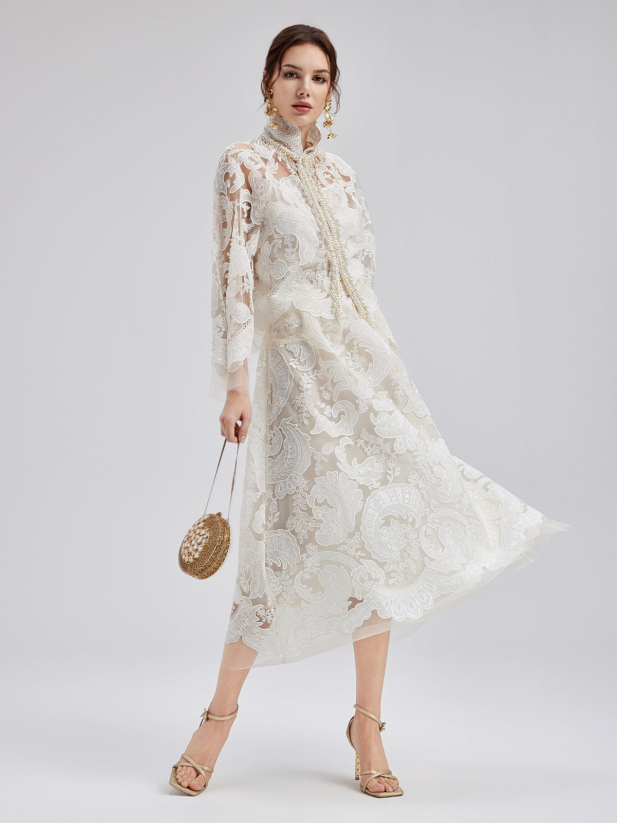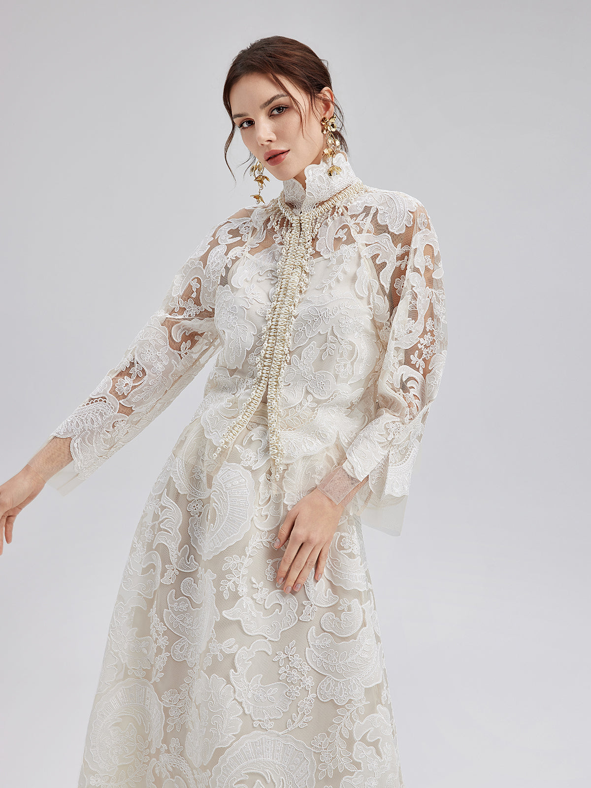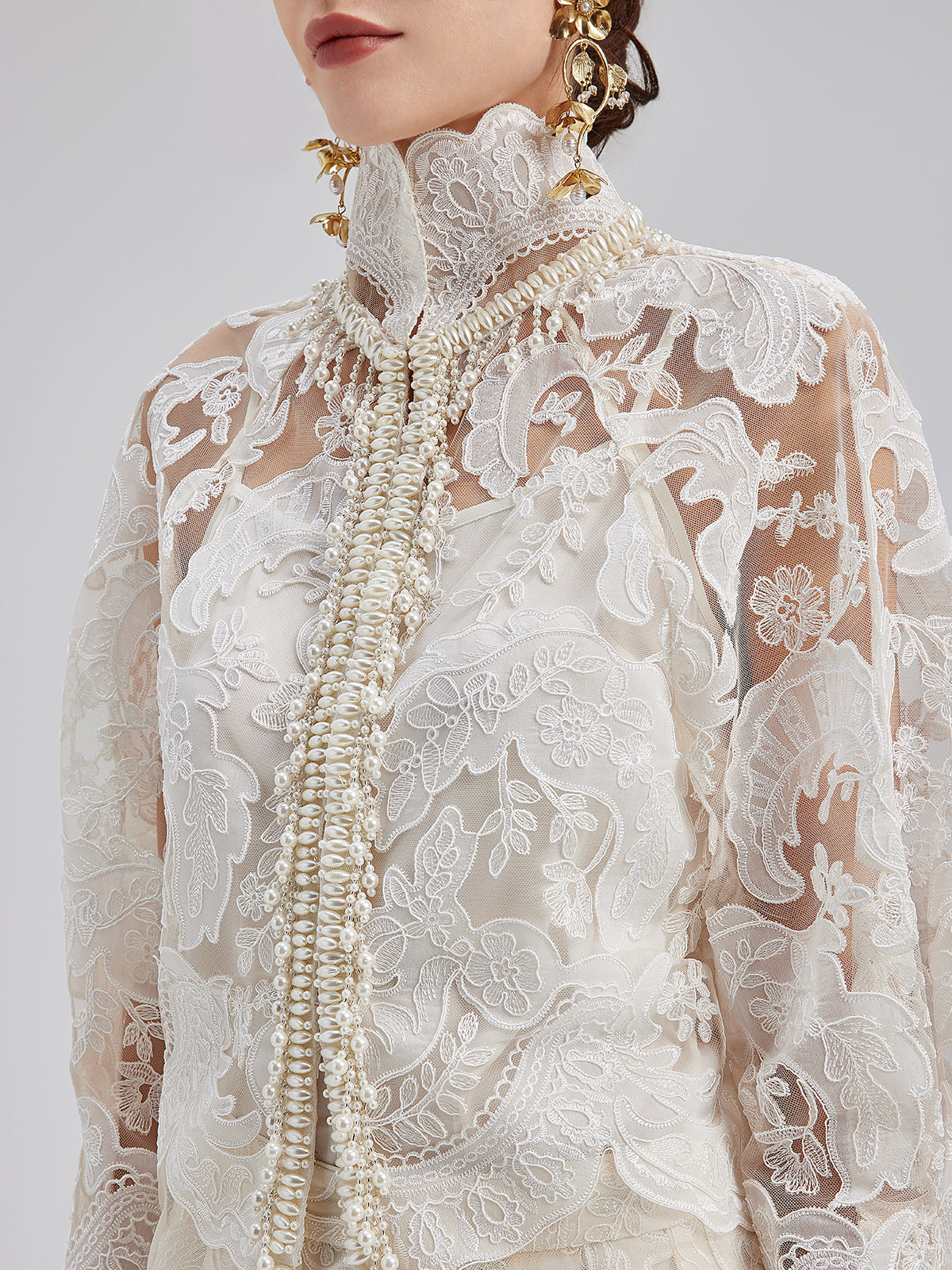 This elegant dress set features intricate embroidered lace, soft and delicate to the touch, exuding French romanticism. The high-neck design with sculpted pleats and pearl tassels adds vintage flair. Lightweight and sheer, it showcases feminine charm while maintaining sophistication, perfect for weddings or elegant events.