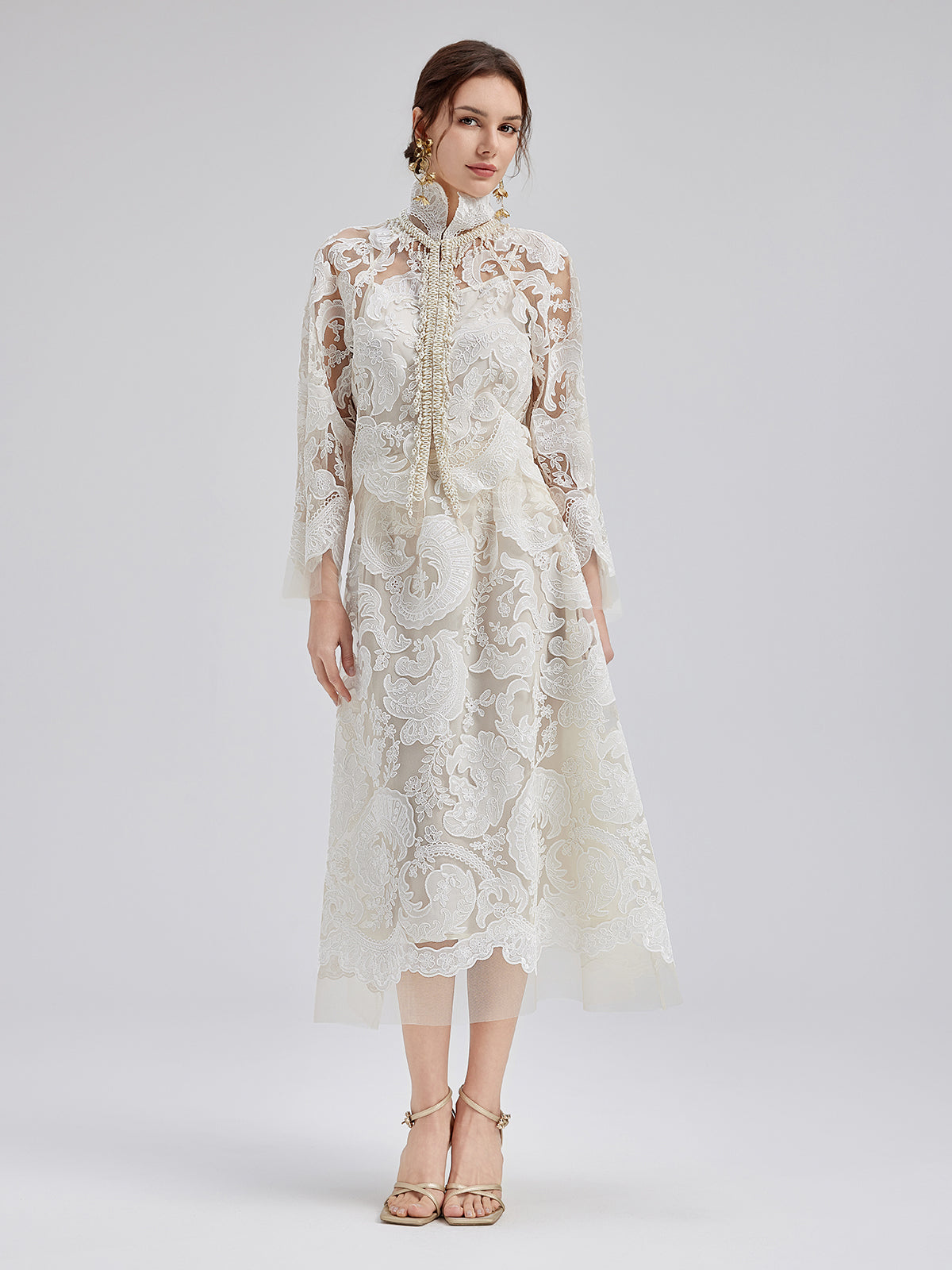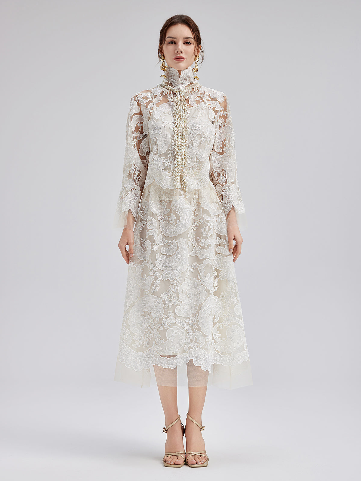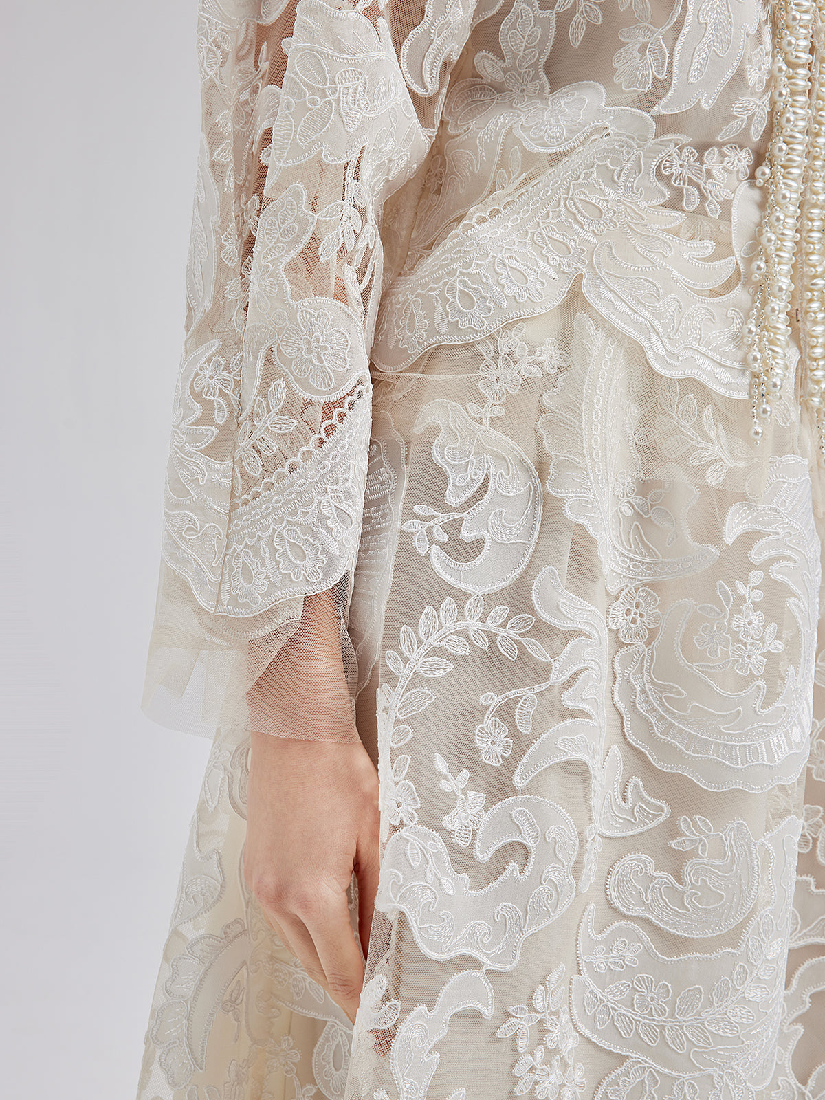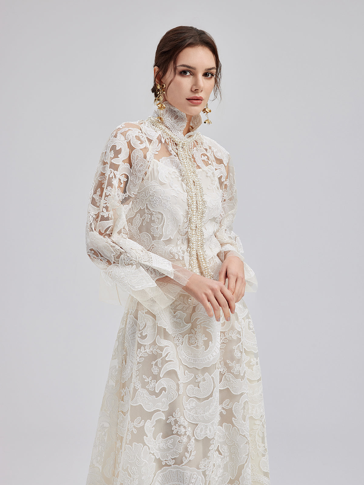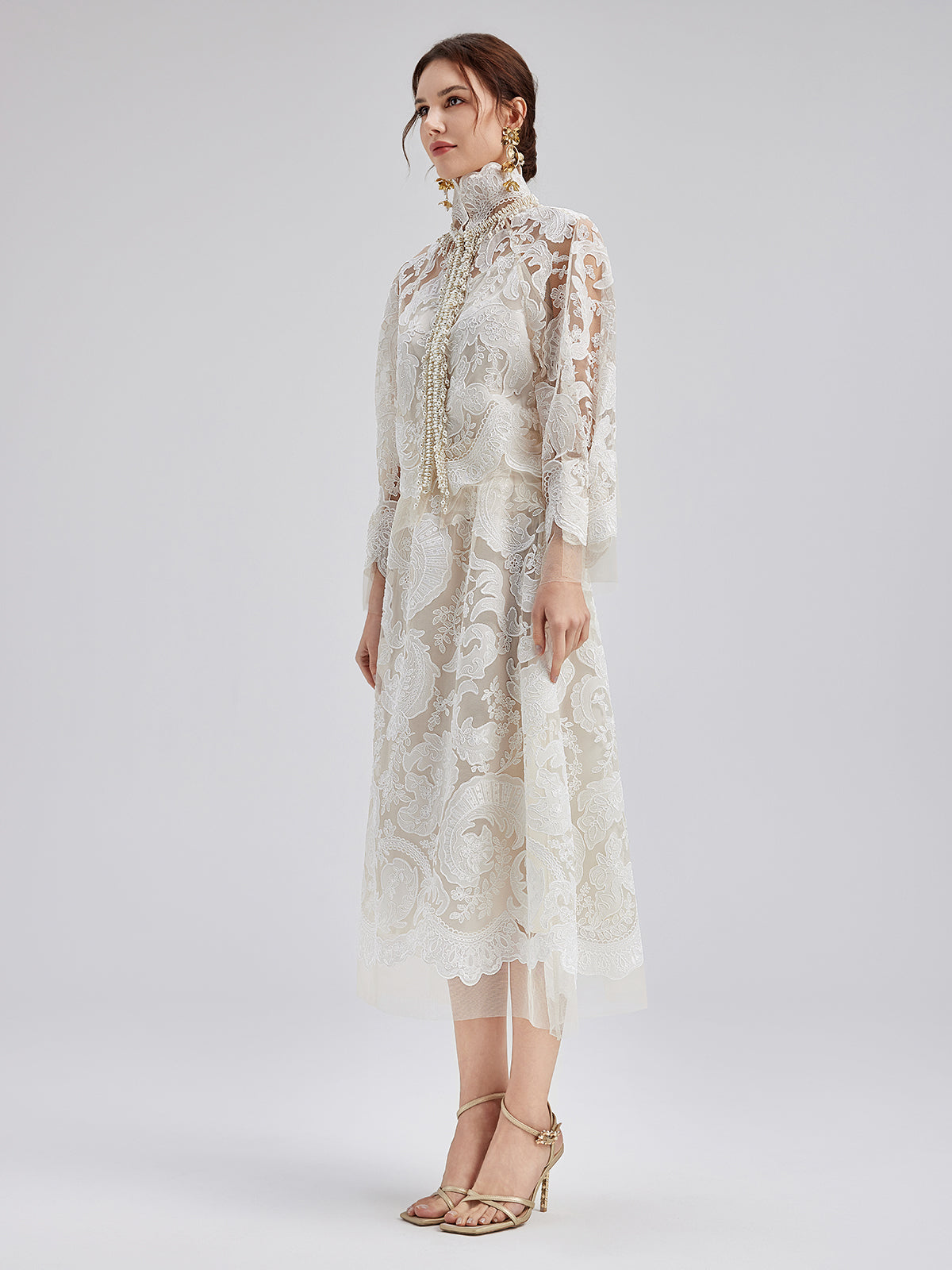 This elegant dress set features intricate embroidered lace, soft and delicate to the touch, exuding French romanticism. The high-neck design with sculpted pleats and pearl tassels adds vintage flair. Lightweight and sheer, it showcases feminine charm while maintaining sophistication, perfect for weddings or elegant events.