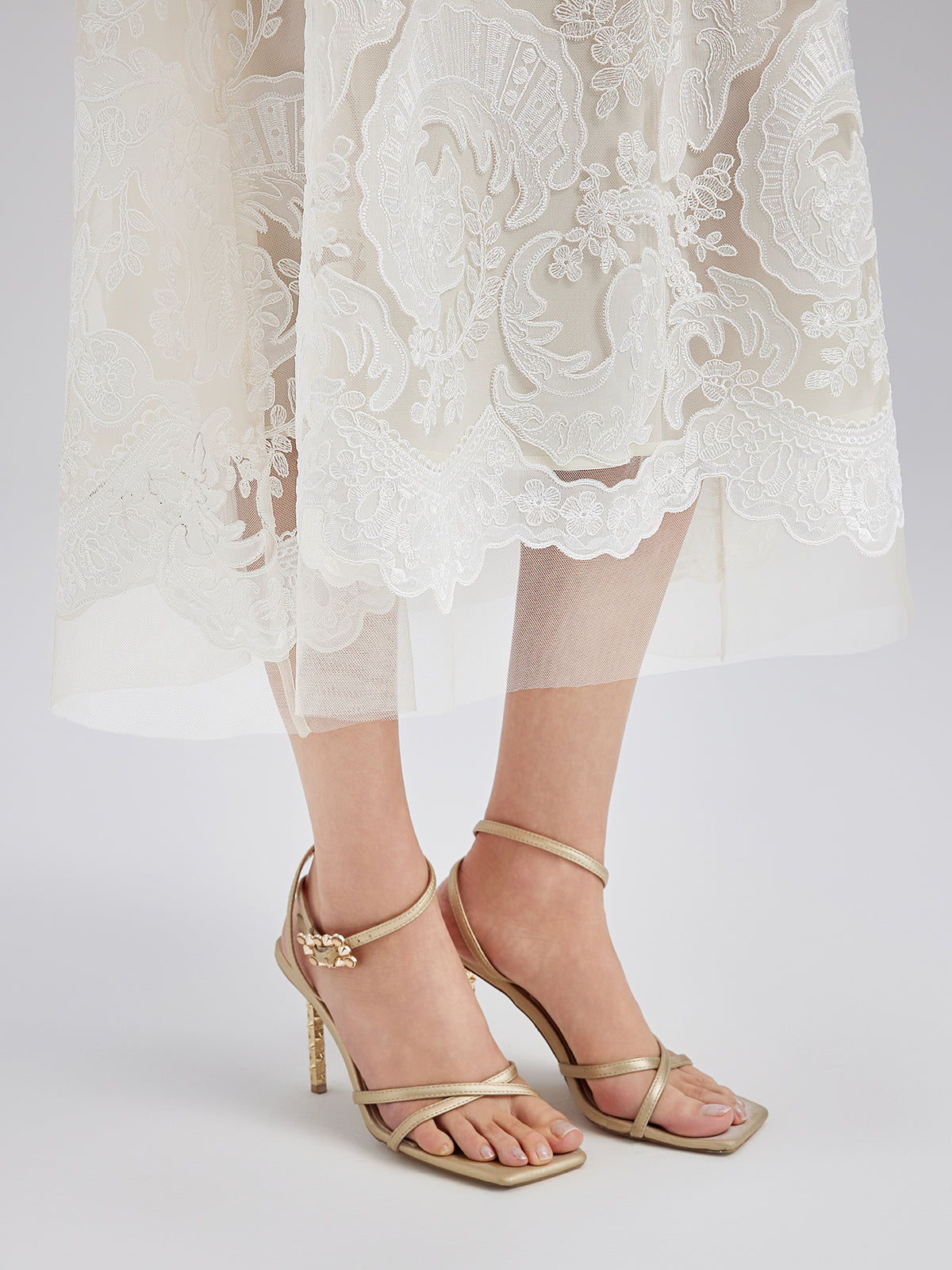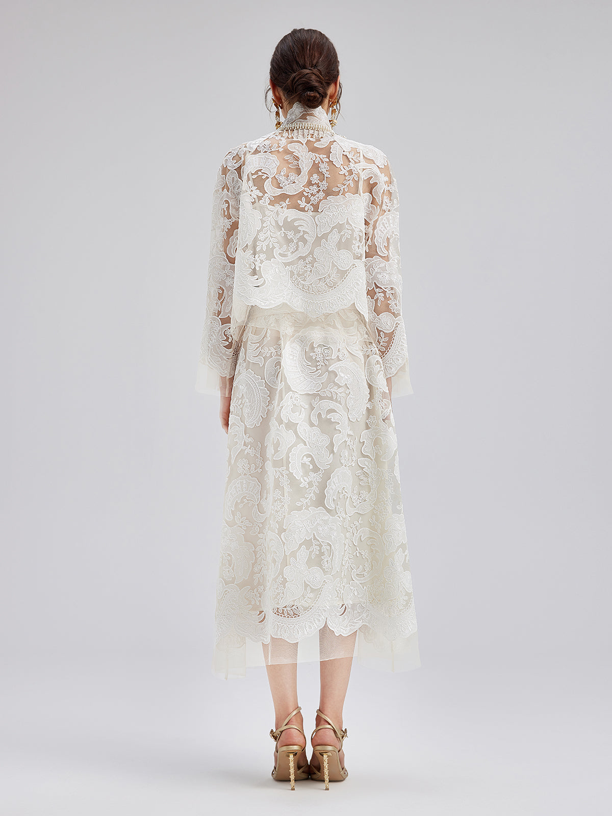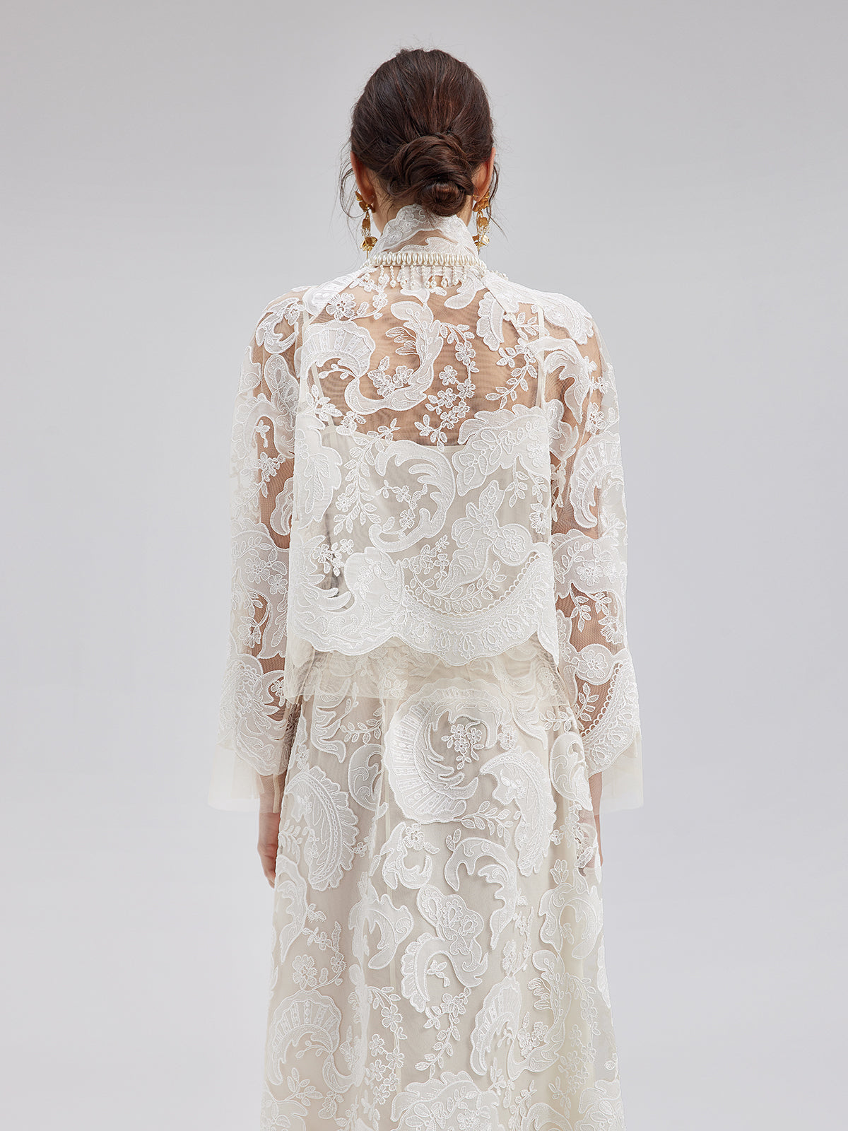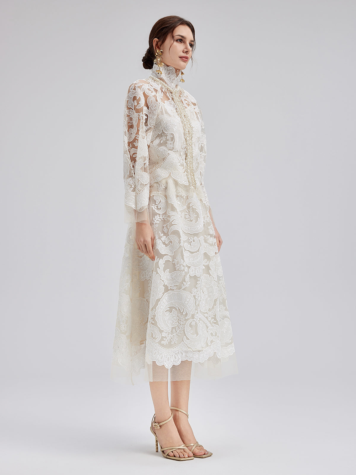 This elegant dress set features intricate embroidered lace, soft and delicate to the touch, exuding French romanticism. The high-neck design with sculpted pleats and pearl tassels adds vintage flair. Lightweight and sheer, it showcases feminine charm while maintaining sophistication, perfect for weddings or elegant events.