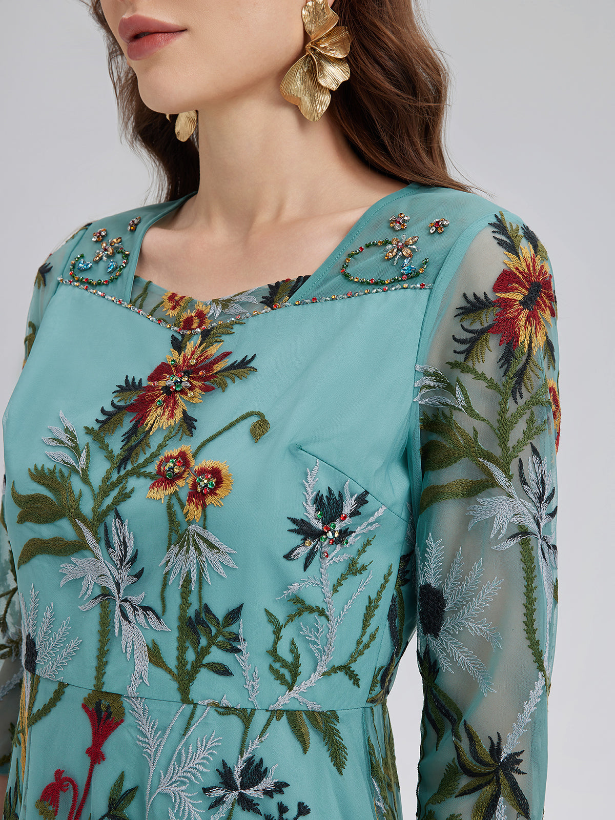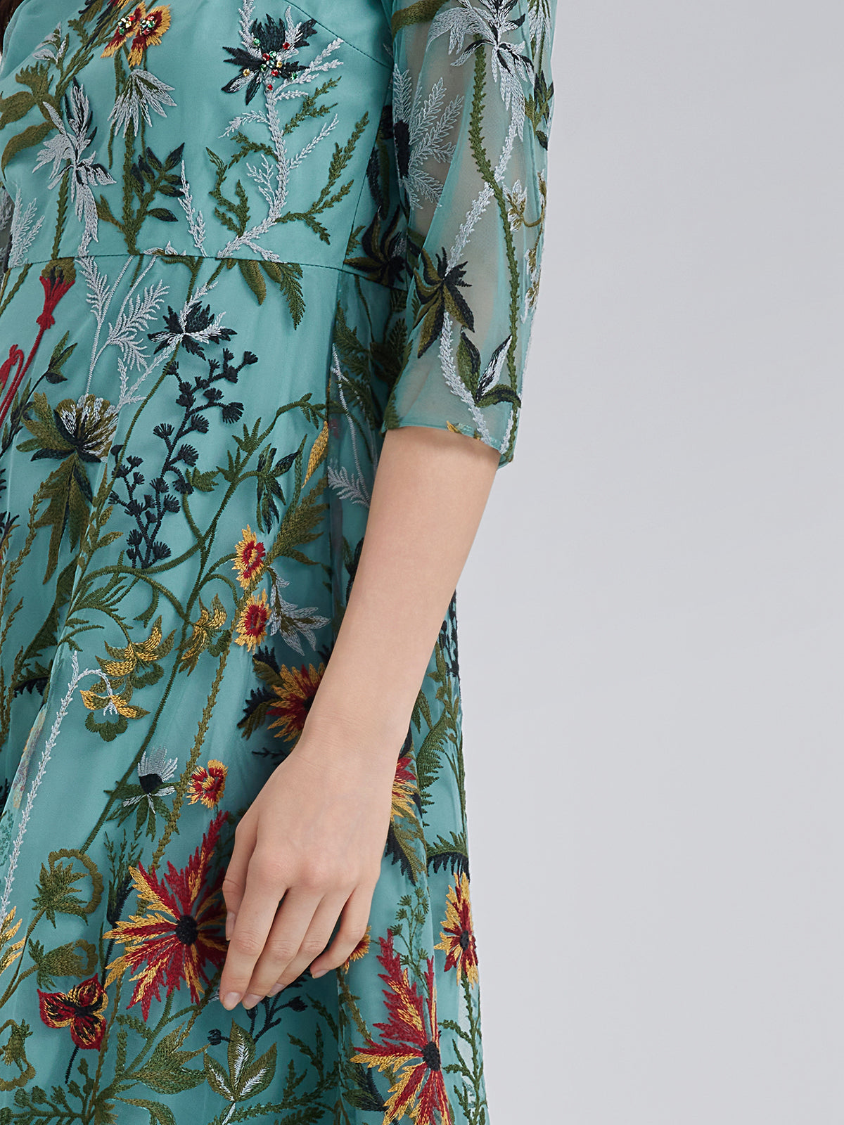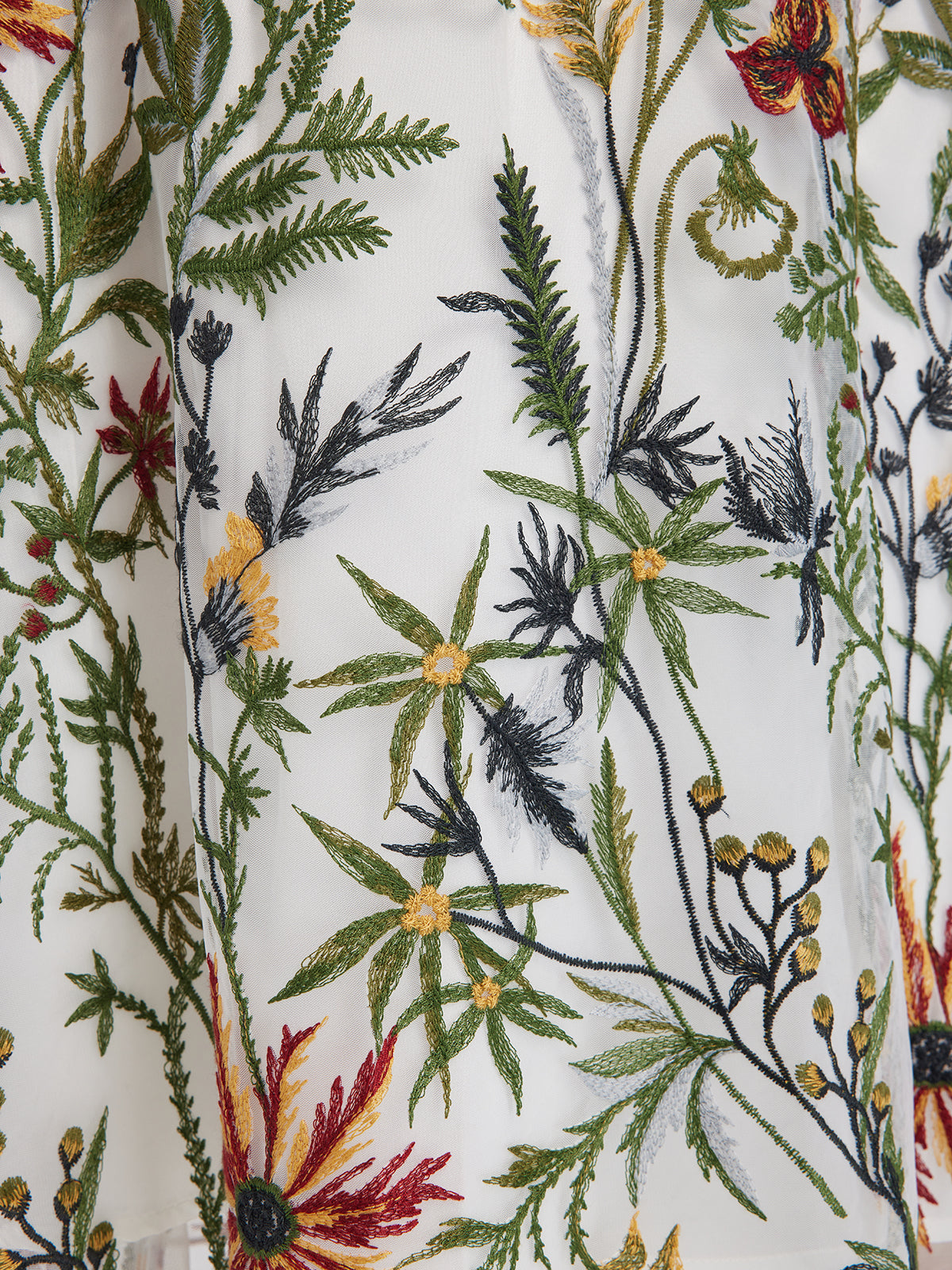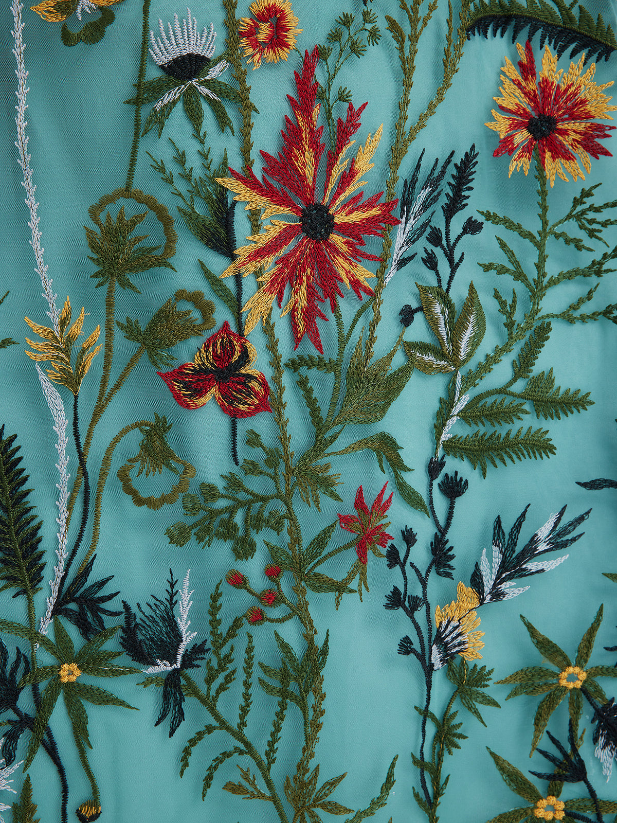 Detailed floral and botanical embroidery adds rich texture and dimension. Tailored for a flattering fit that enhances the silhouette while remaining comfortable. The neckline is hand-finished with beaded accents for a refined, sculptural touch.