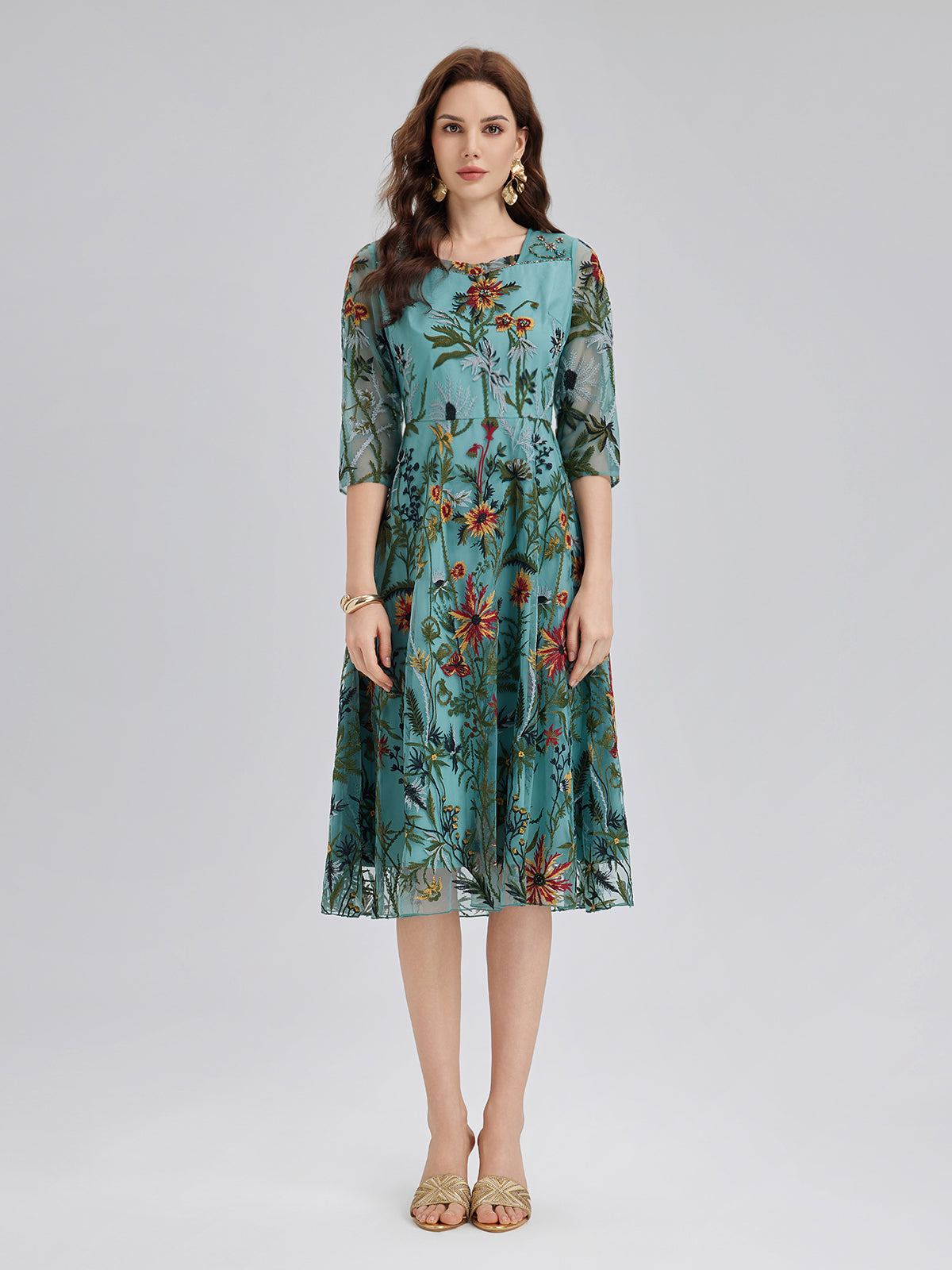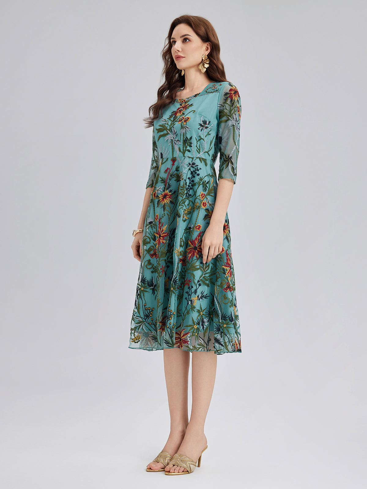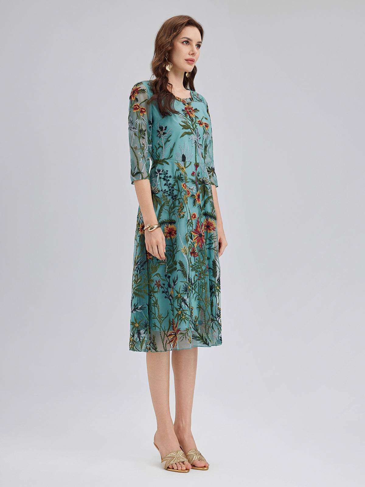 Detailed floral and botanical embroidery adds rich texture and dimension. Tailored for a flattering fit that enhances the silhouette while remaining comfortable. The neckline is hand-finished with beaded accents for a refined, sculptural touch.
