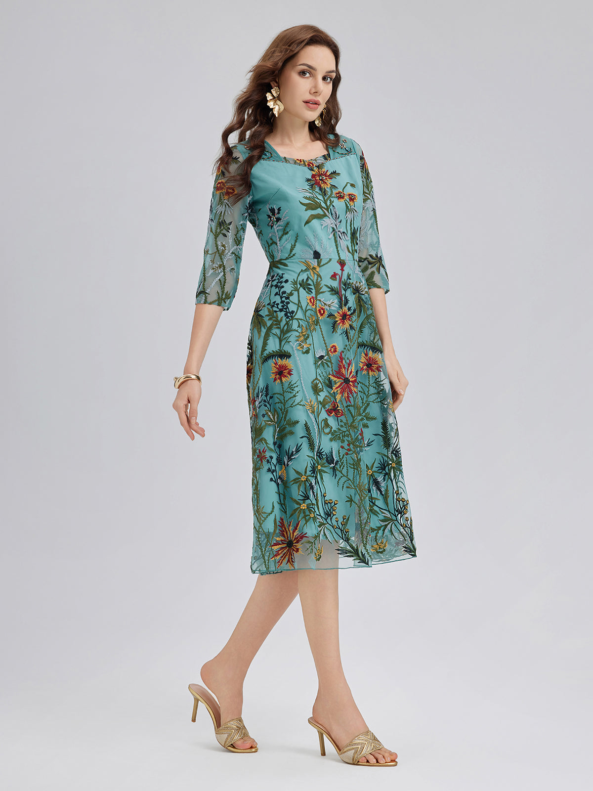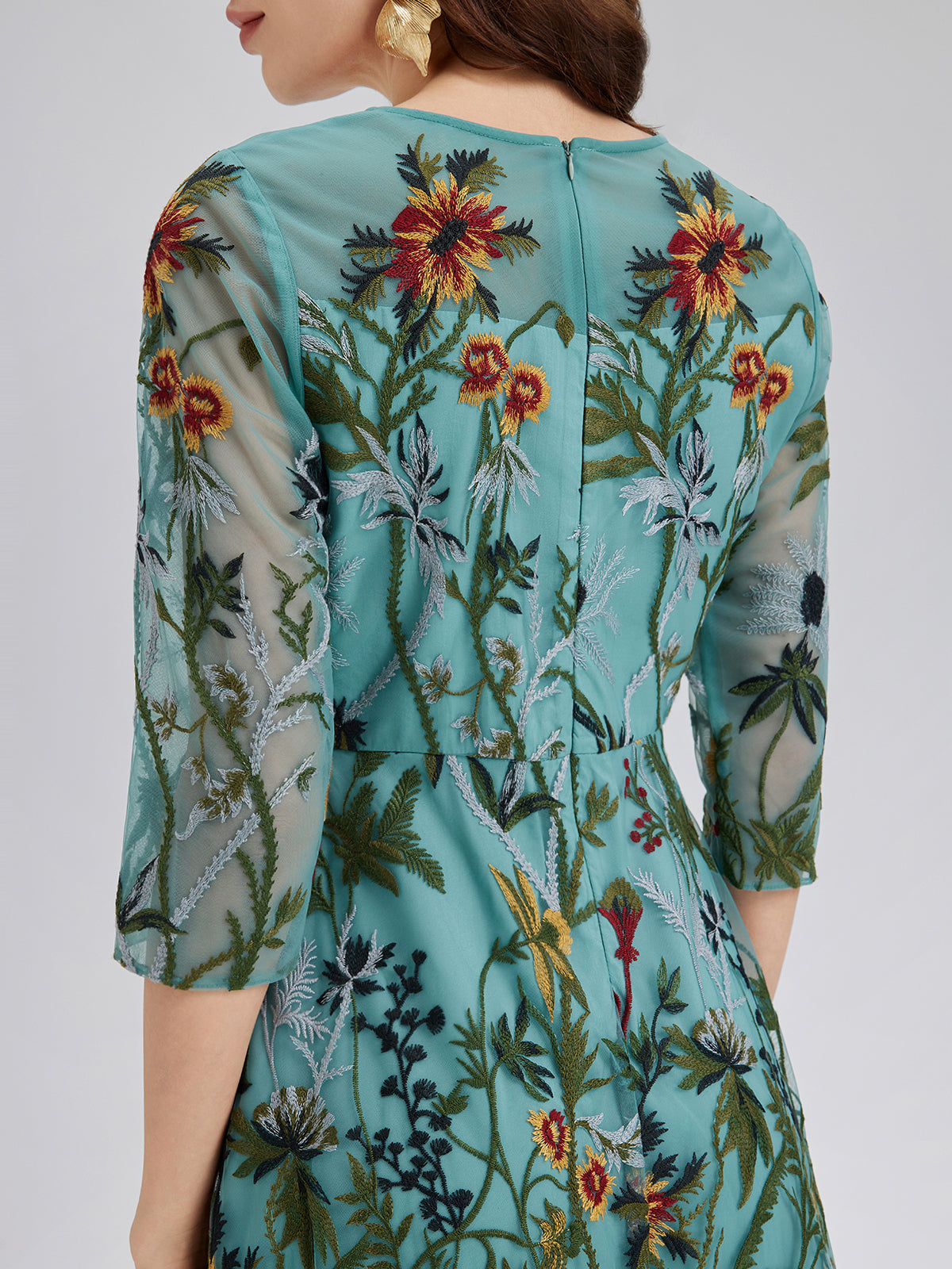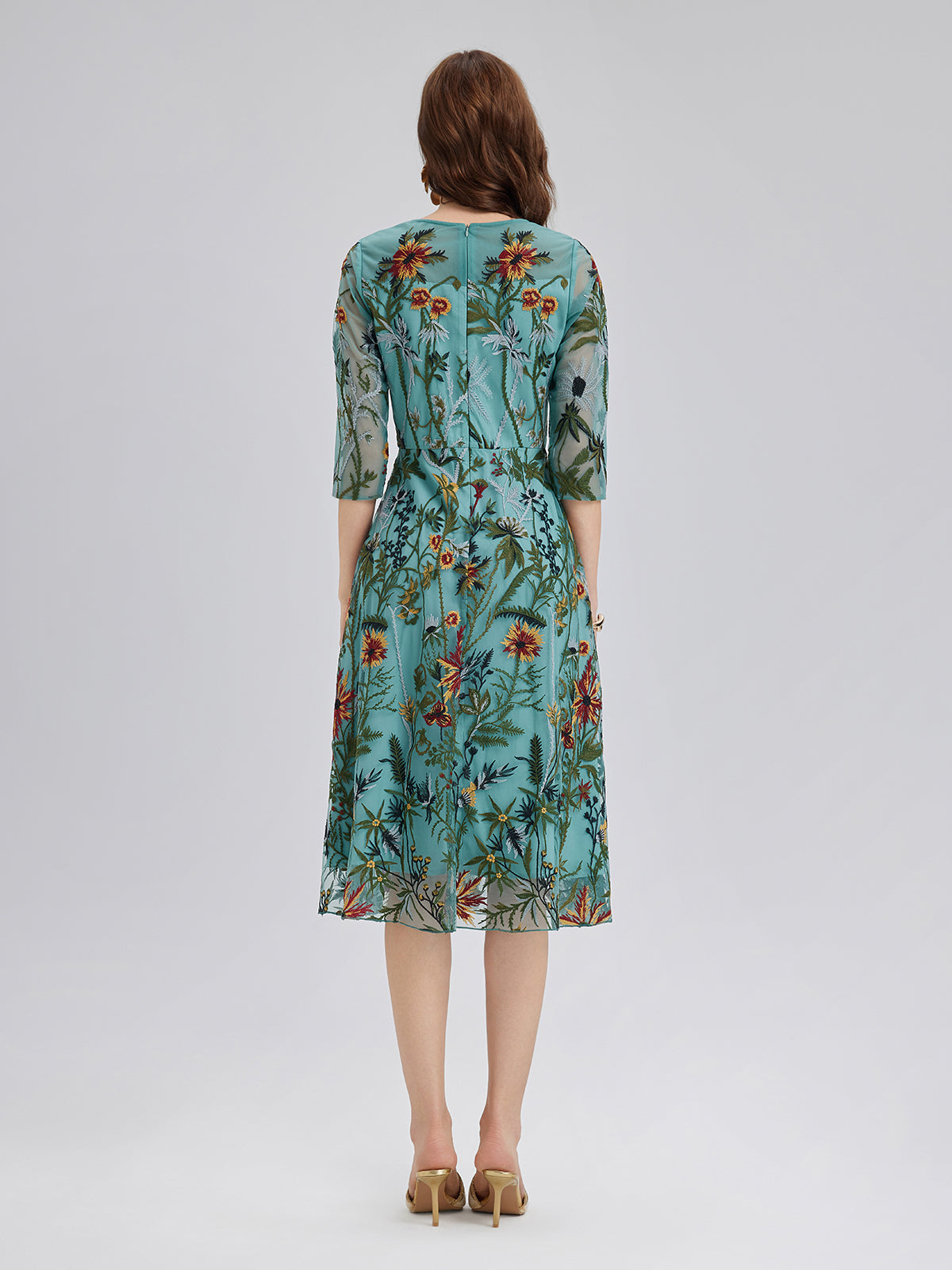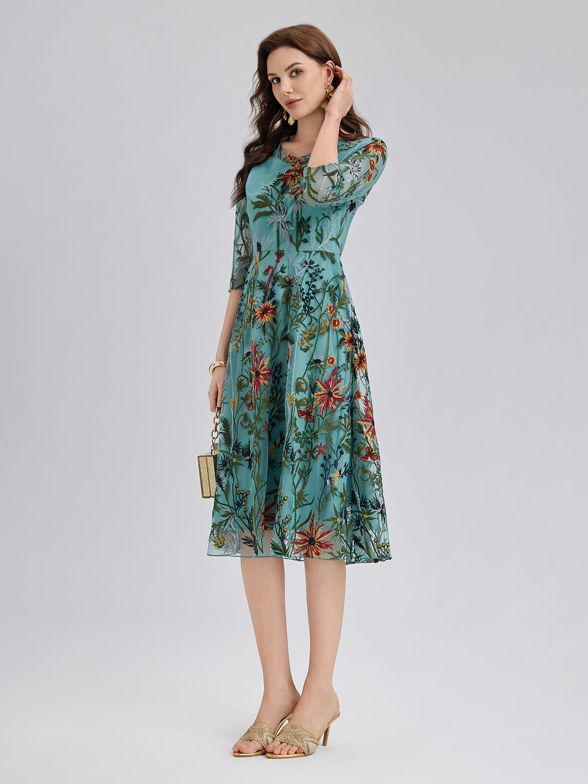 Detailed floral and botanical embroidery adds rich texture and dimension. Tailored for a flattering fit that enhances the silhouette while remaining comfortable. The neckline is hand-finished with beaded accents for a refined, sculptural touch.