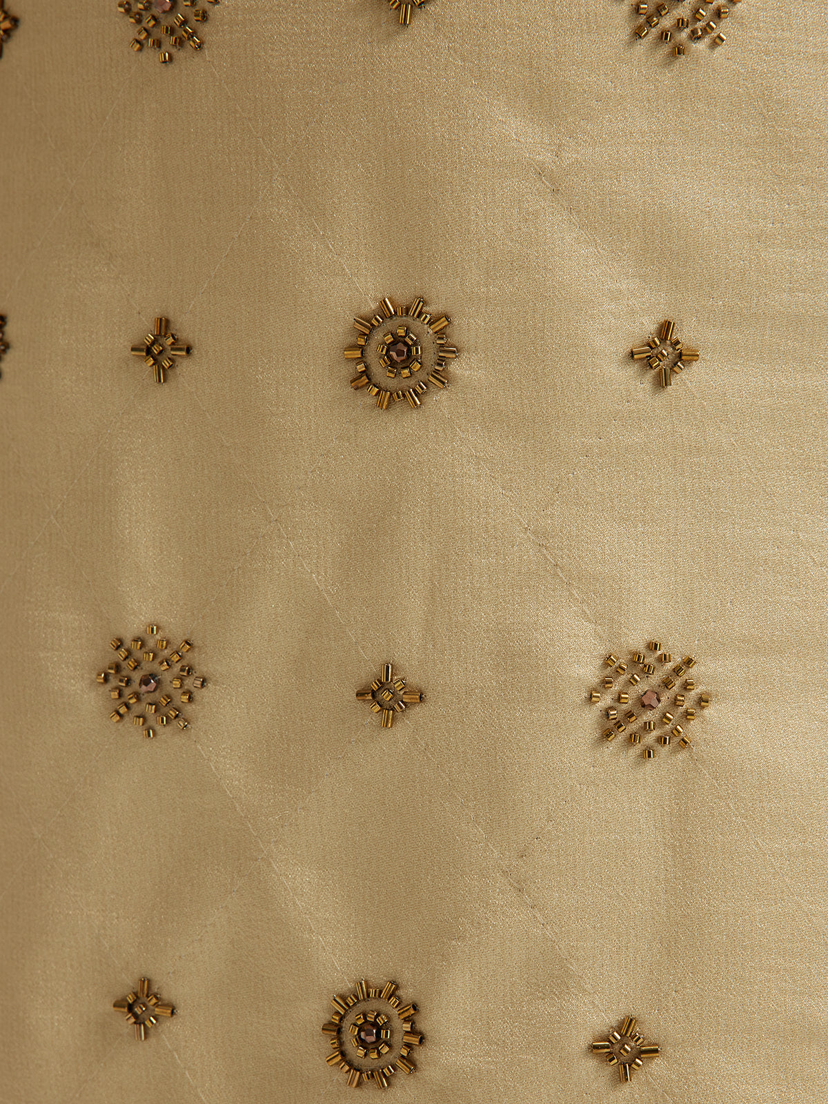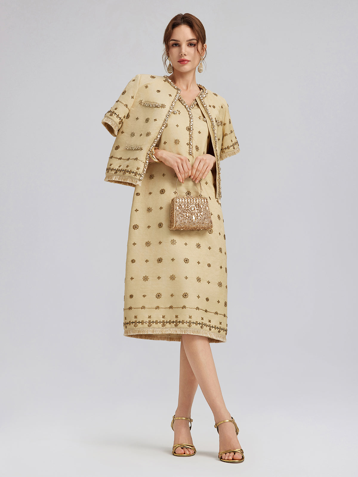 A show-stopping design, this dress is lavishly adorned with hand-applied beading and fringe that form intricate, light-catching patterns. The sleeveless cut highlights the shoulders and neckline, while the fringe sways fluidly with every step, adding untamed elegance. It's tailored to flatter the figure, offering both ease and a versatile fit for different body types.