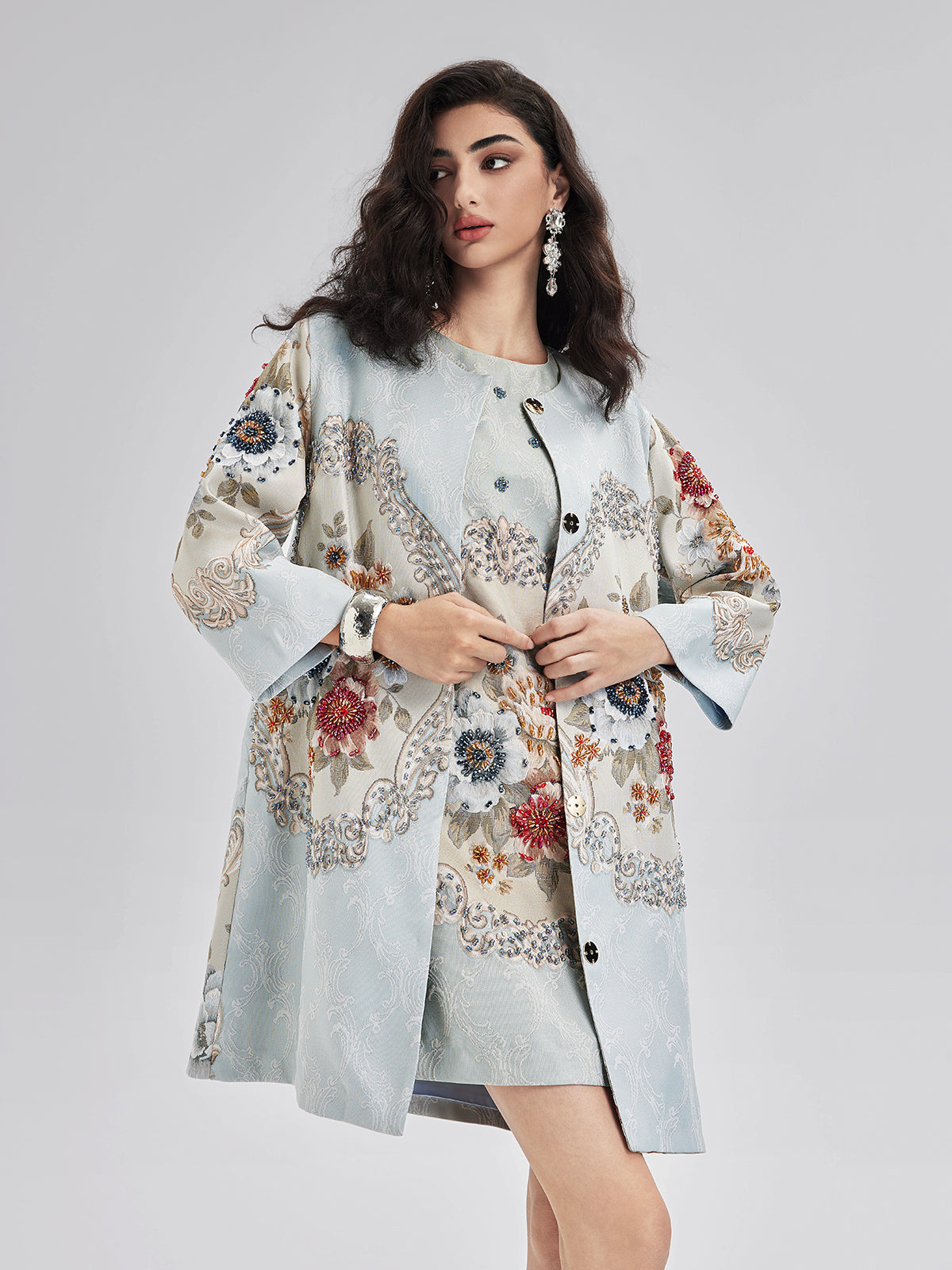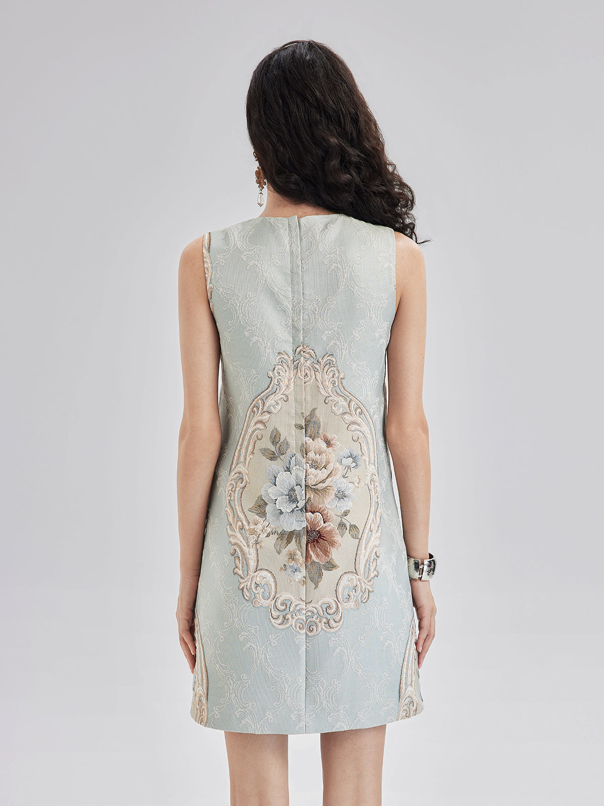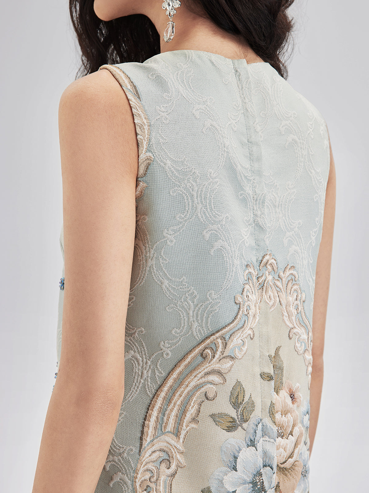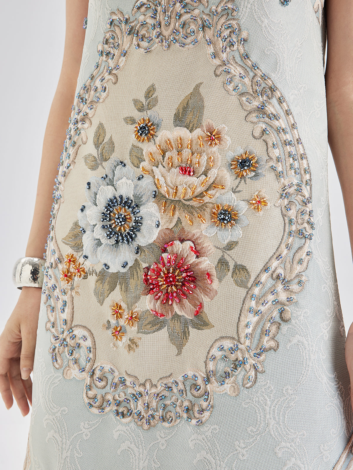 The front showcases an exquisite floral jacquard, combined with hand-sewn beads, creating a rich and vibrant color palette. The subtle, noble blue tone and luxurious beadwork provide perfect balance. A custom zipper at the back ensures easy wear.