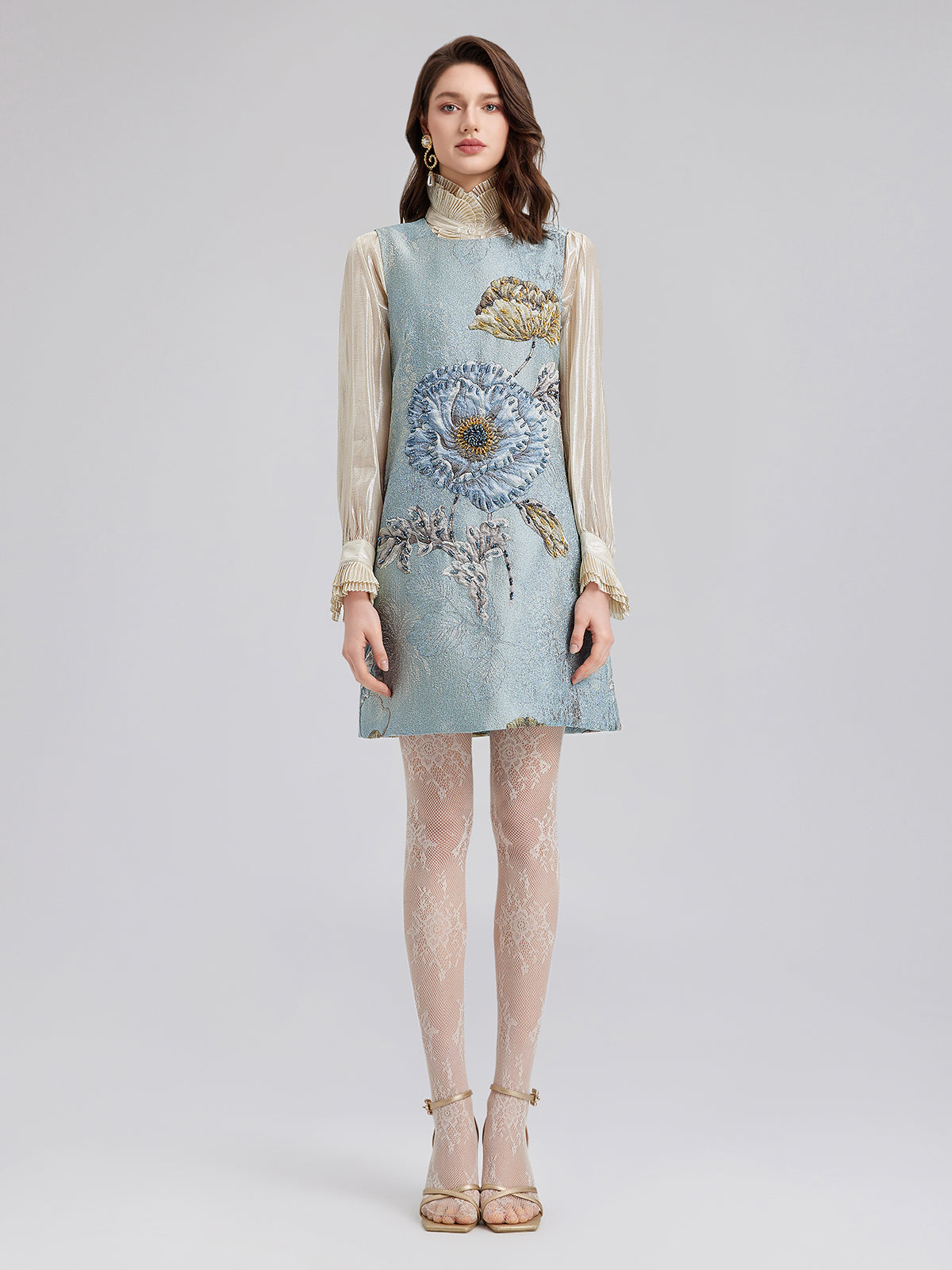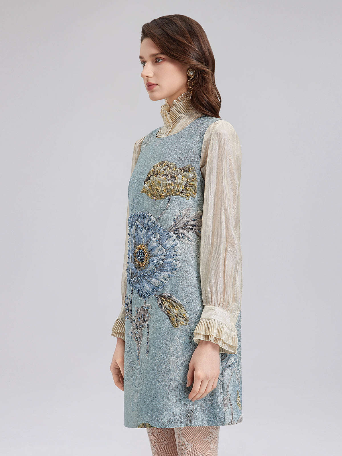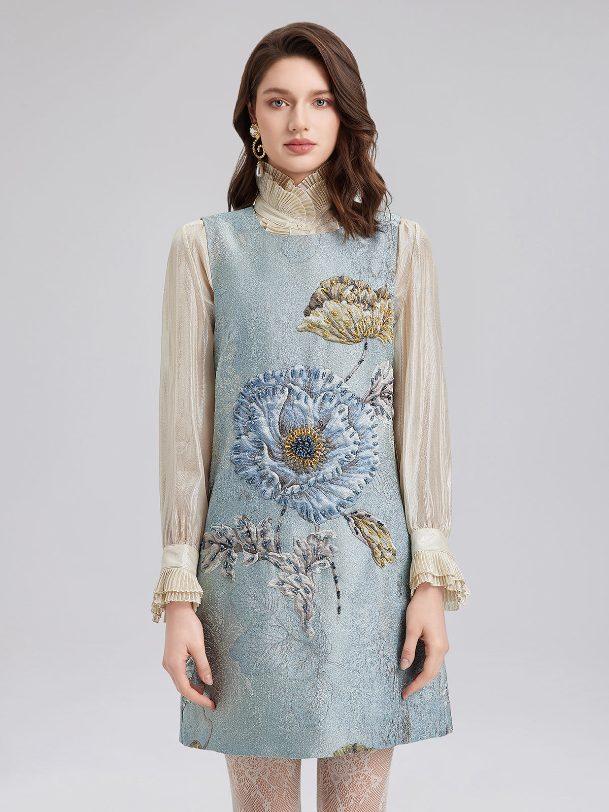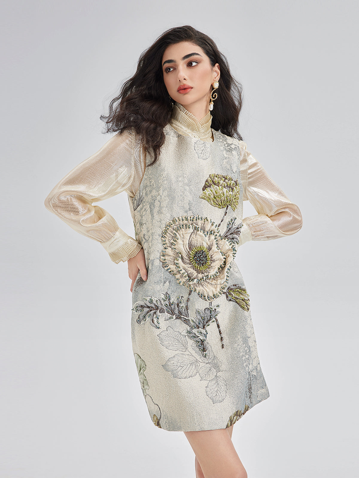Crafted from exquisite 3D floral jacquard fabric, this dress is adorned with hand-sewn beads for a captivating finish. The back features a convenient zipper closure. Style it solo for a sleek look or layer with a blouse or jacket for versatile styling. (Outerwear/top sold separately)