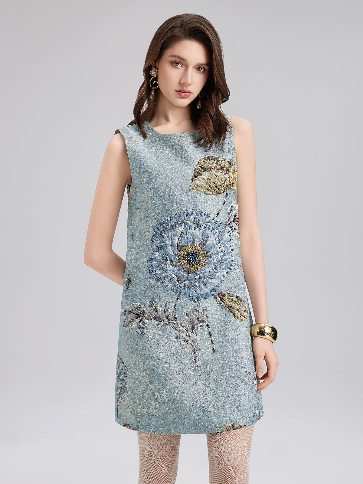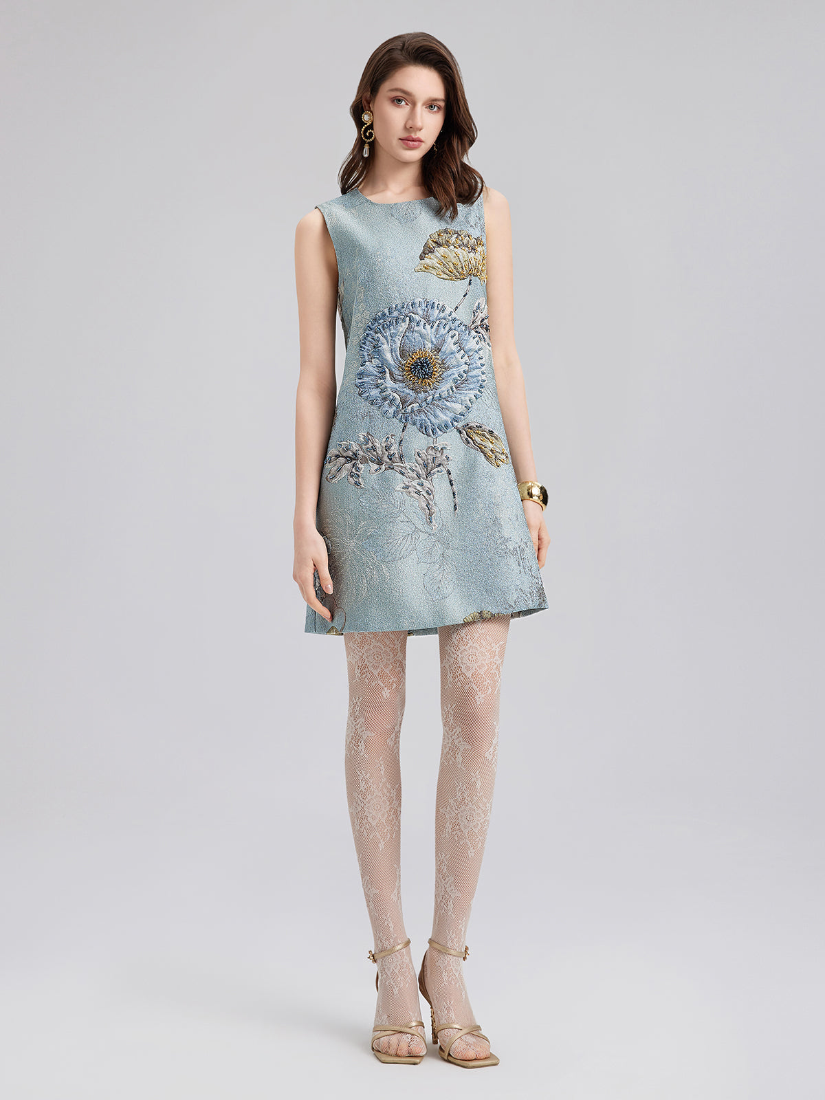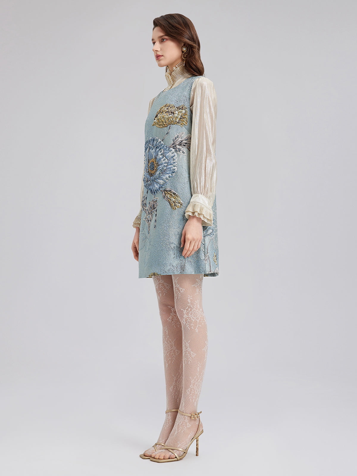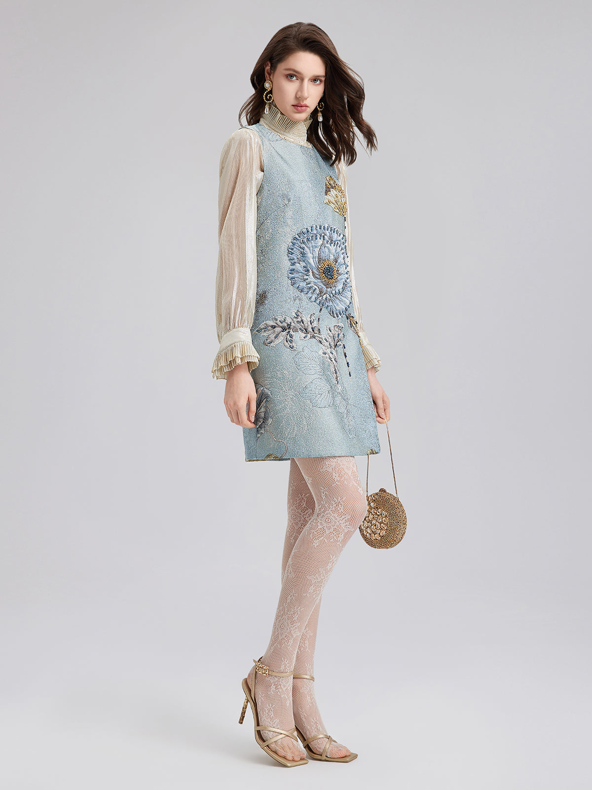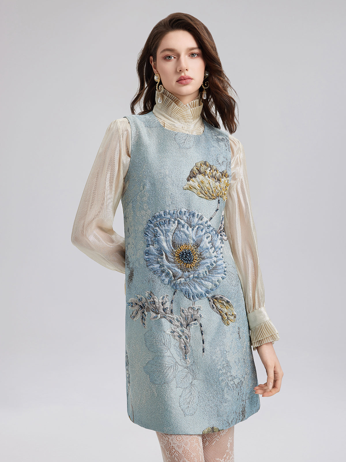 Crafted from exquisite 3D floral jacquard fabric, this dress is adorned with hand-sewn beads for a captivating finish. The back features a convenient zipper closure. Style it solo for a sleek look or layer with a blouse or jacket for versatile styling. (Outerwear/top sold separately)