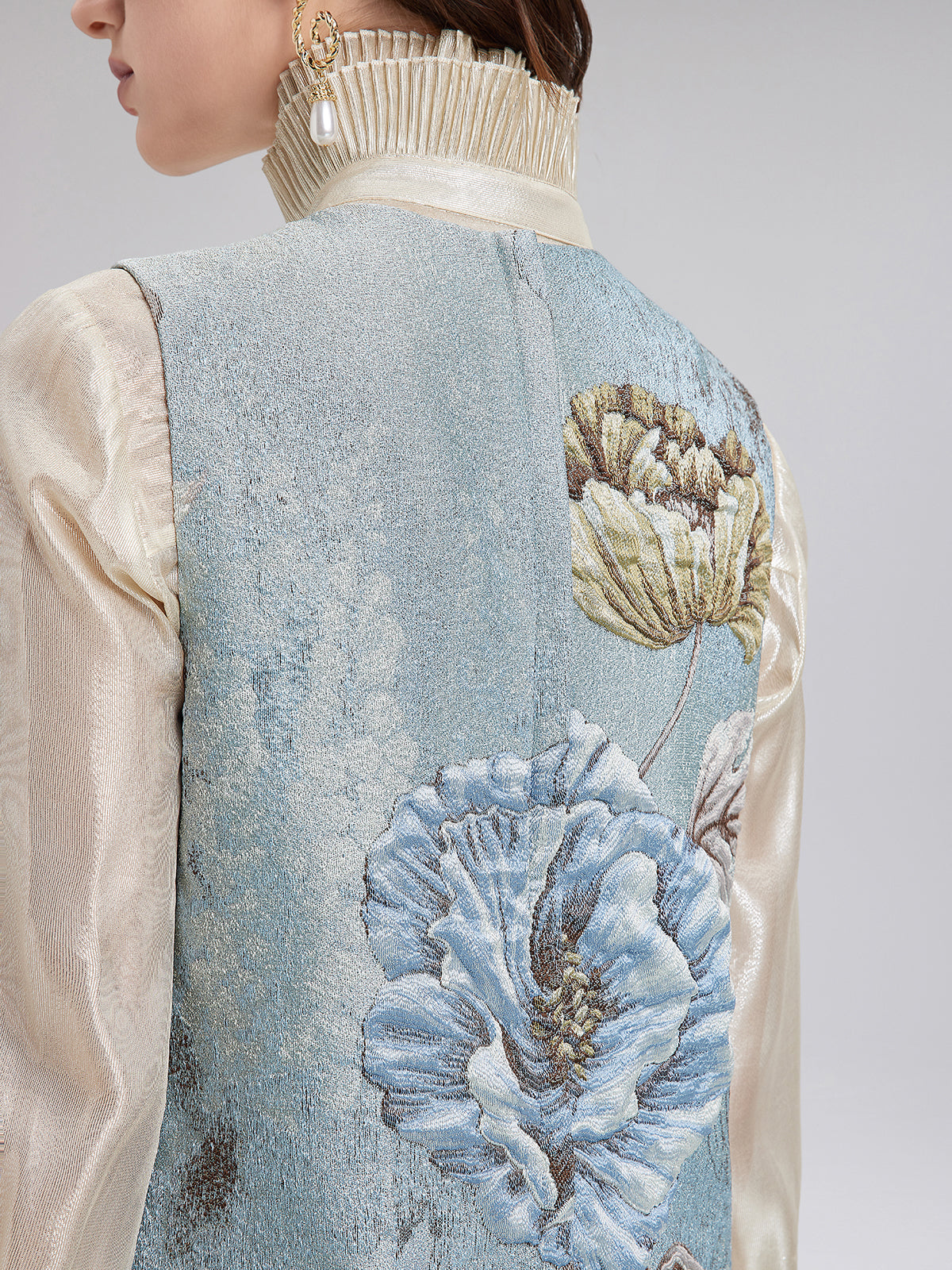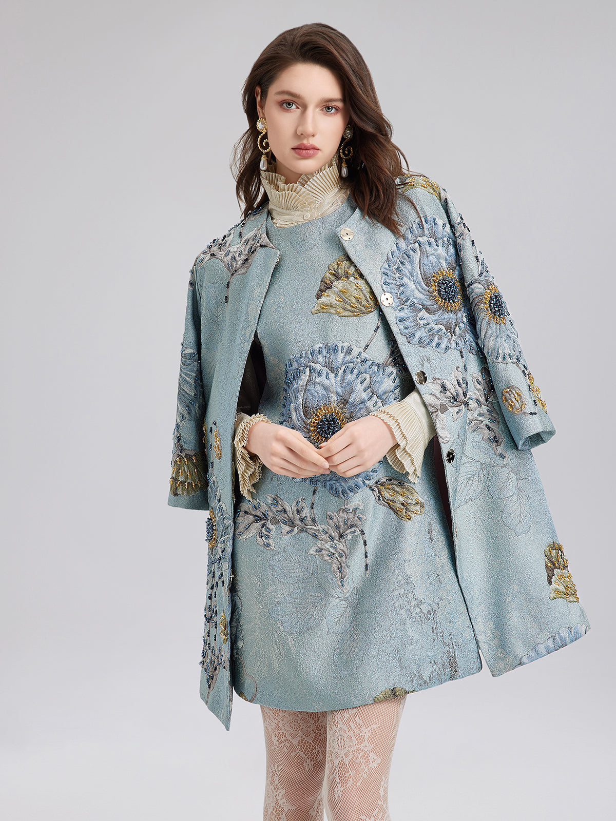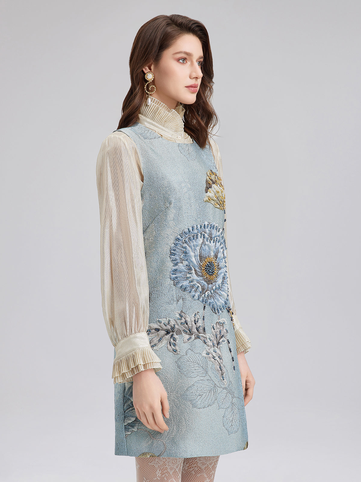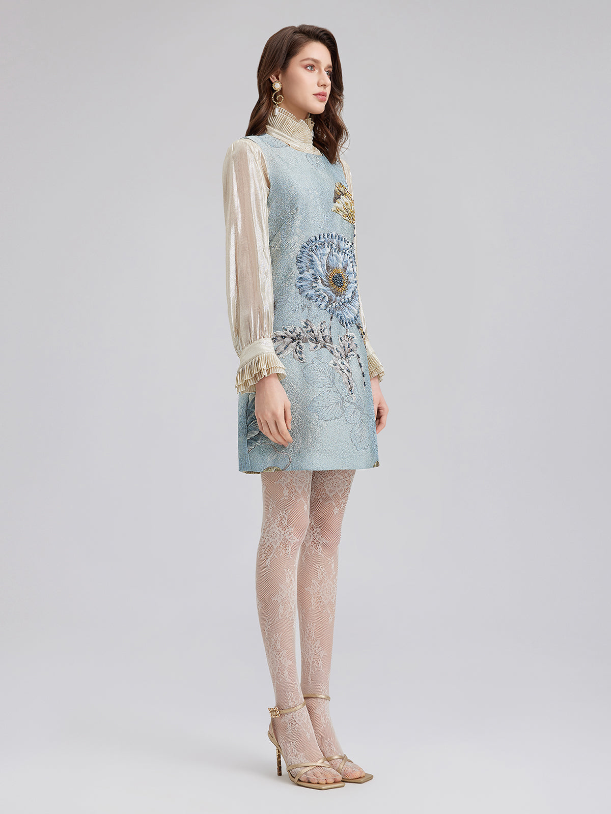 Crafted from exquisite 3D floral jacquard fabric, this dress is adorned with hand-sewn beads for a captivating finish. The back features a convenient zipper closure. Style it solo for a sleek look or layer with a blouse or jacket for versatile styling. (Outerwear/top sold separately)