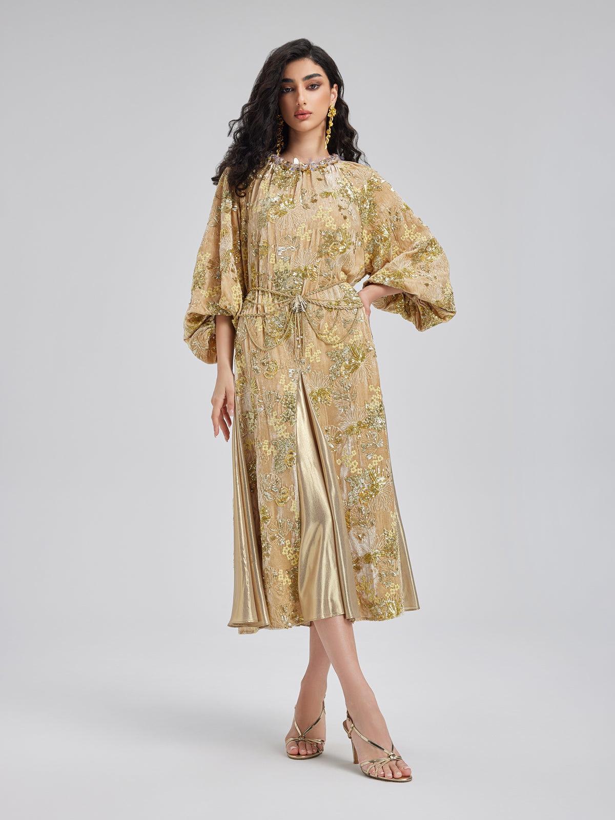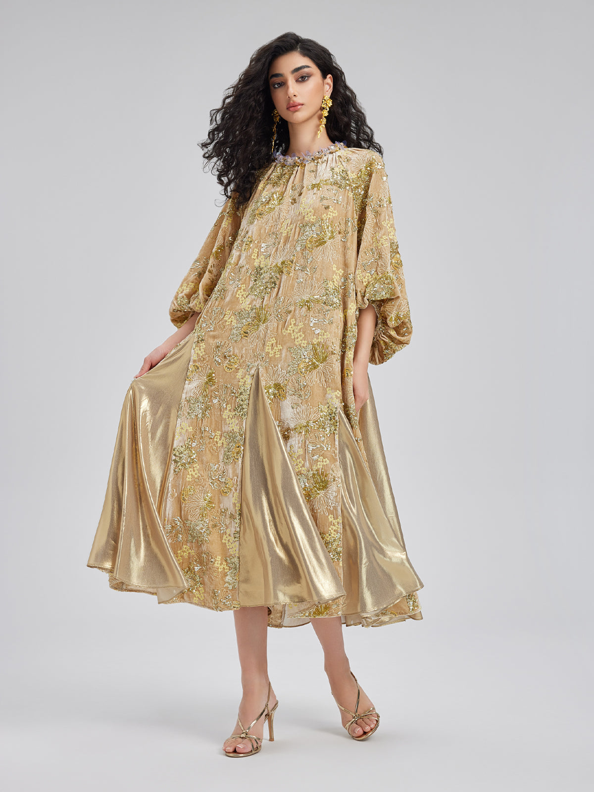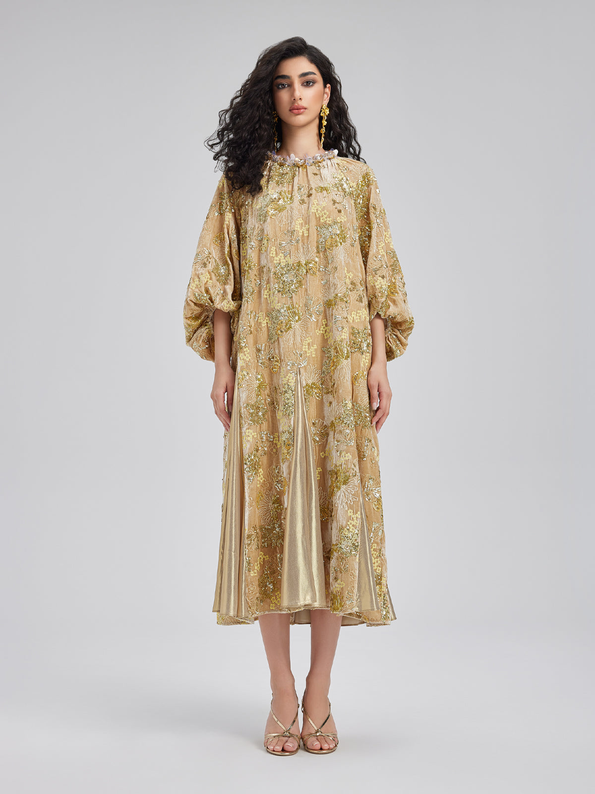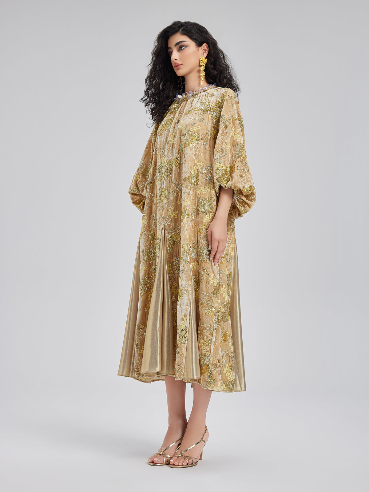 This dress features exquisite gold and green floral prints, offering an elegant, vintage-inspired look that stands out on any occasion. Crafted from soft, luxurious fabric, it provides a comfortable, high-end feel.