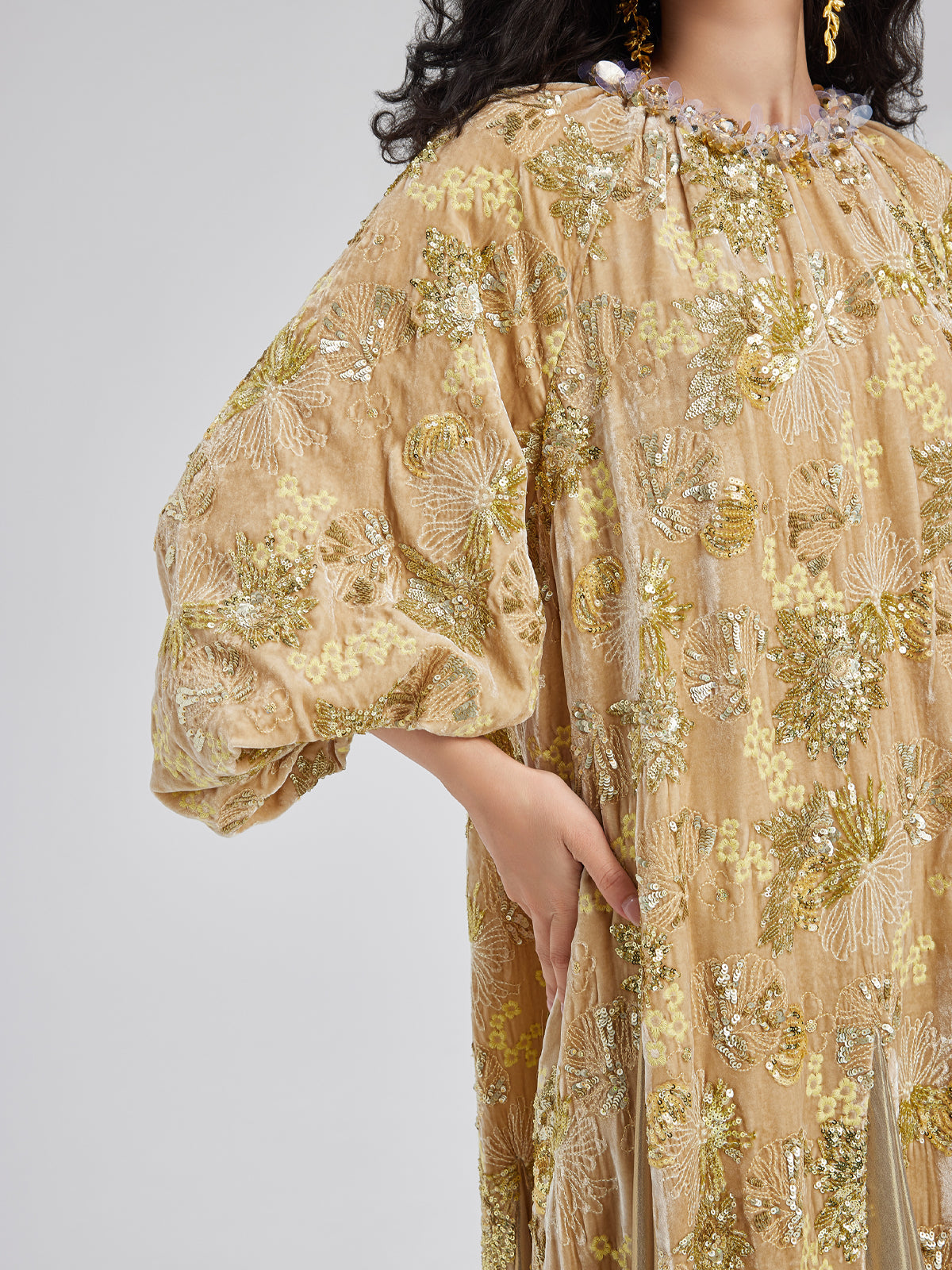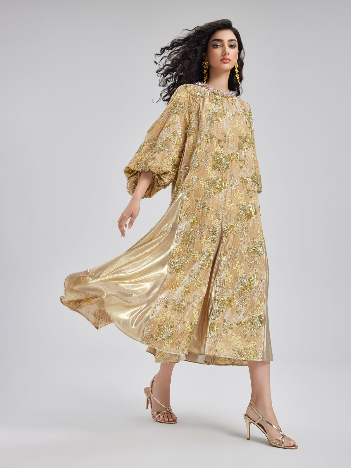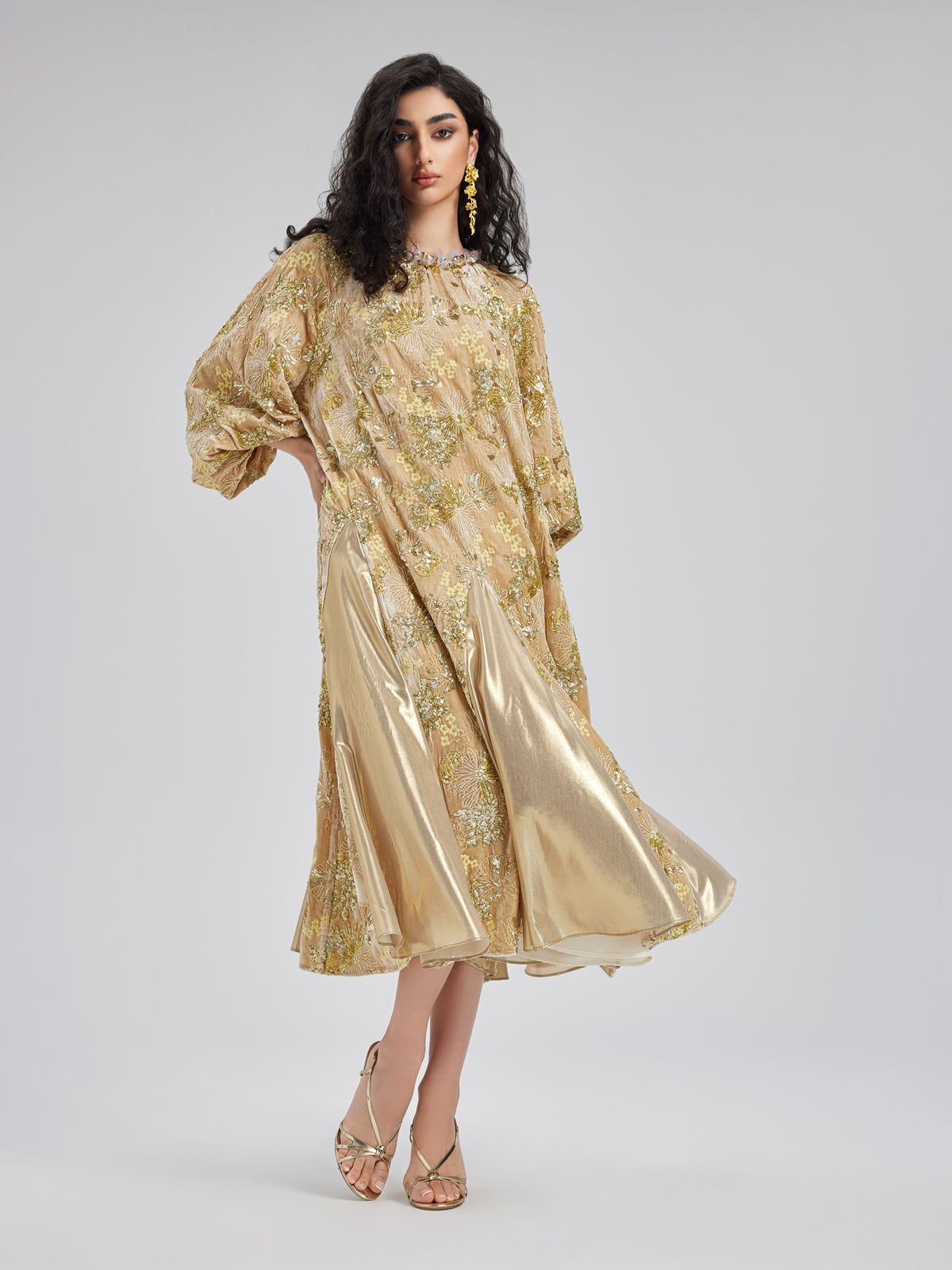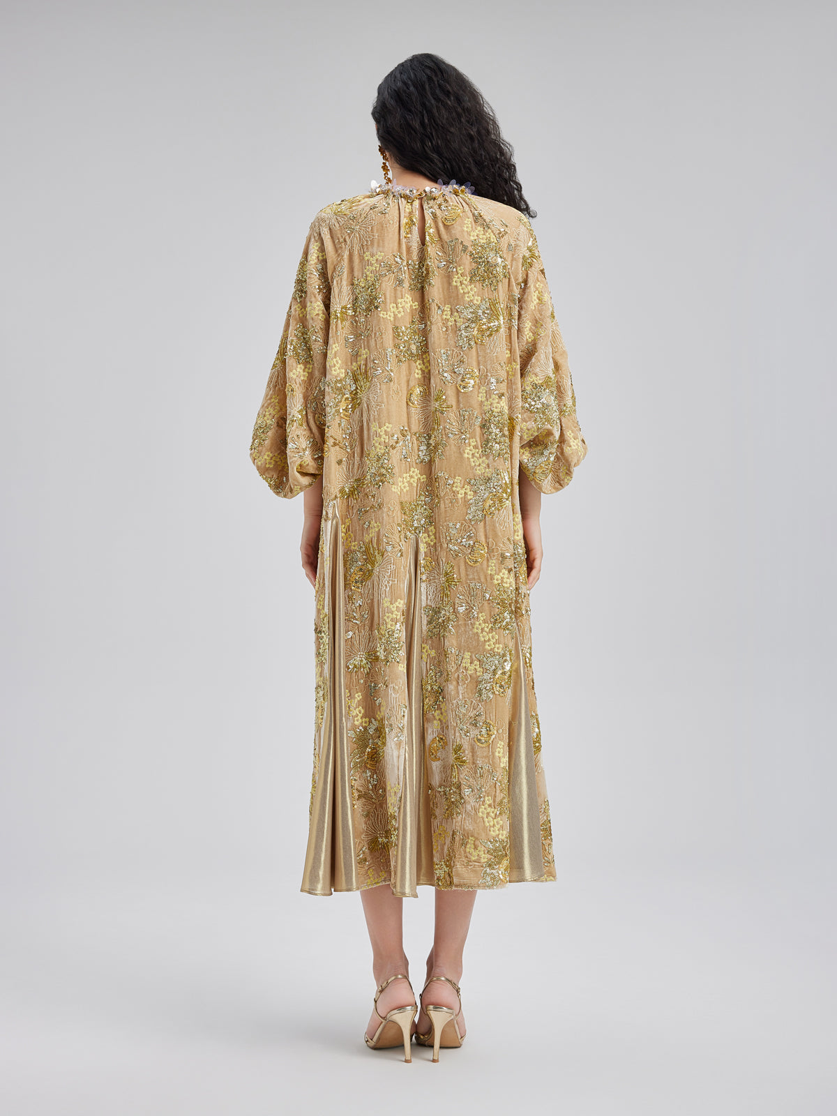 This dress features exquisite gold and green floral prints, offering an elegant, vintage-inspired look that stands out on any occasion. Crafted from soft, luxurious fabric, it provides a comfortable, high-end feel.