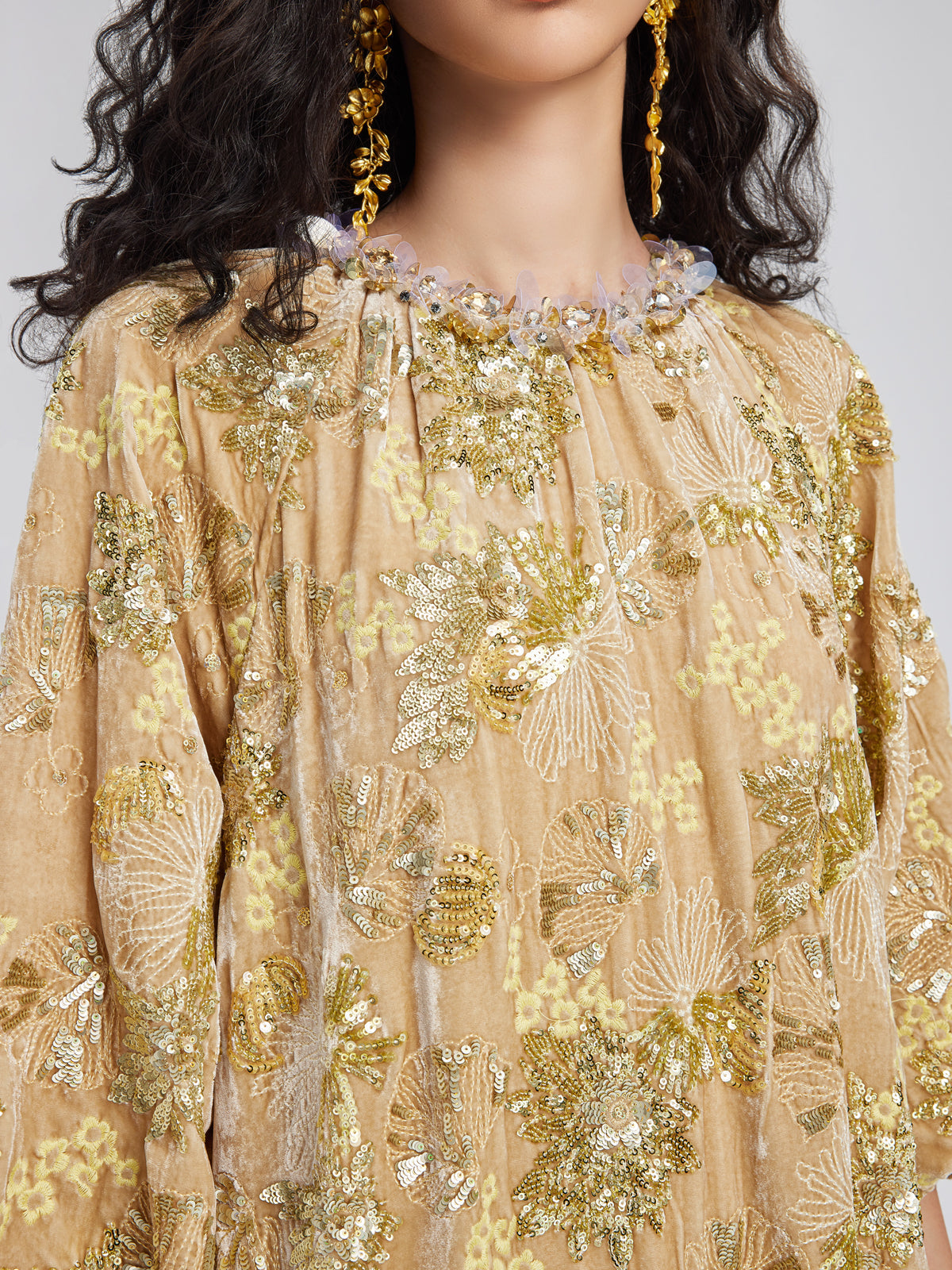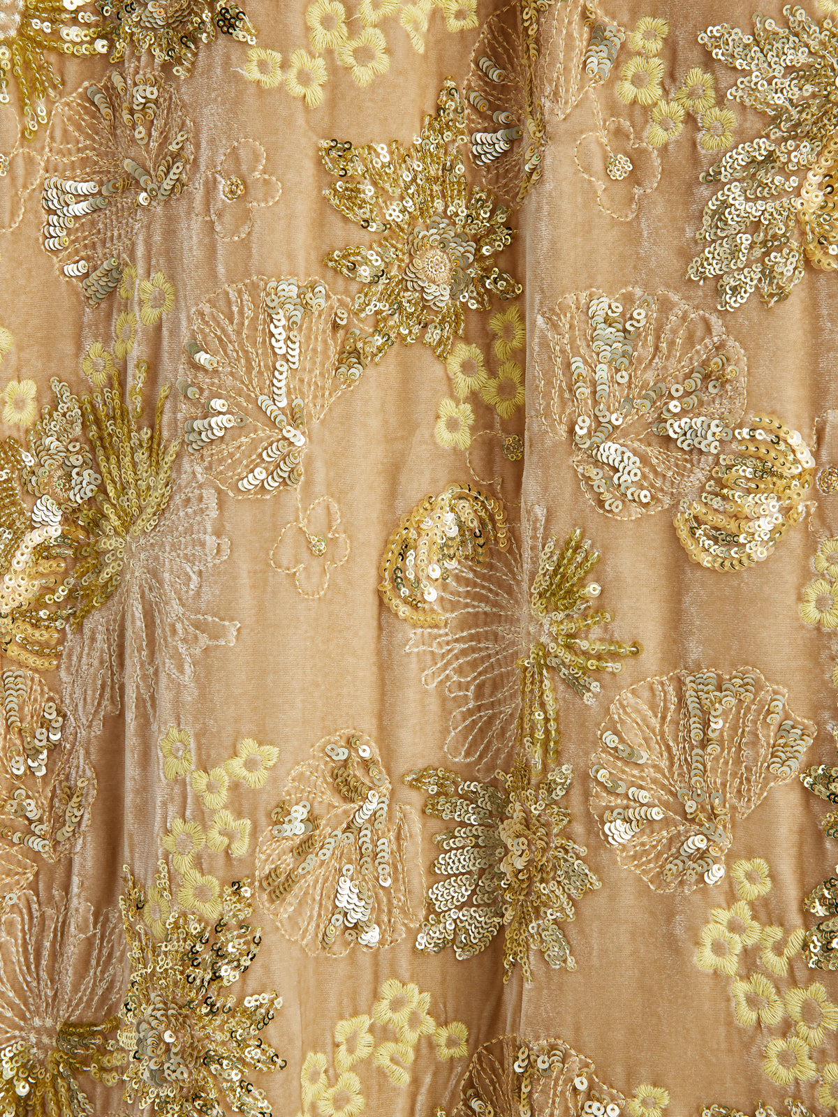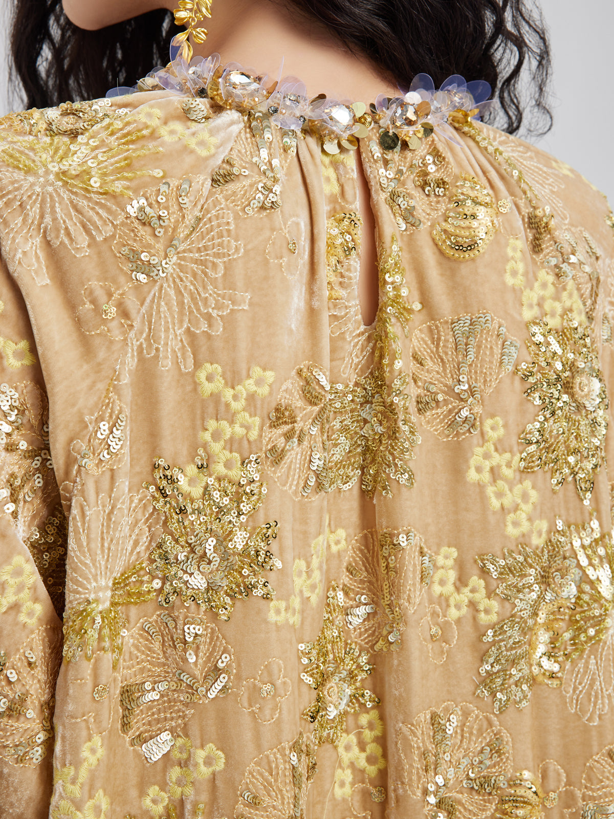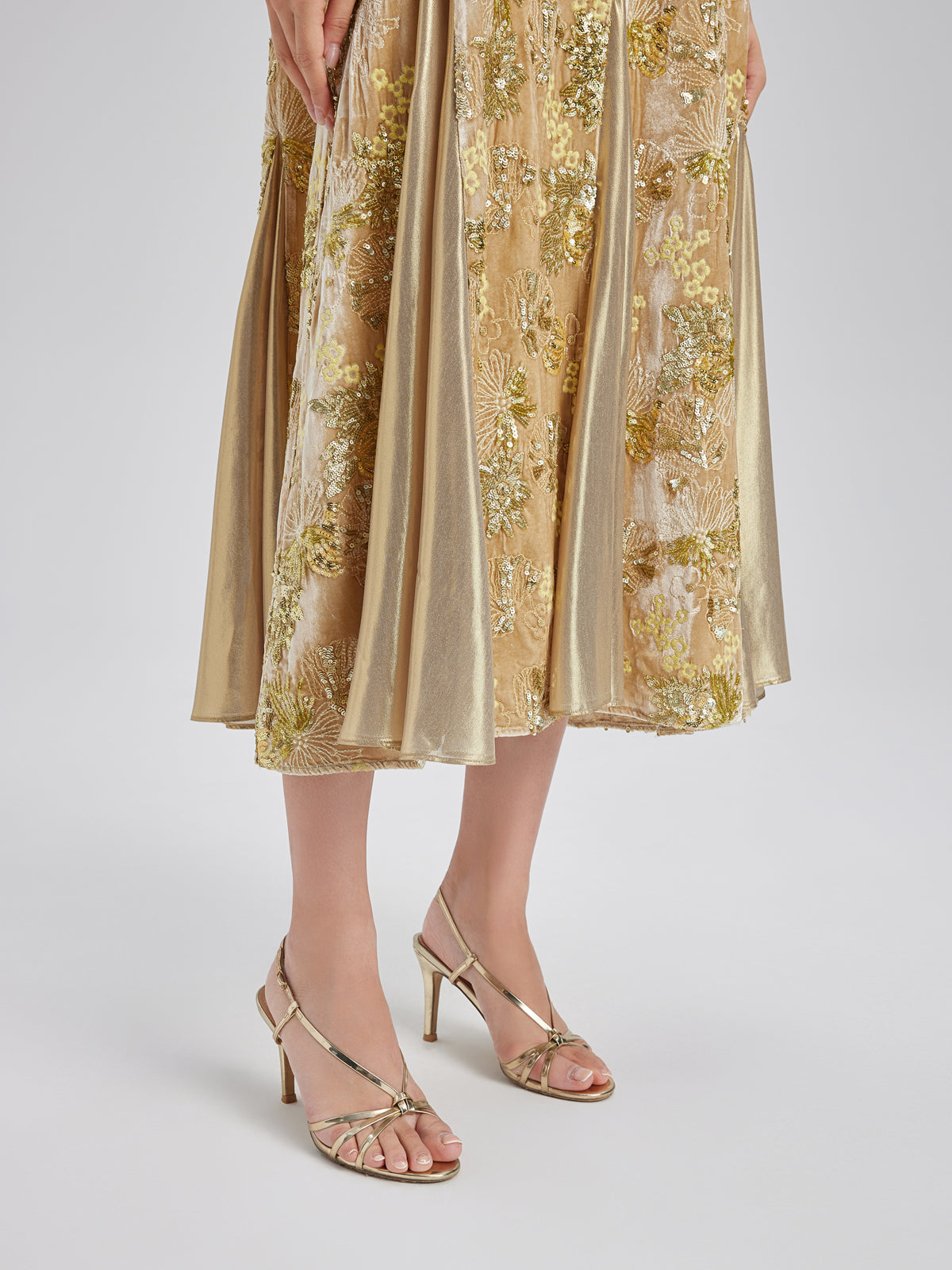 This dress features exquisite gold and green floral prints, offering an elegant, vintage-inspired look that stands out on any occasion. Crafted from soft, luxurious fabric, it provides a comfortable, high-end feel.