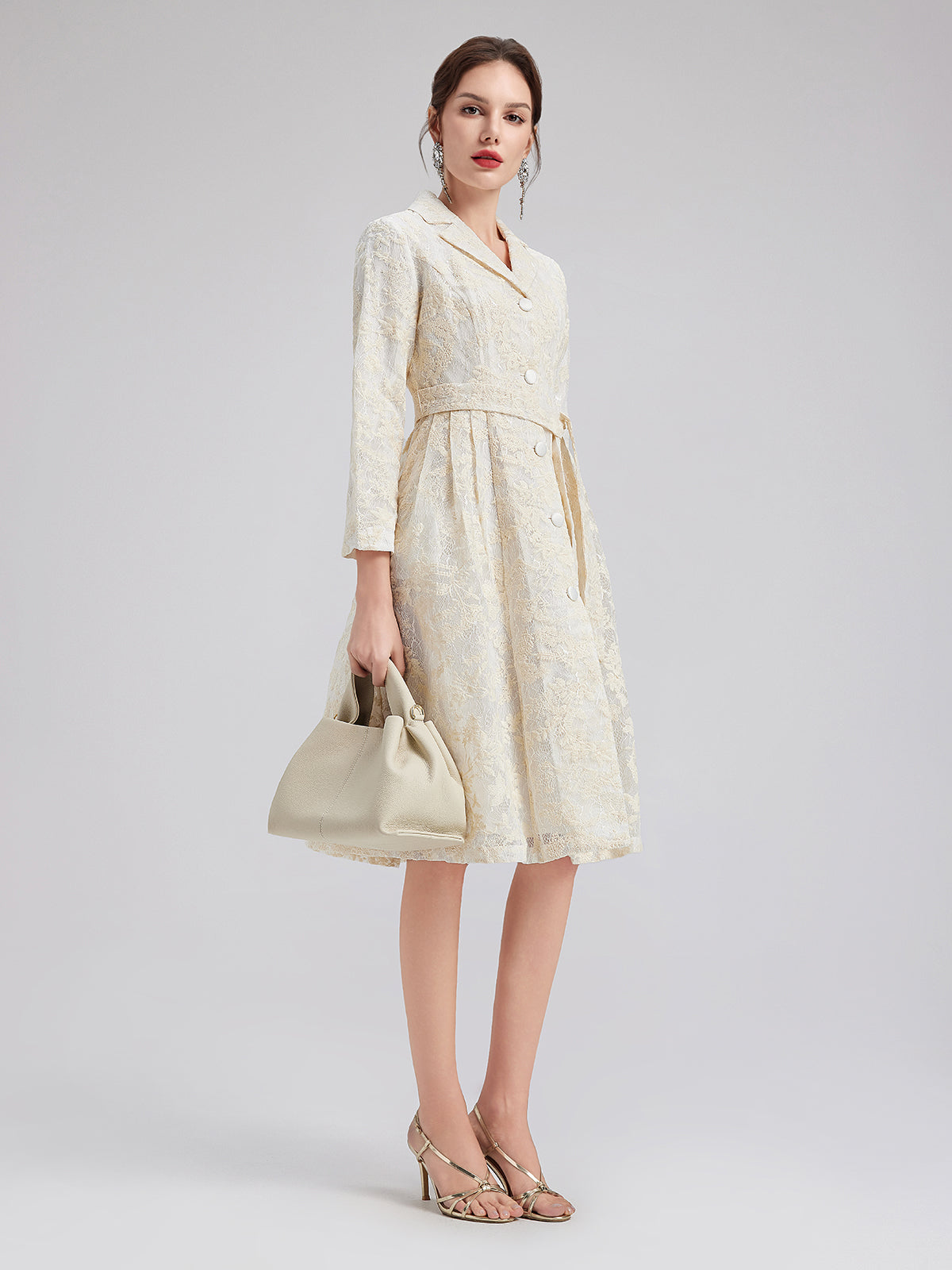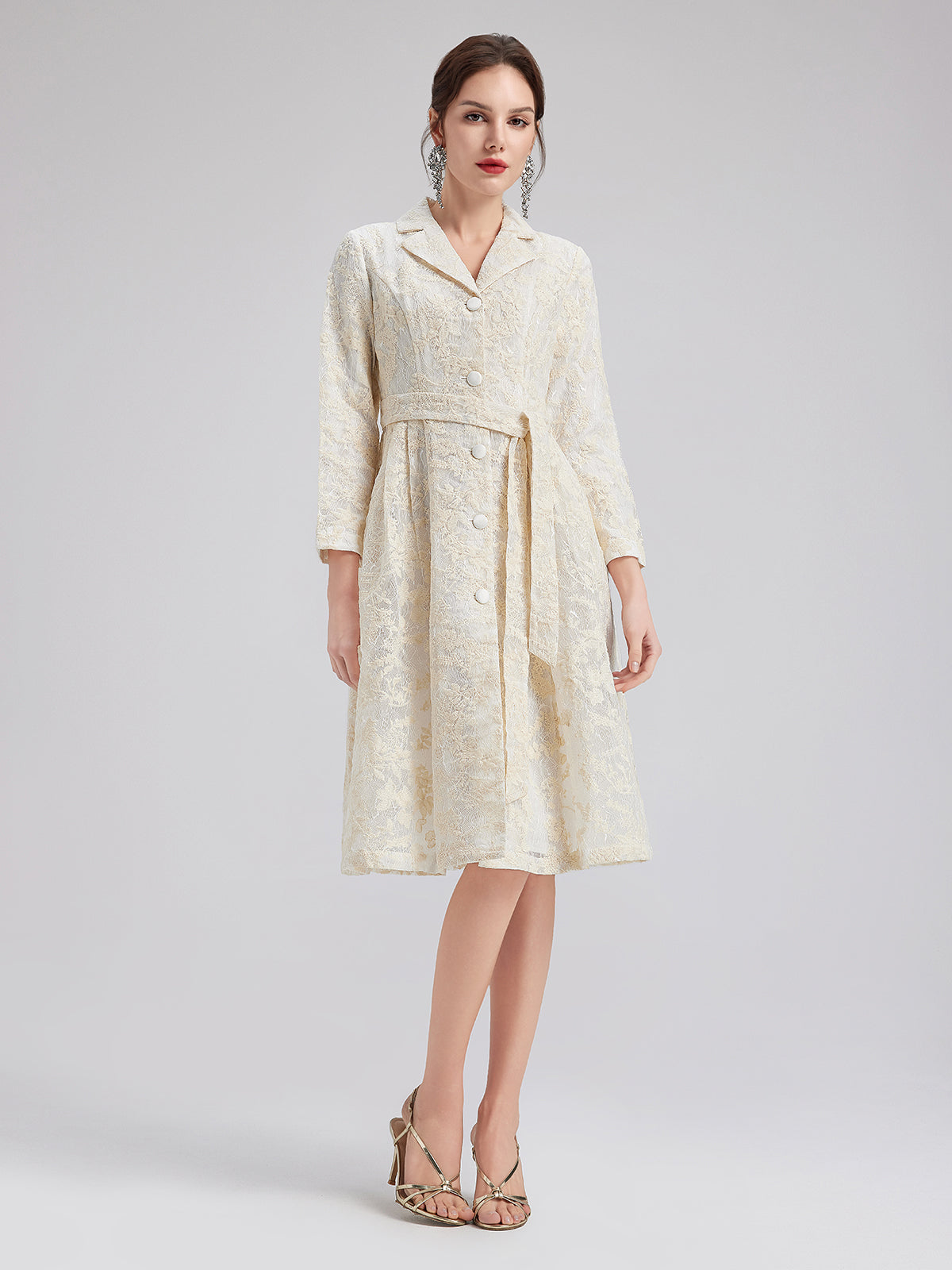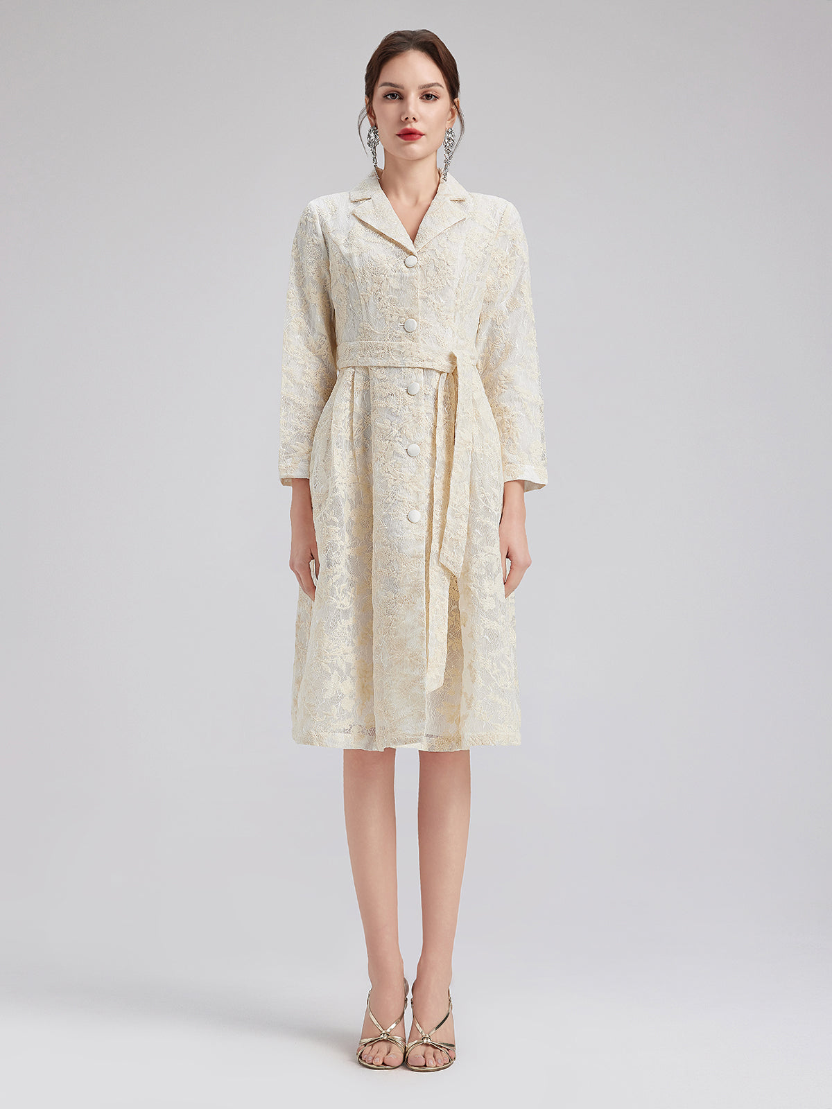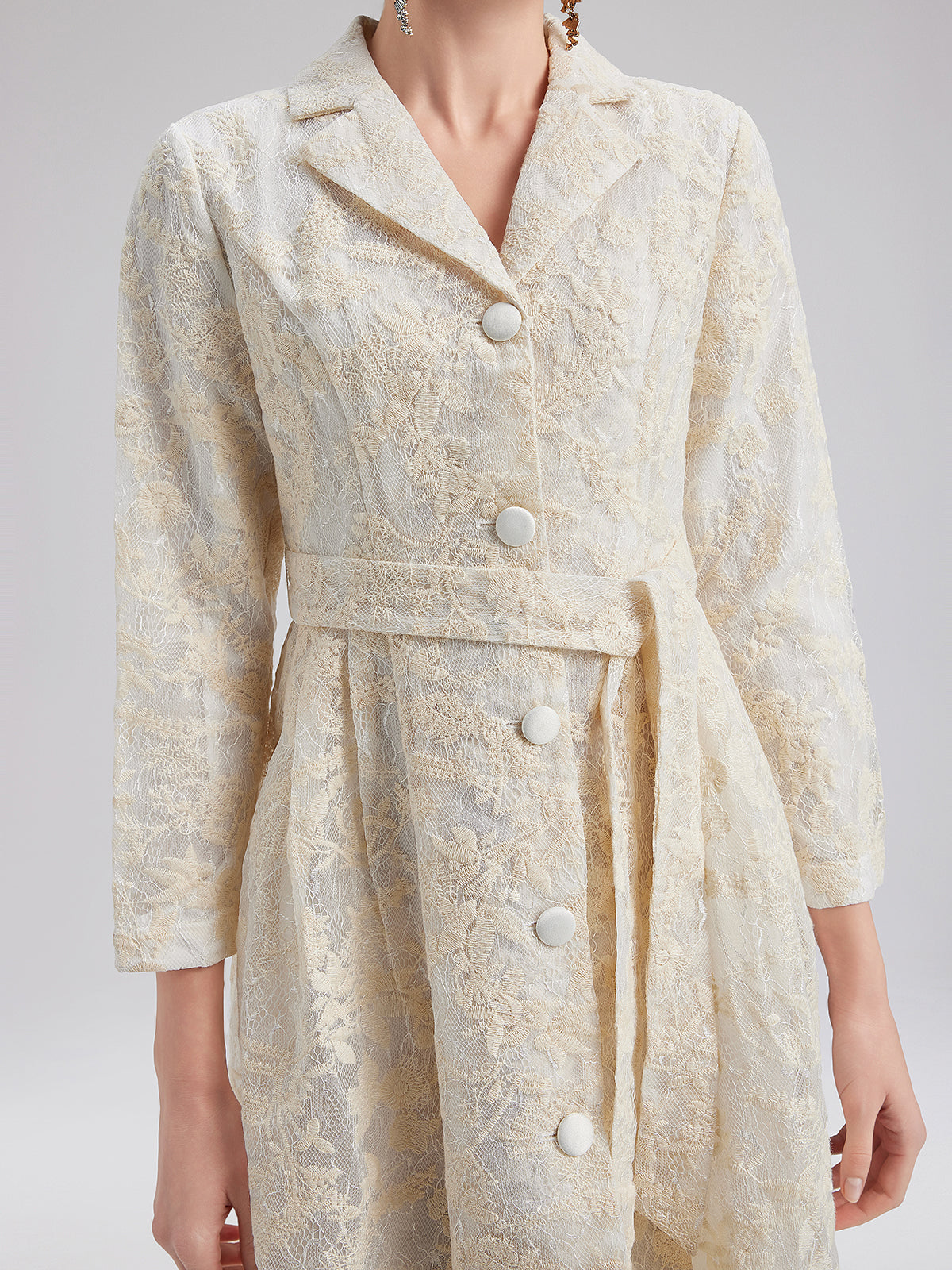 This dress features a blazer-style V-neck design that elongates the neck and enhances an elegant feminine allure. The delicate lace pattern and structured tailoring allow it to be worn as a trench coat or as a standalone dress. The perfectly placed waistline and tie belt accentuate the silhouette, making it suitable for various occasions while showcasing a flattering figure.