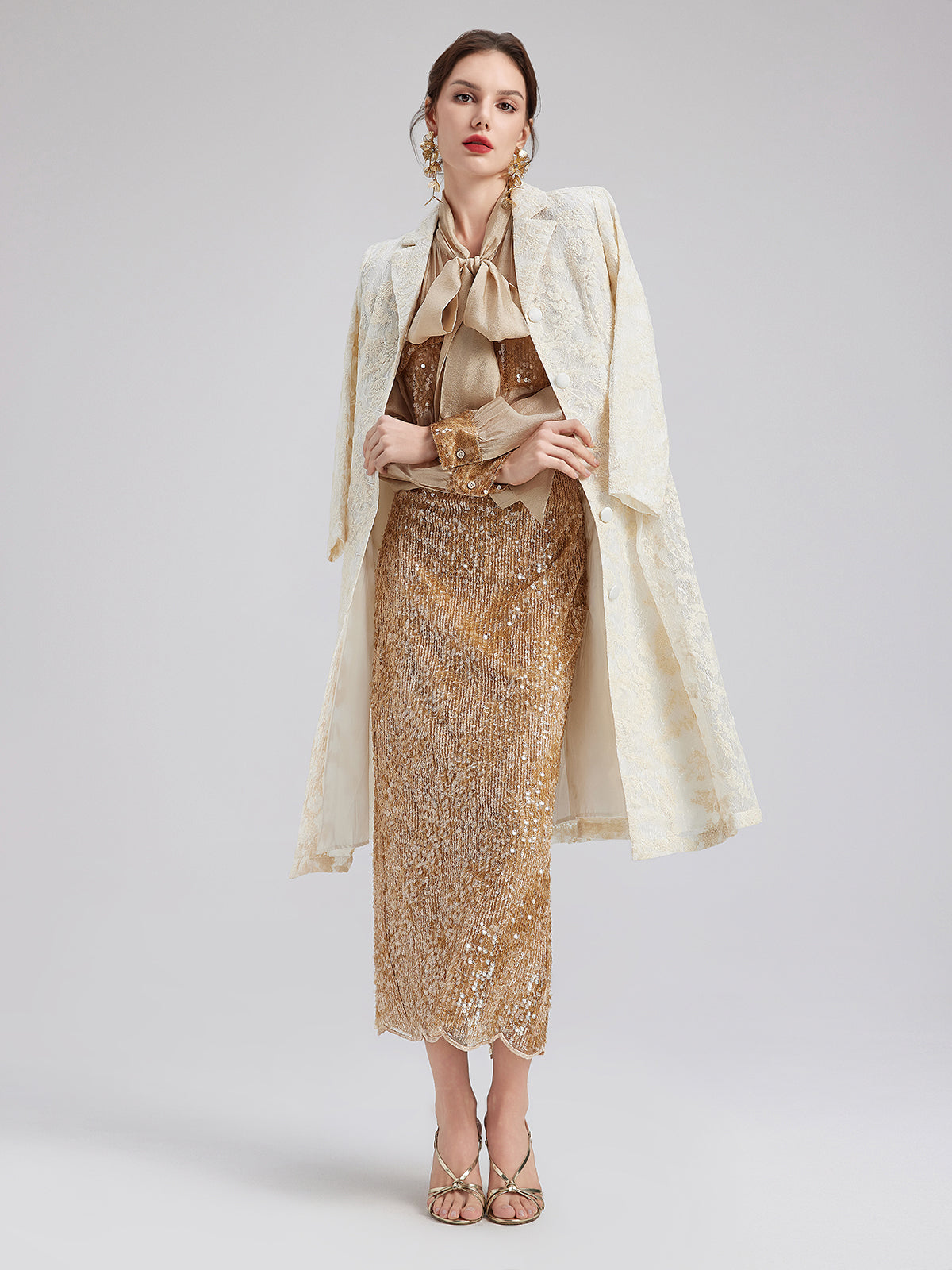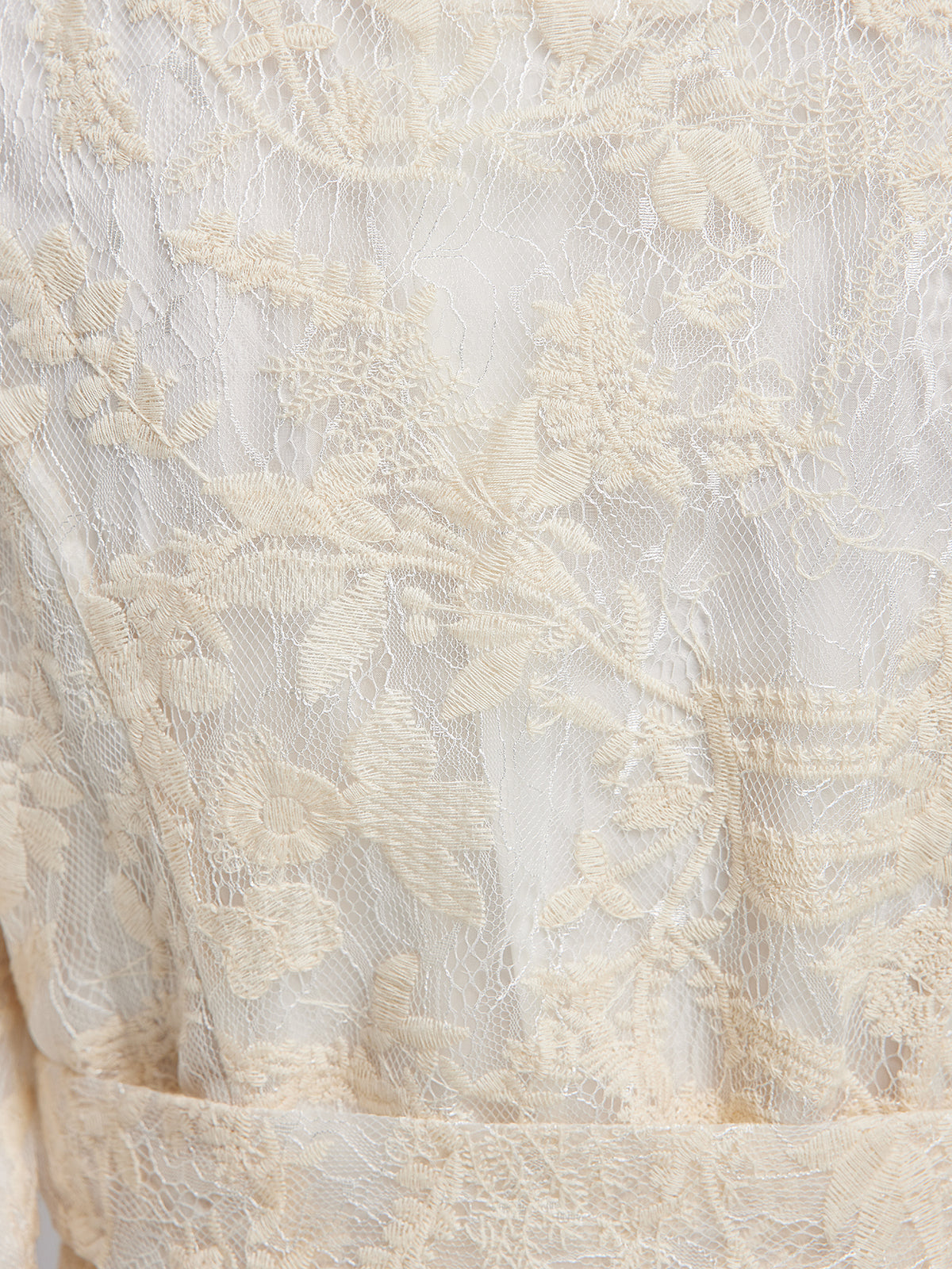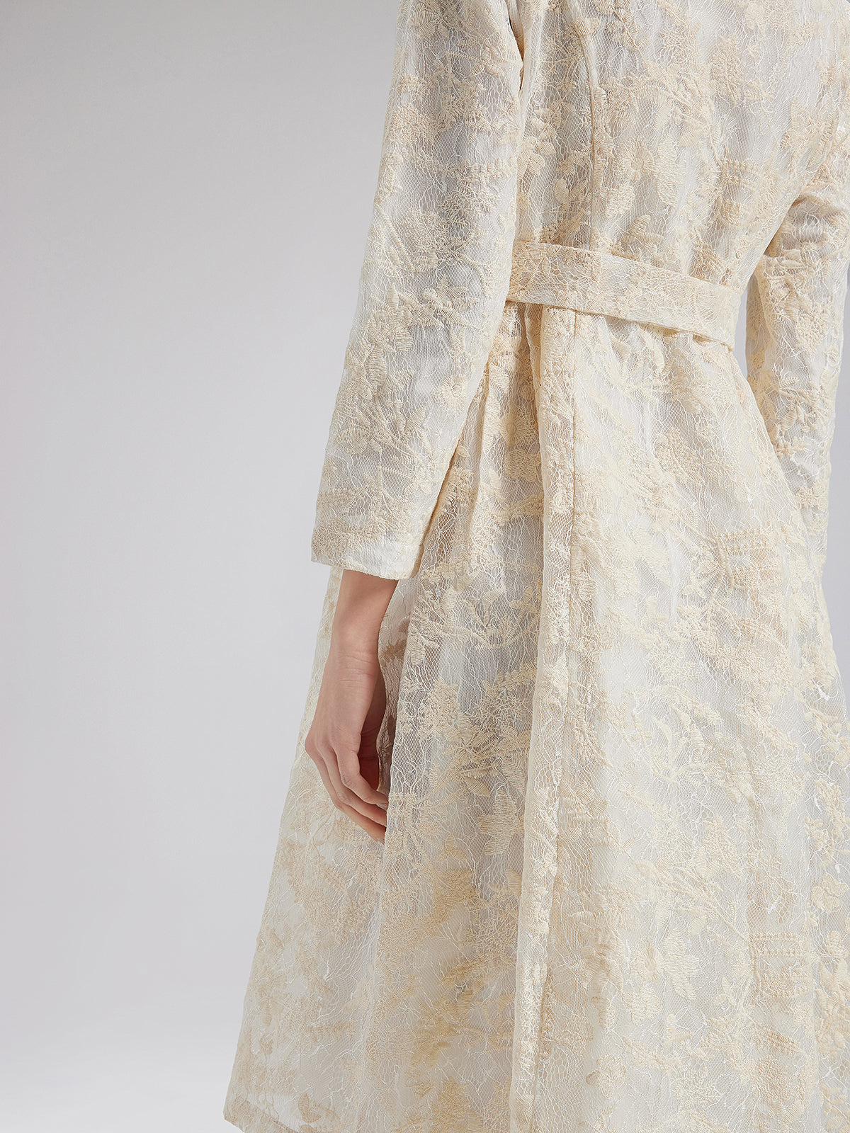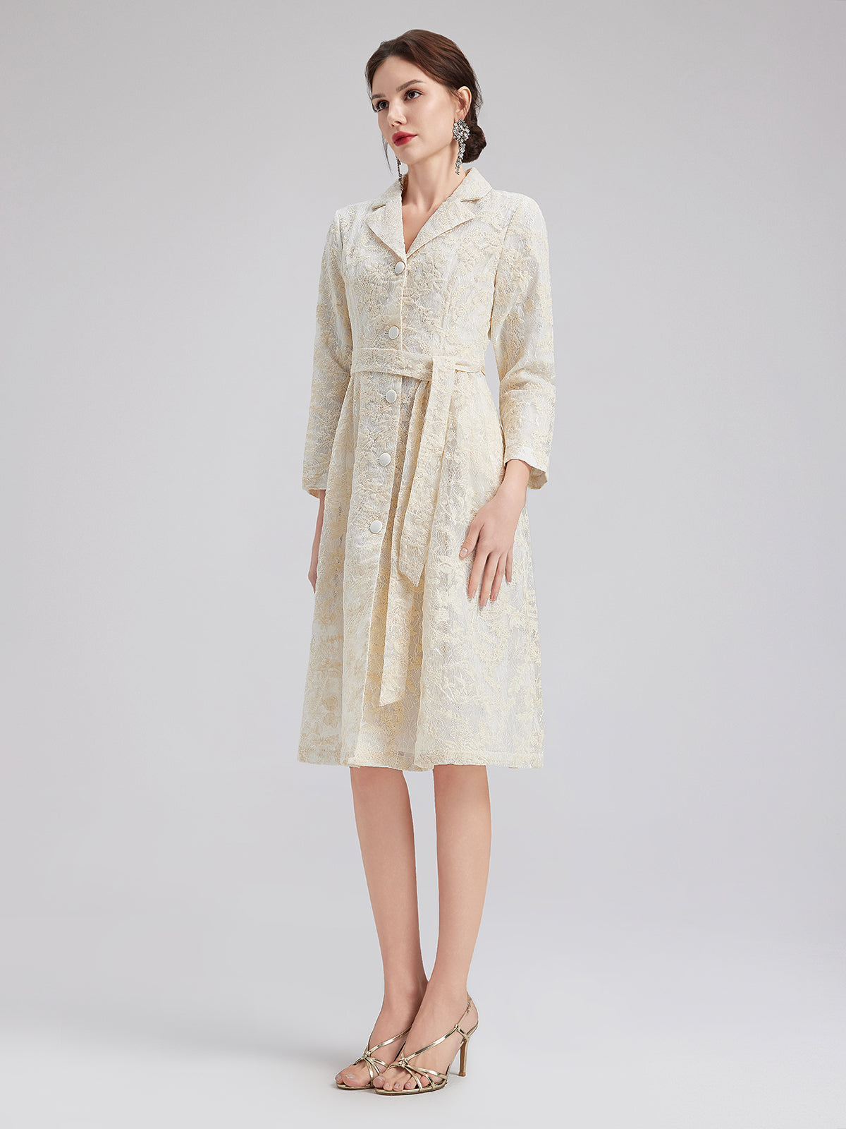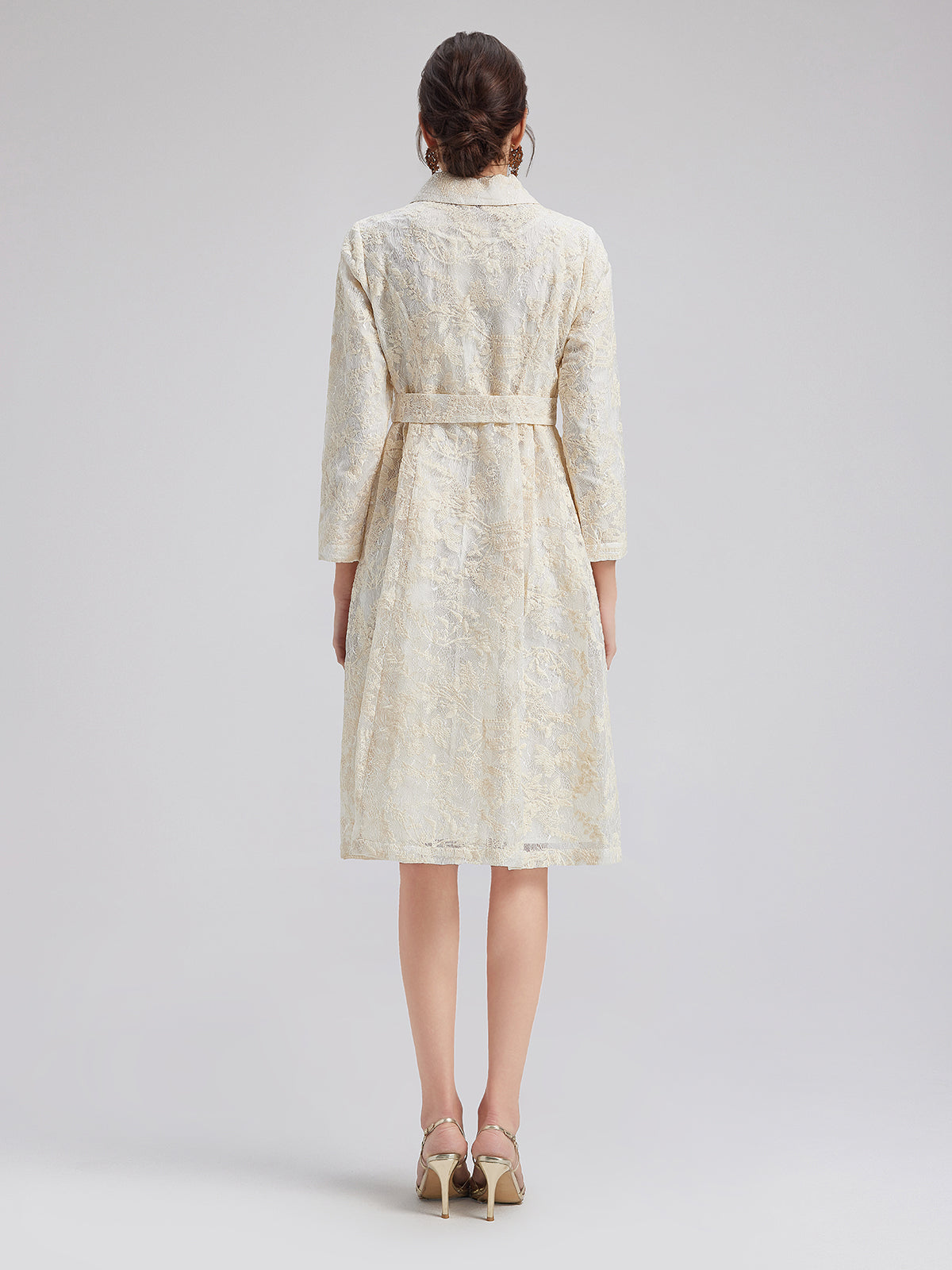 This dress features a blazer-style V-neck design that elongates the neck and enhances an elegant feminine allure. The delicate lace pattern and structured tailoring allow it to be worn as a trench coat or as a standalone dress. The perfectly placed waistline and tie belt accentuate the silhouette, making it suitable for various occasions while showcasing a flattering figure.