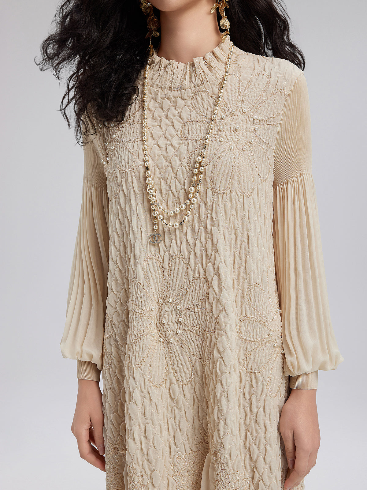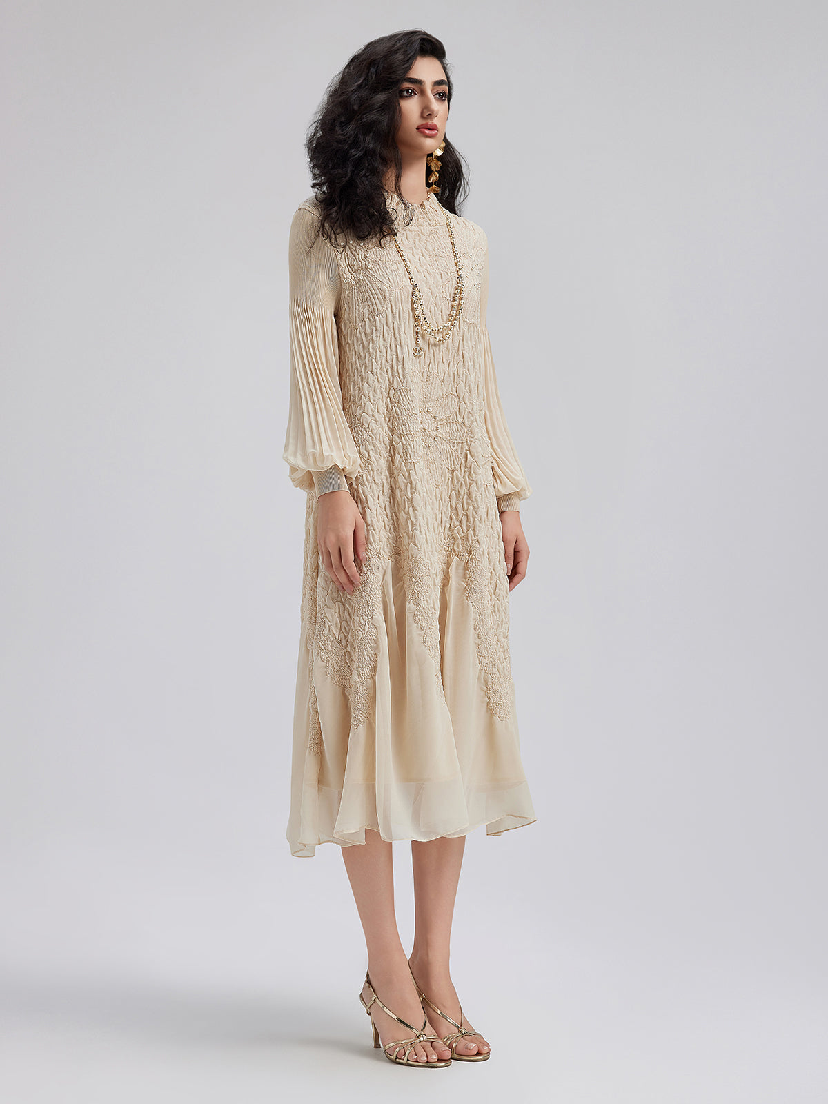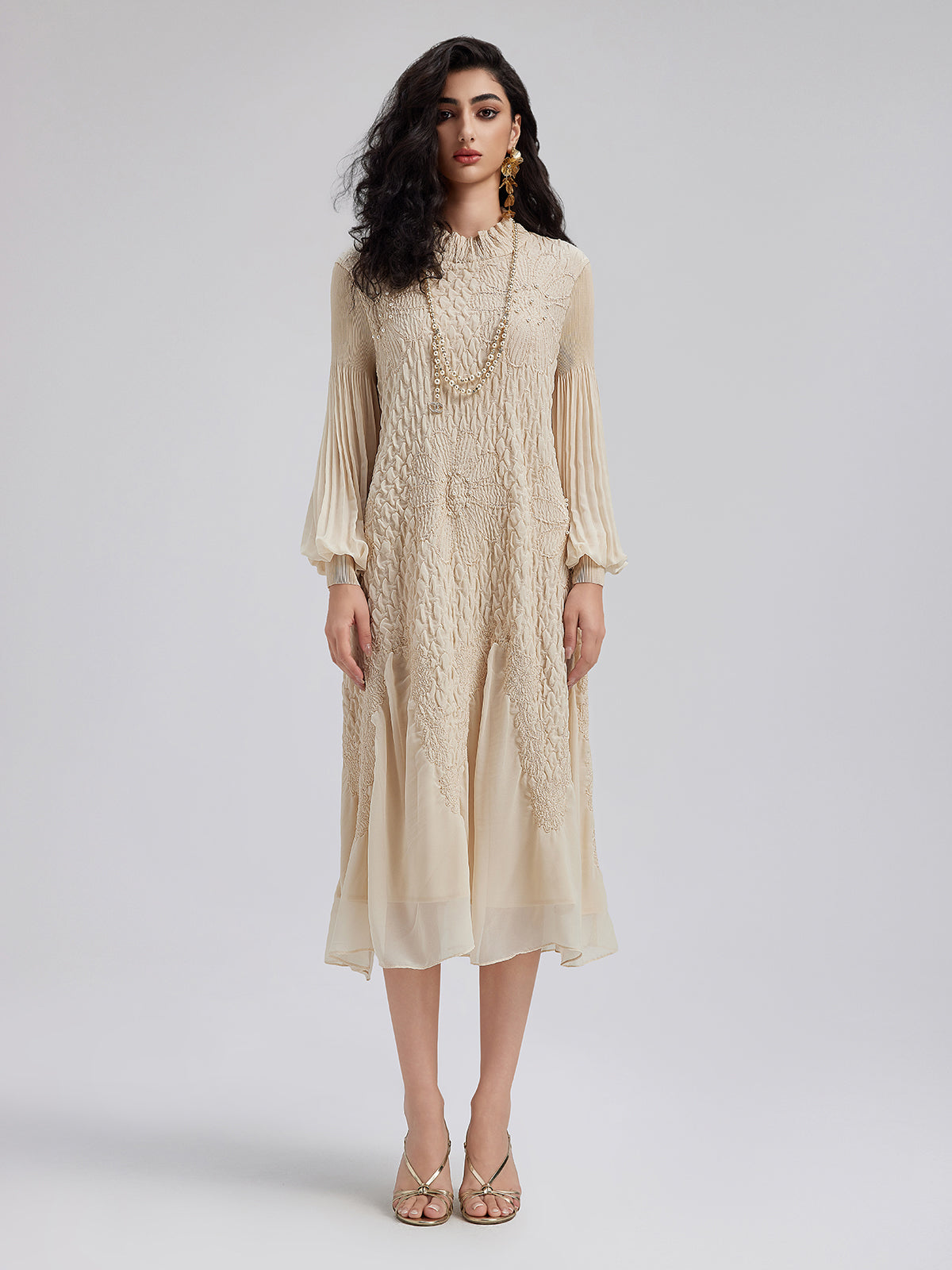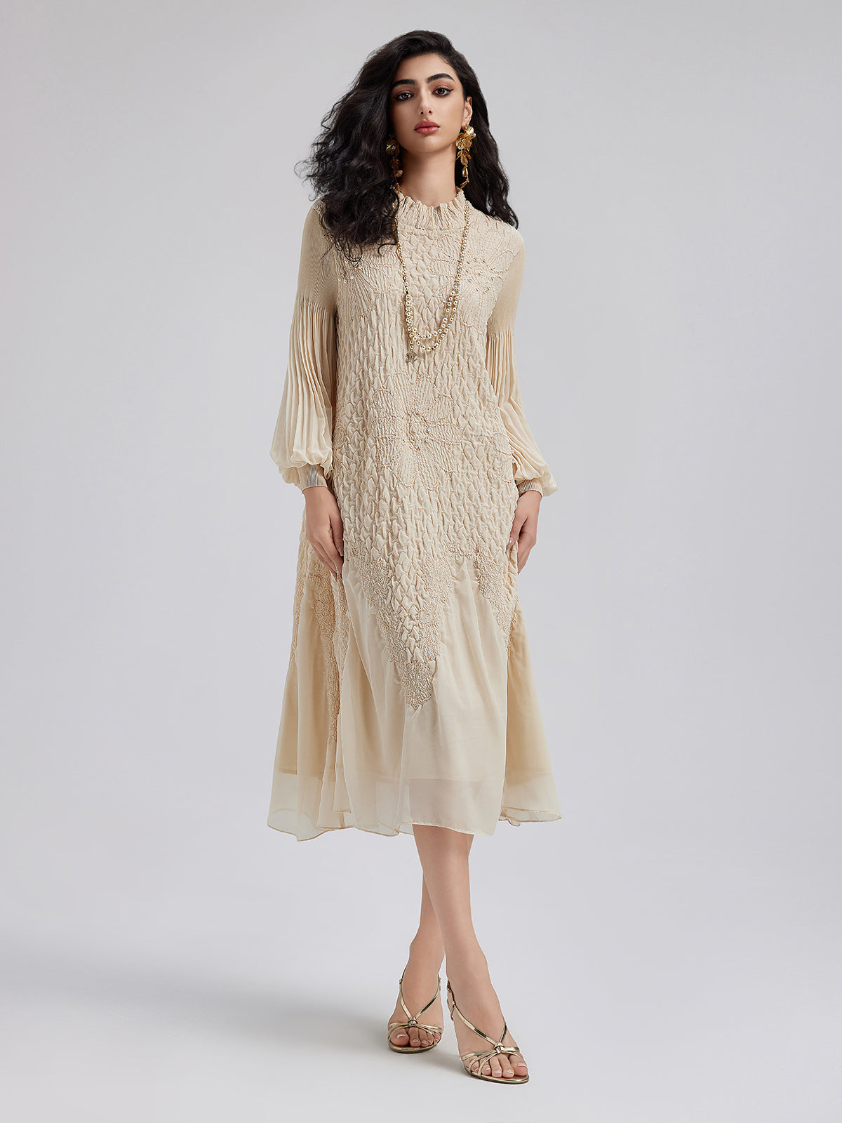 Round Neck Pleated Loose Embroidered Dress