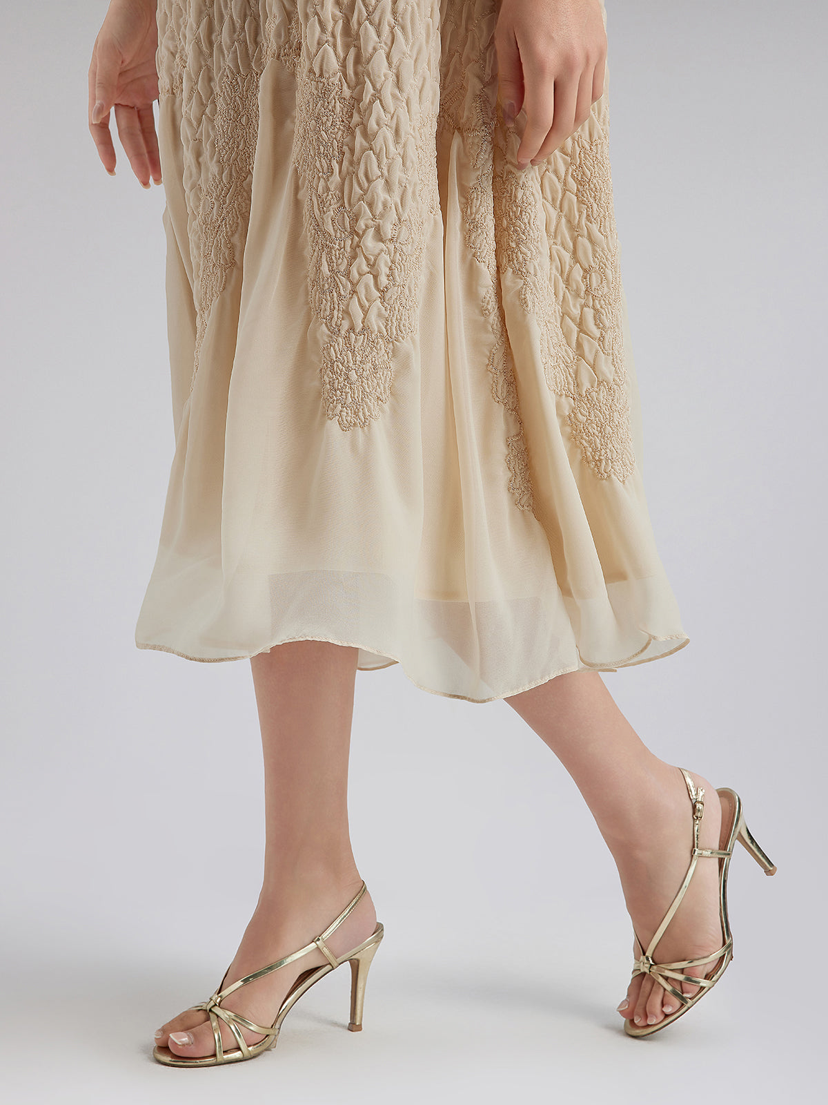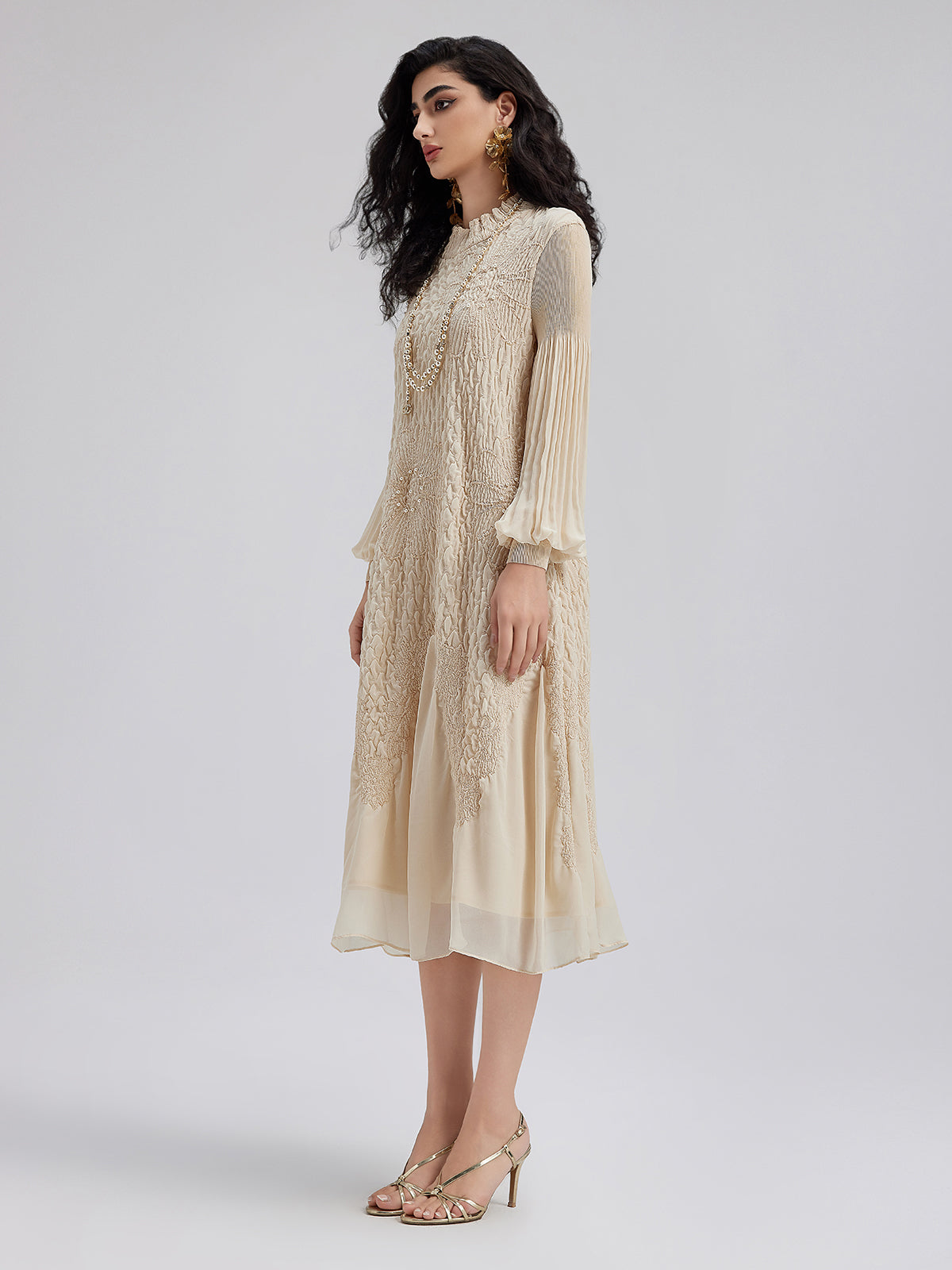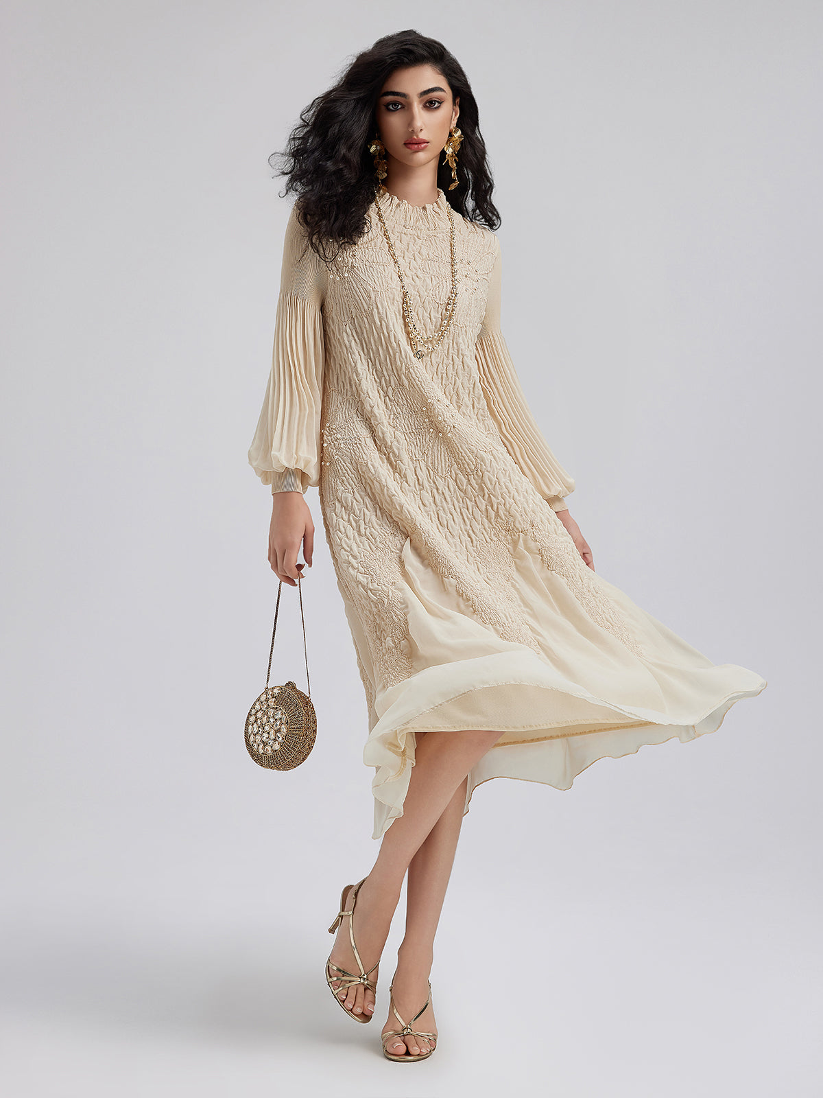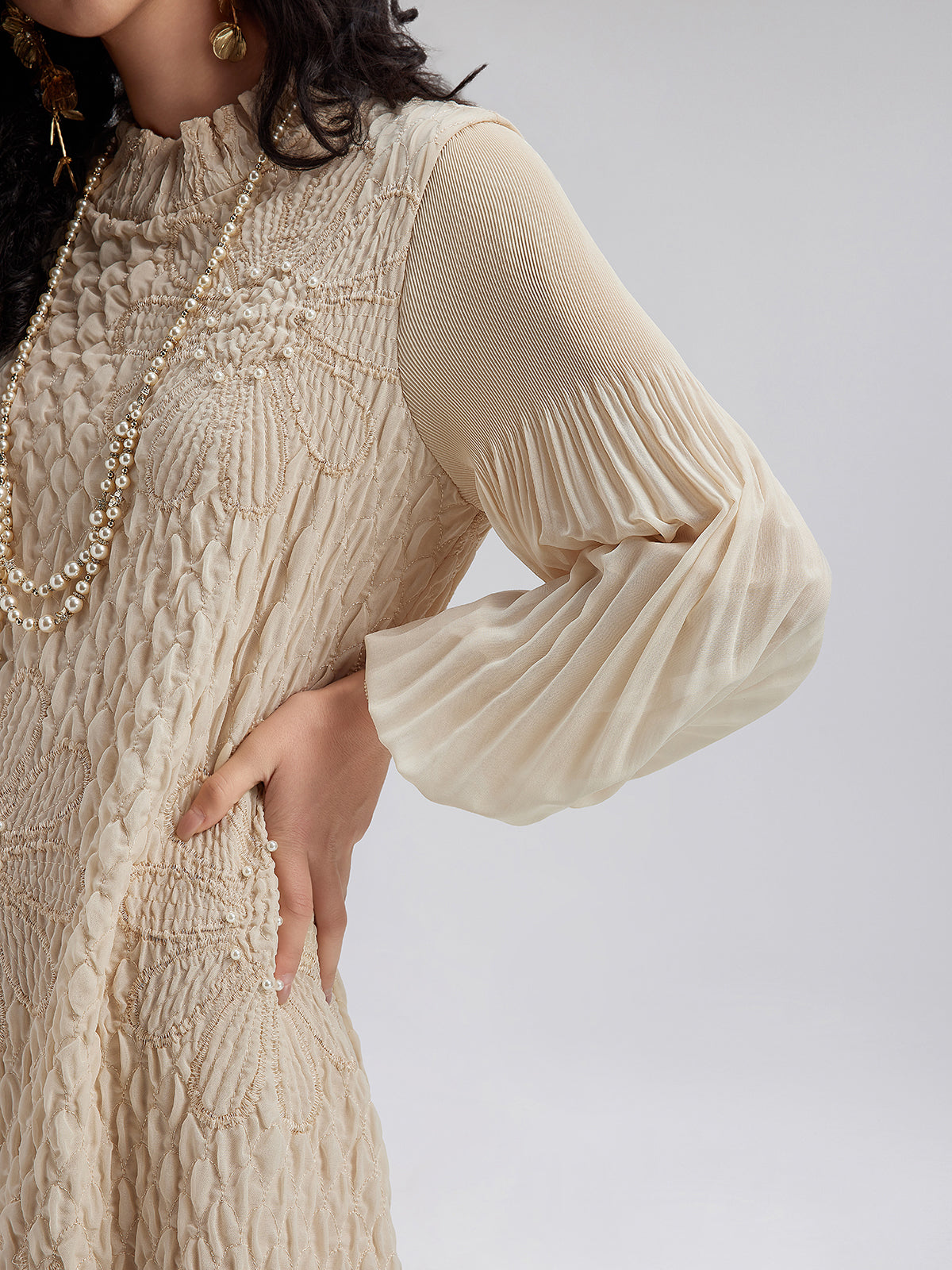 Round Neck Pleated Loose Embroidered Dress