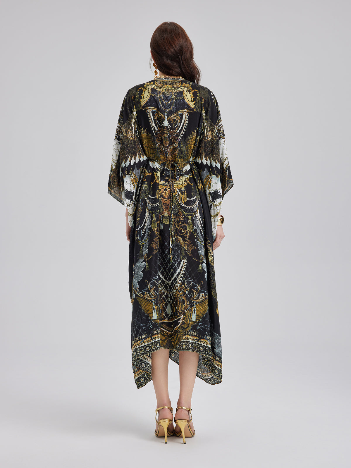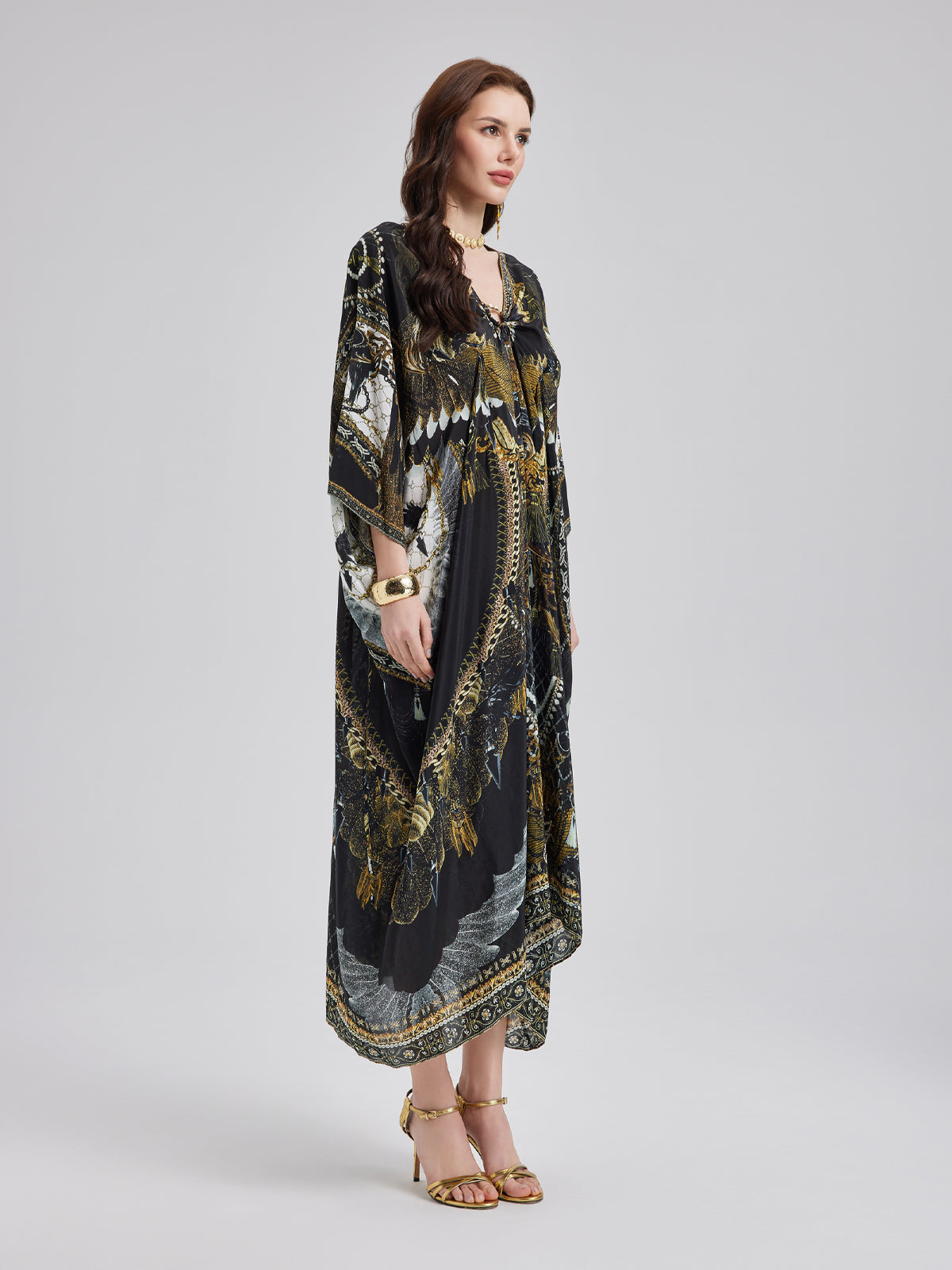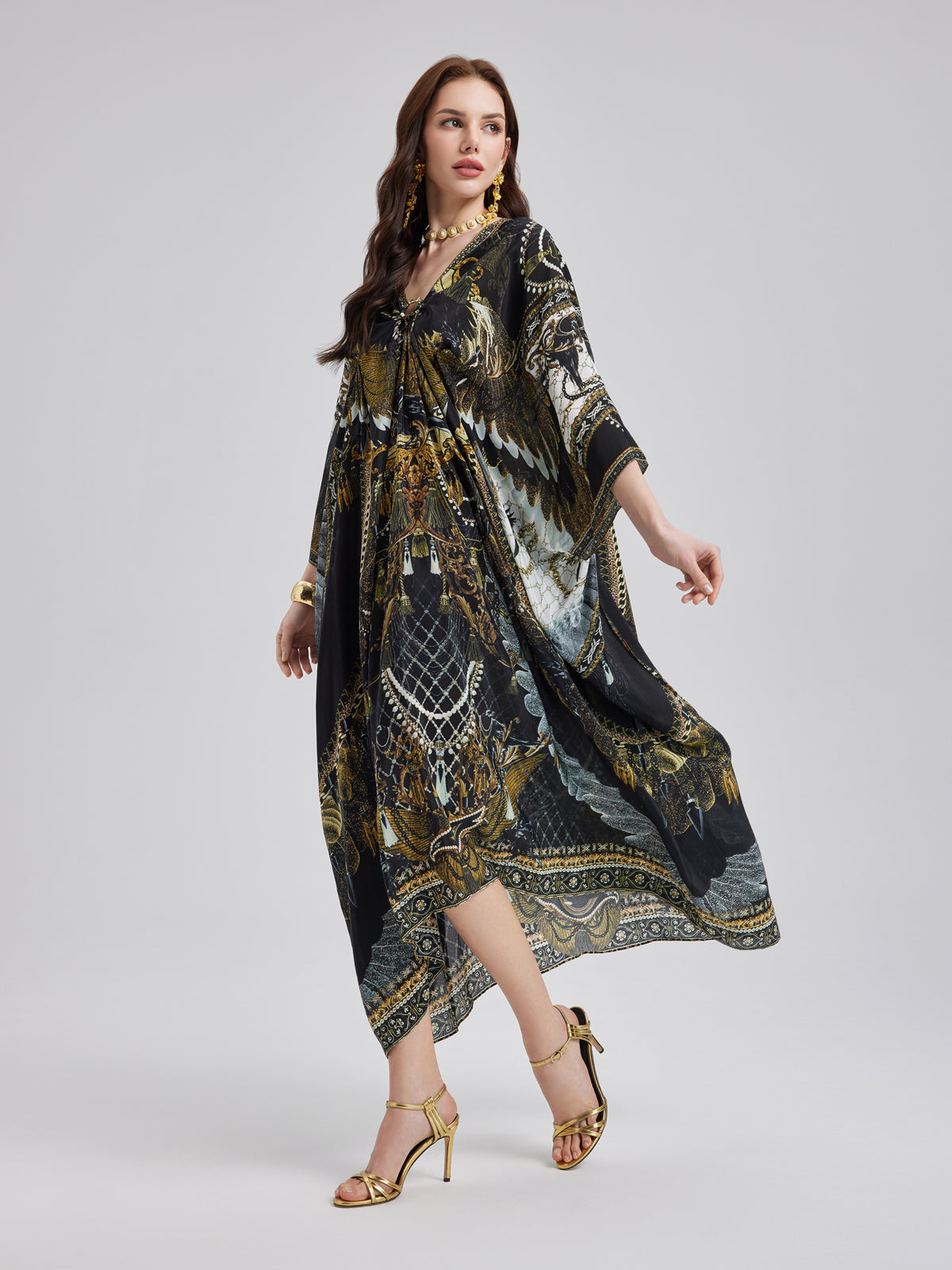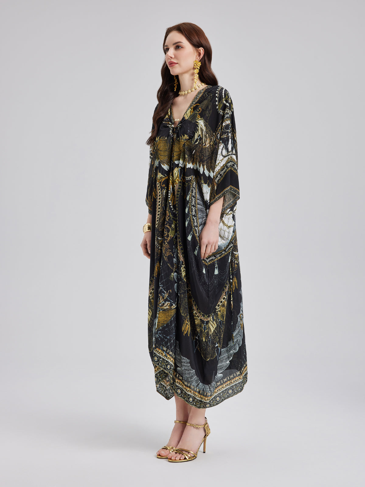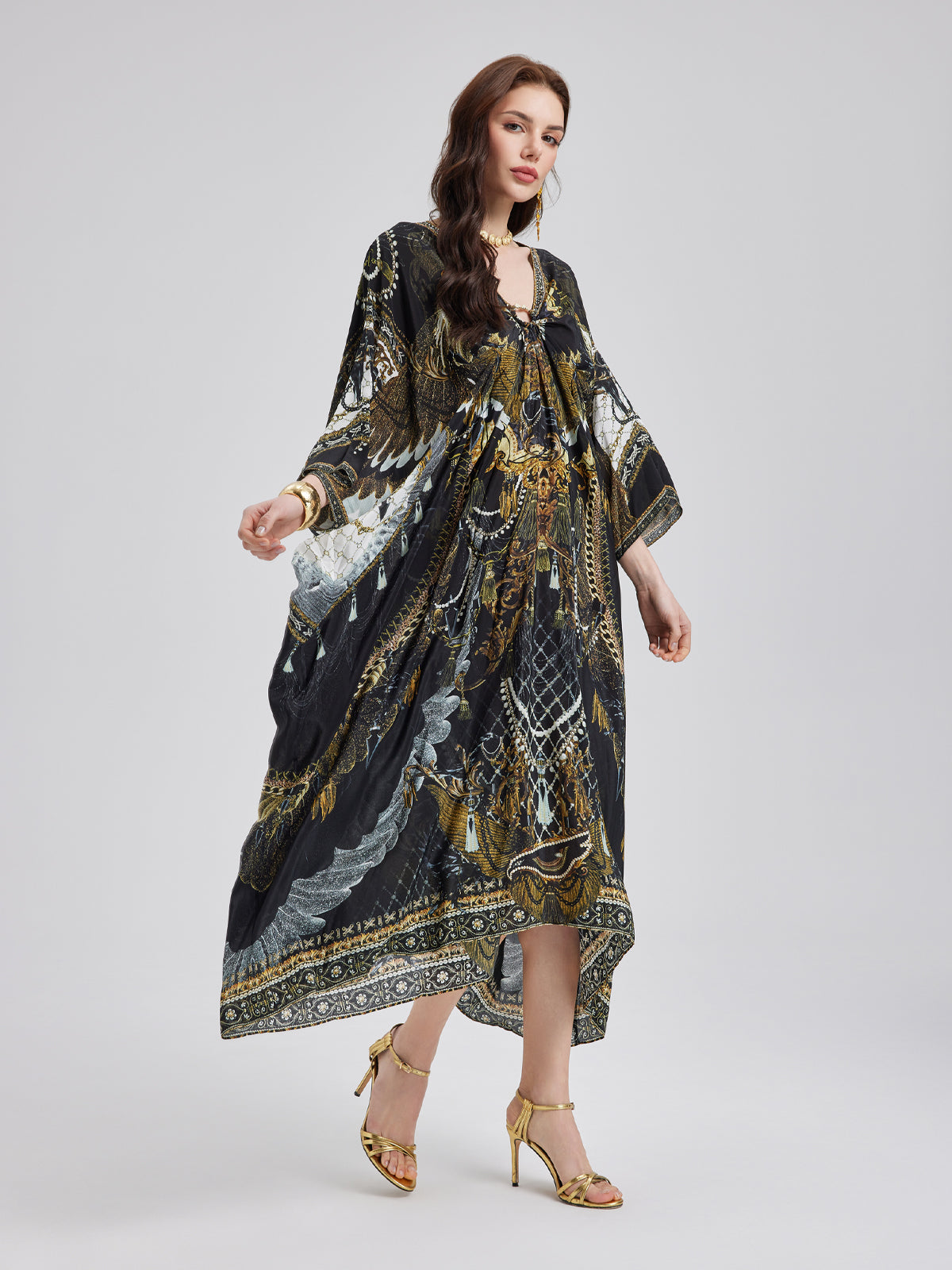 Made from smooth, luxurious mulberry silk, this flowy maxi dress features an elegant baroque-inspired print. The relaxed fit flatters all body types, while the V-neck with a metallic ring detail adds a touch of effortless allure. Its elongated silhouette enhances height, creating a graceful, refined look.