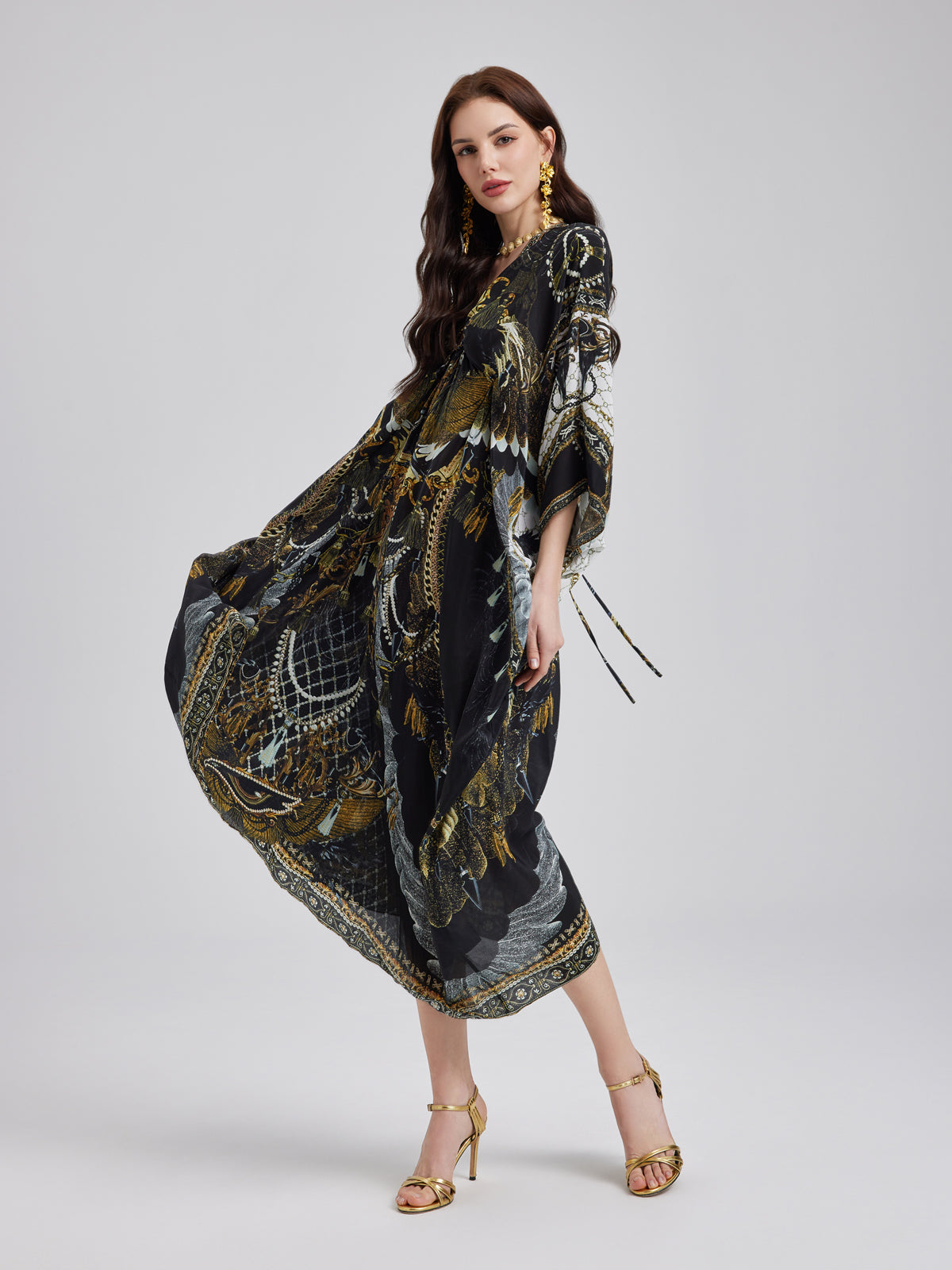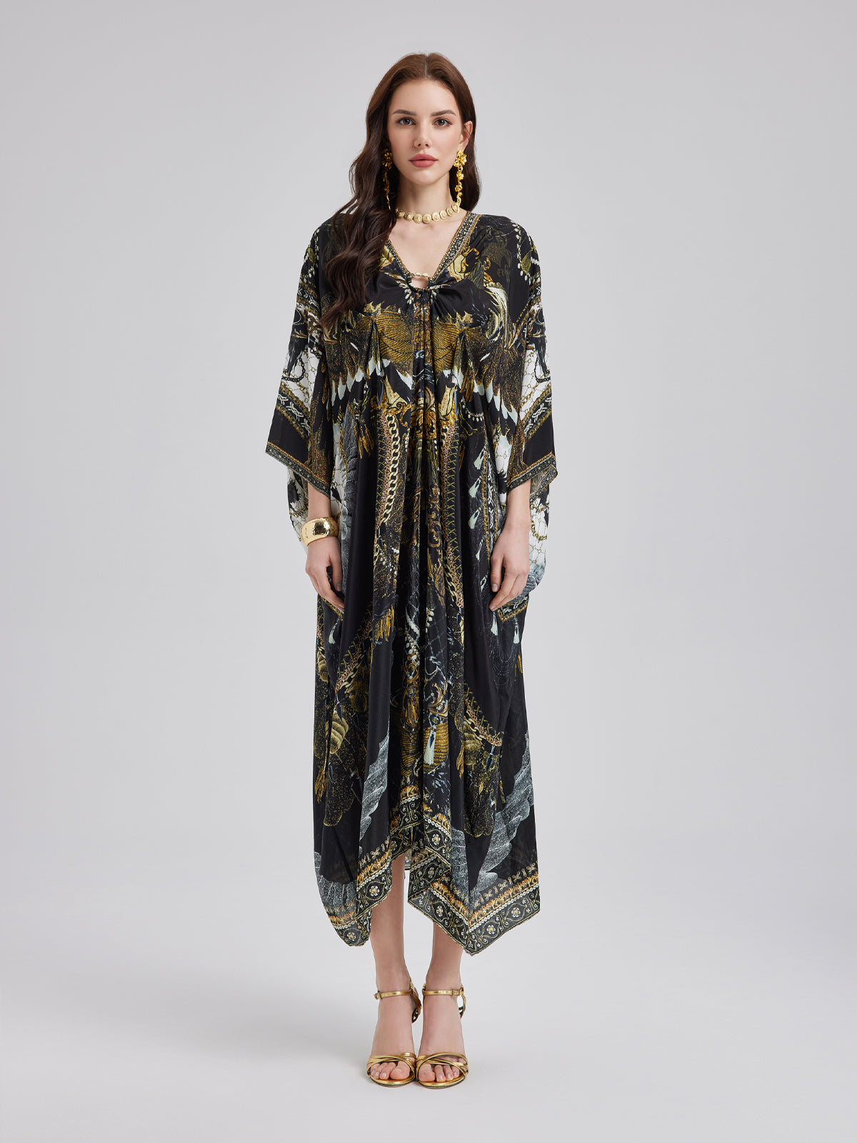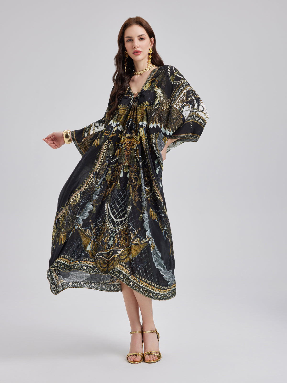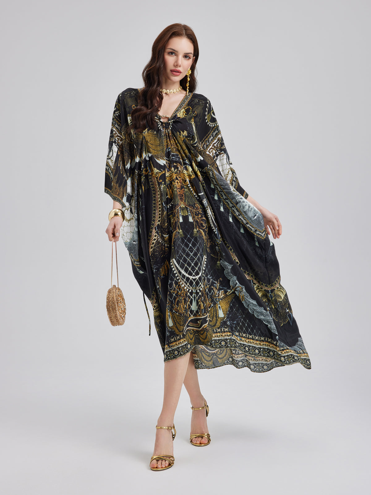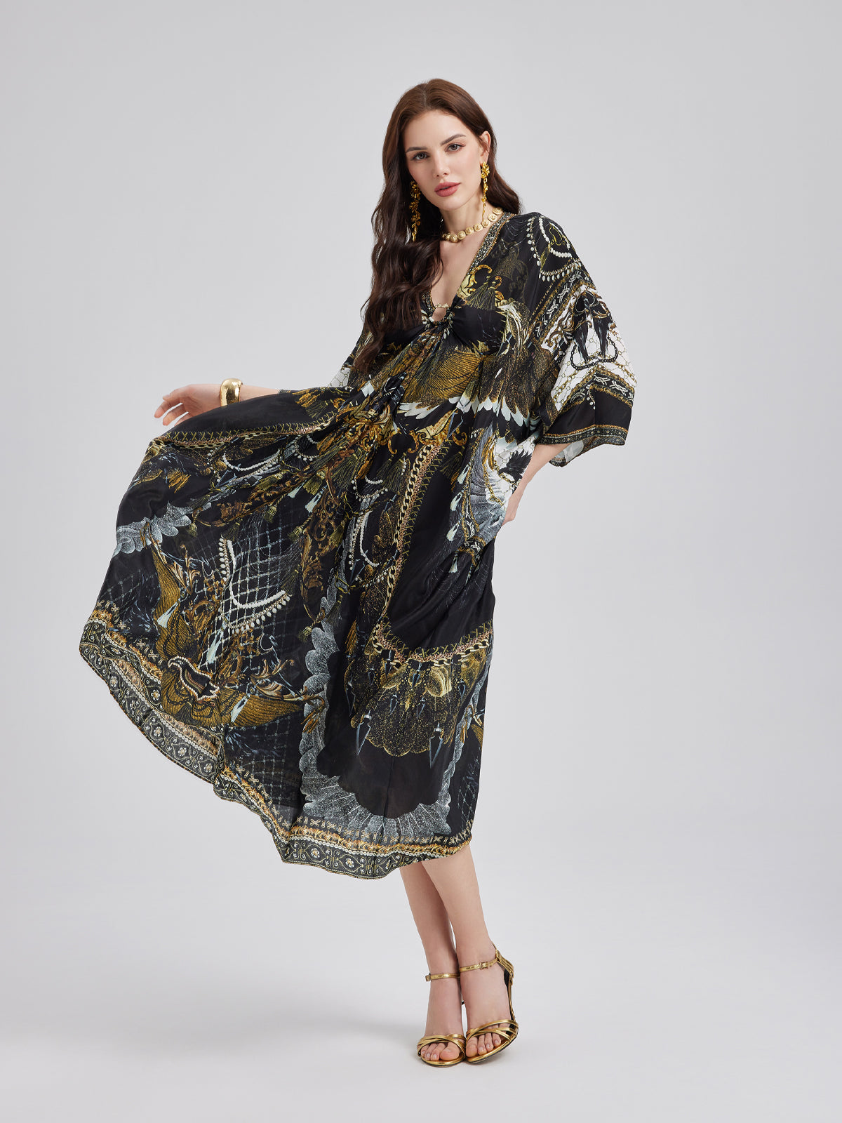 Made from smooth, luxurious mulberry silk, this flowy maxi dress features an elegant baroque-inspired print. The relaxed fit flatters all body types, while the V-neck with a metallic ring detail adds a touch of effortless allure. Its elongated silhouette enhances height, creating a graceful, refined look.