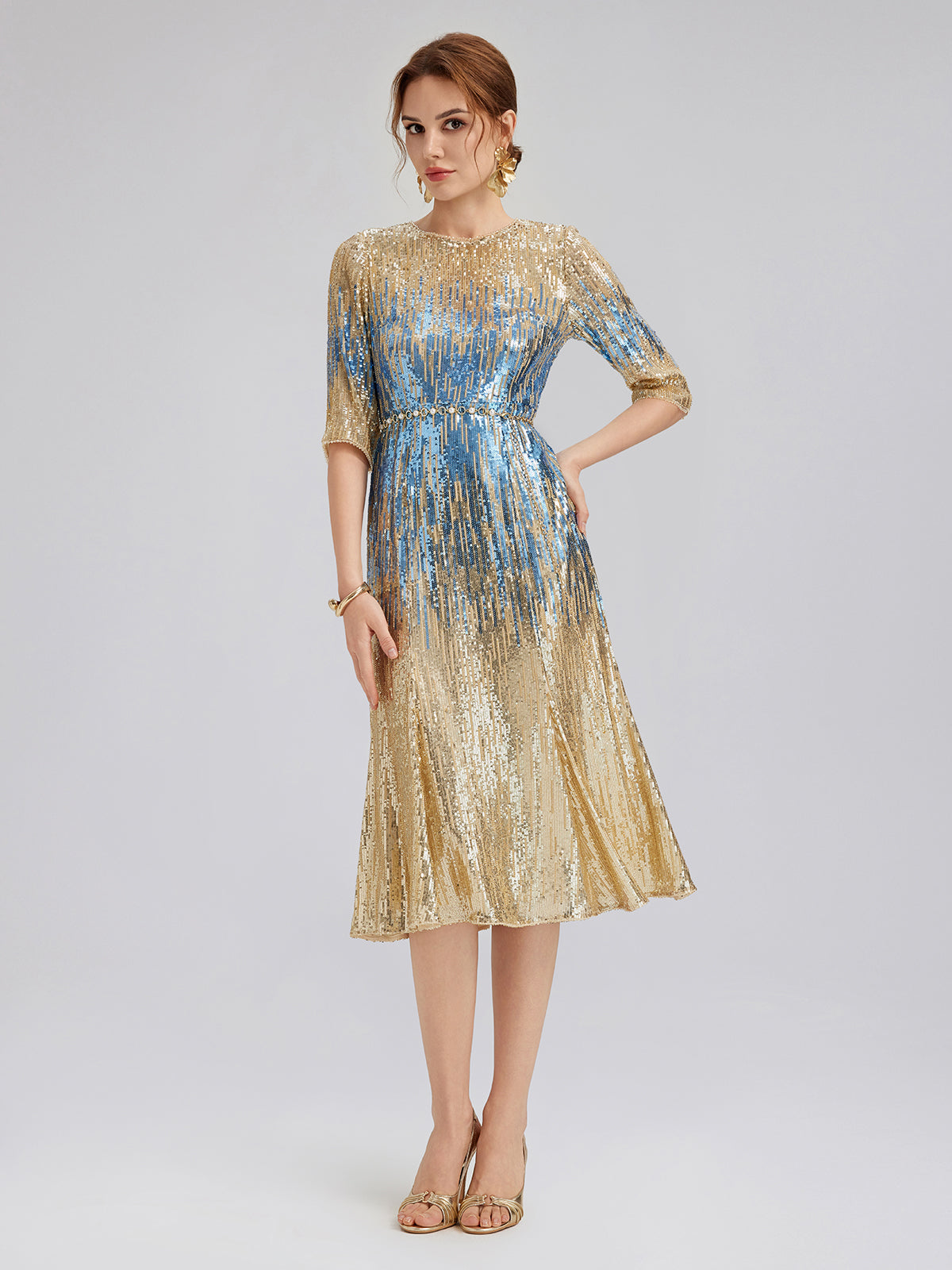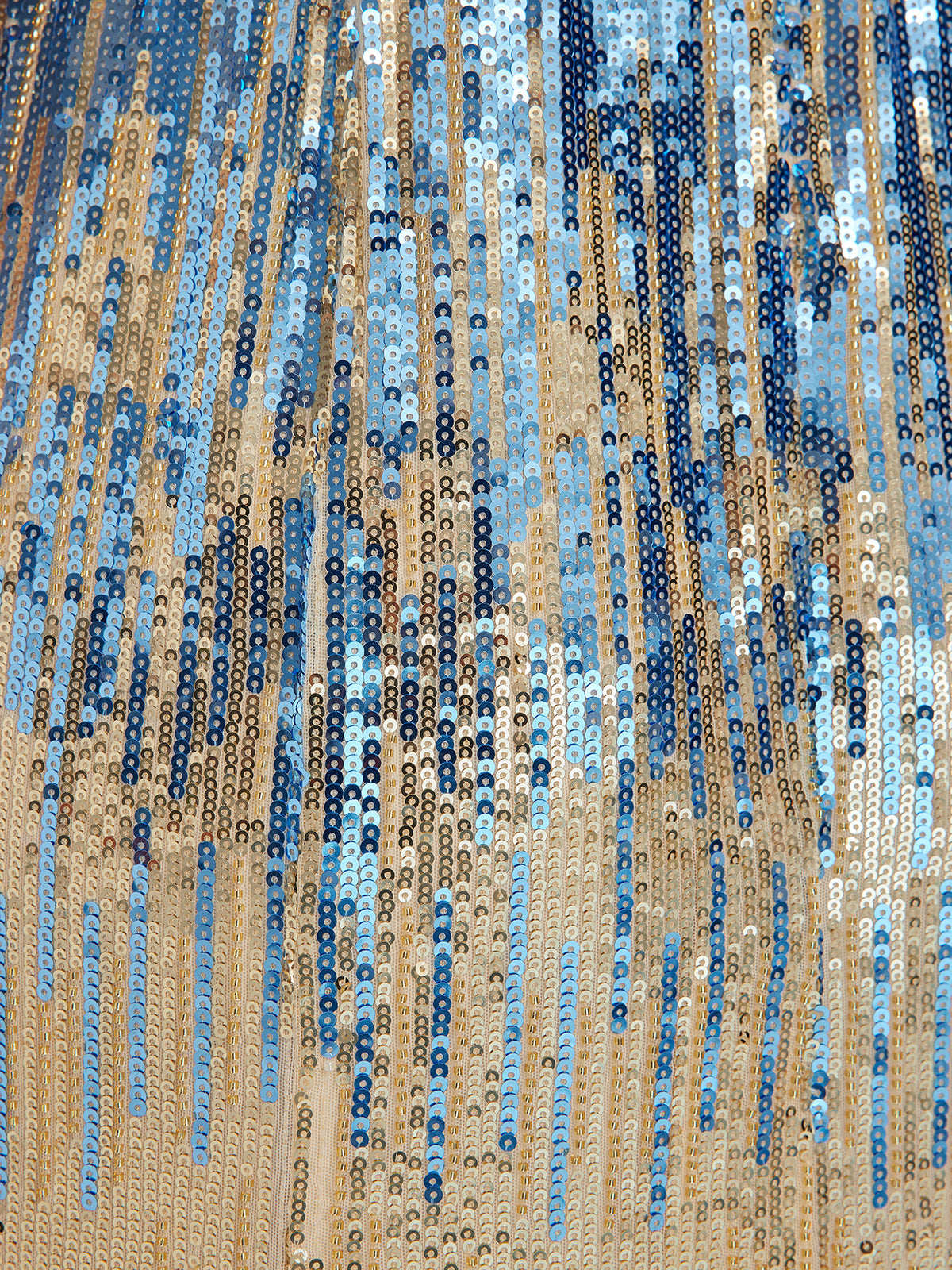 Each piece is custom-embroidered with specially designed sequins—soft to the touch, yet richly textured. The gown flows from gold to blue in a soft ombré, adding visual depth and modern elegance. Hand-beaded details at the neckline and cuffs accent the silhouette, while a hidden back zip ensures an easy, refined finish.