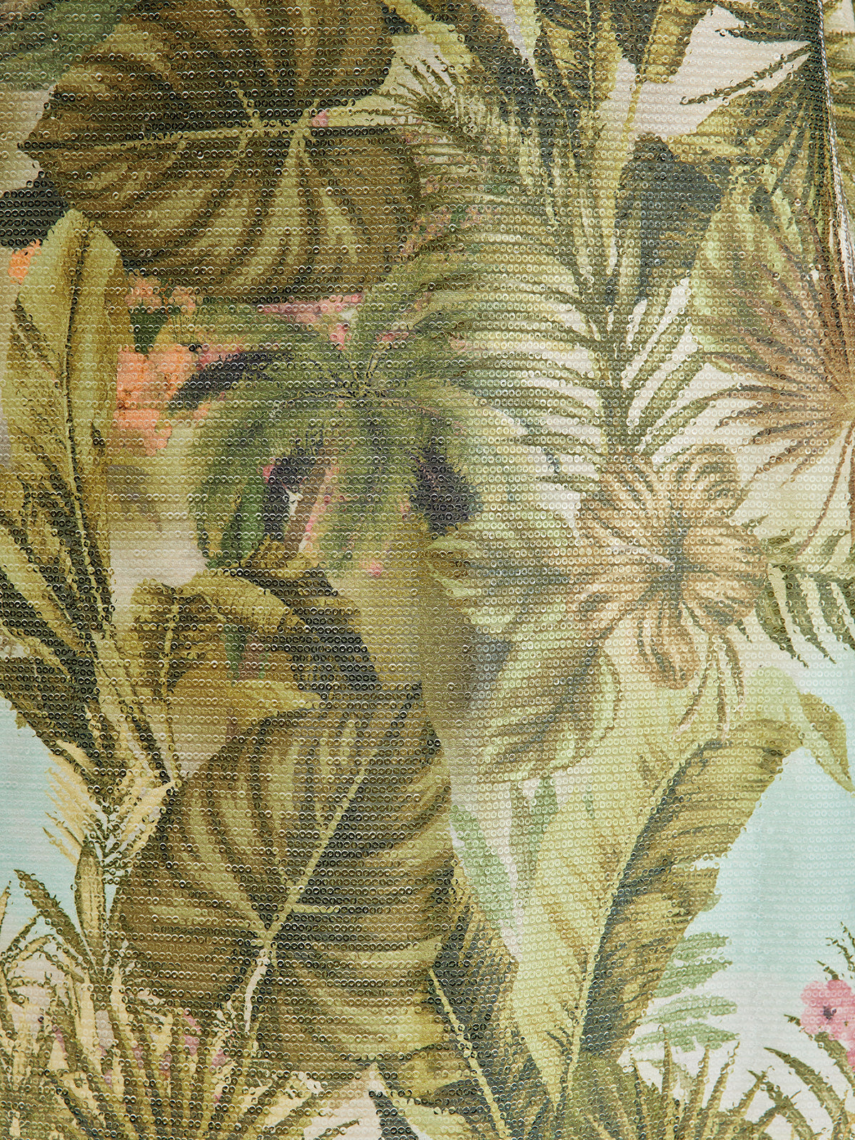 Crafted from a custom shiny sequin-knit fabric with delicate tropical plant patterns, this dress features soft colors that create a fresh, natural vibe. The hidden back zipper ensures easy wear, while the relaxed, stretchy fit provides comfort and movement. The fabric drapes beautifully, flowing effortlessly for a sleek, fluid look.