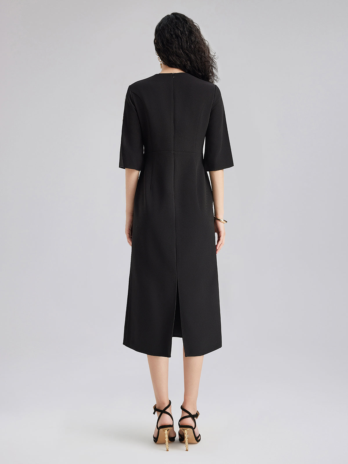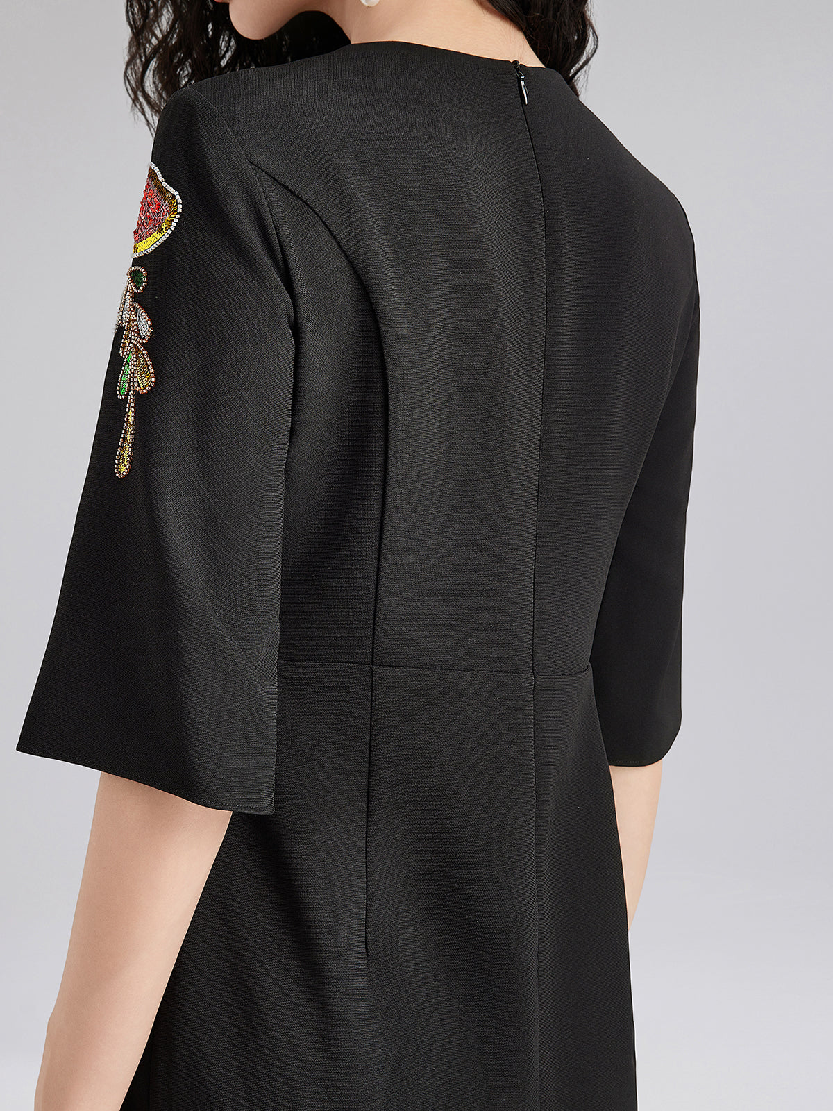 The classic black base paired with vibrant floral embroidery creates a striking contrast, full of vintage charm. The intricate needlework brings the flowers to life, showcasing exquisite craftsmanship. The timeless vintage style effortlessly creates a unique look, making this dress perfect for various occasions.