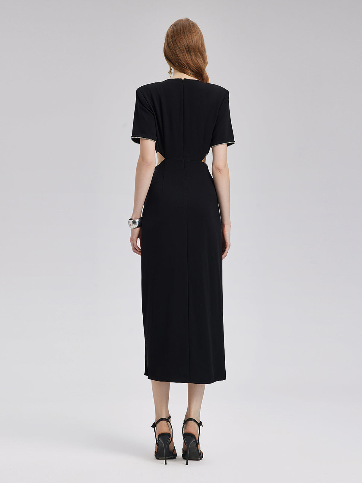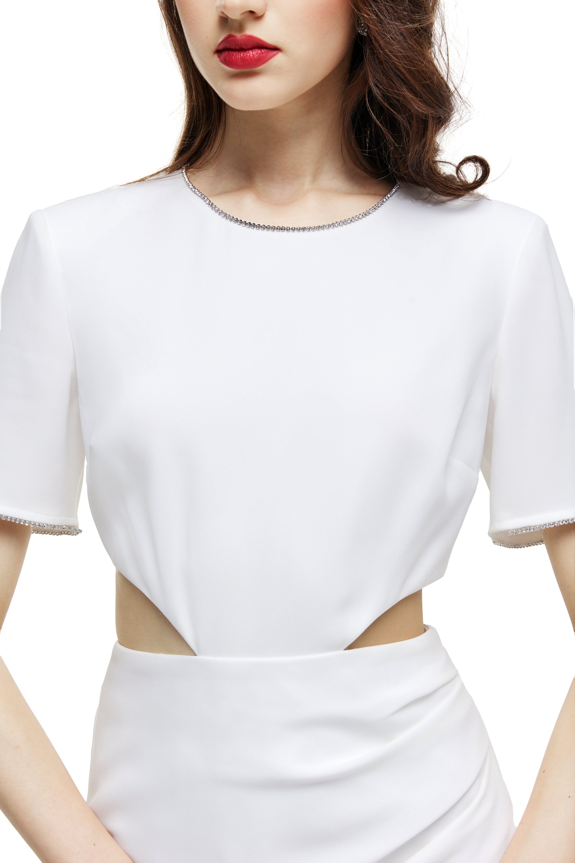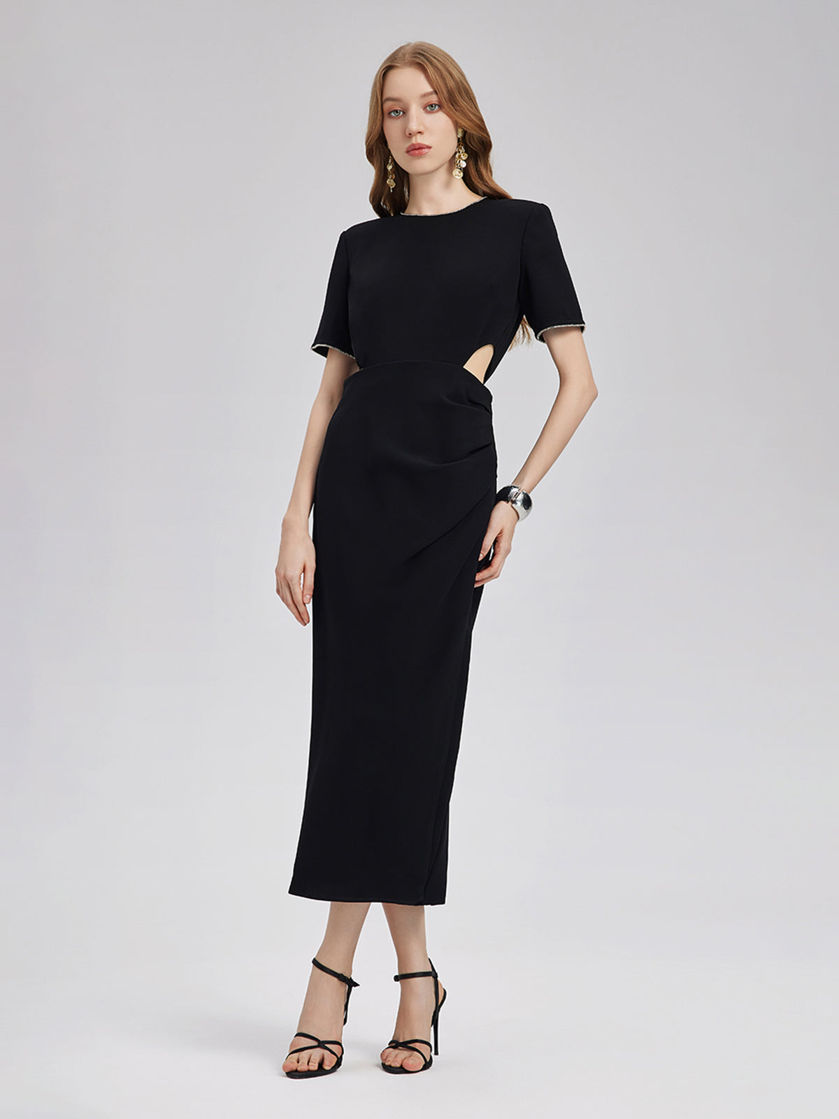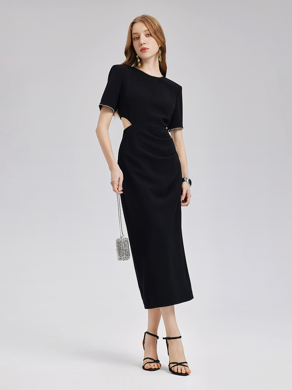 Advanced three-dimensional cut dress body gorgeous eye-catching. The geometric hollow shape at the waist highlights the small waist. Set off the graceful body, and the design sense diamond chain decoration around the transition of the romantic fashion tone belongs to Miss Radi. Paired with the clipped cut and comfortable fabric, it creates a relaxed and stylish look for the body.