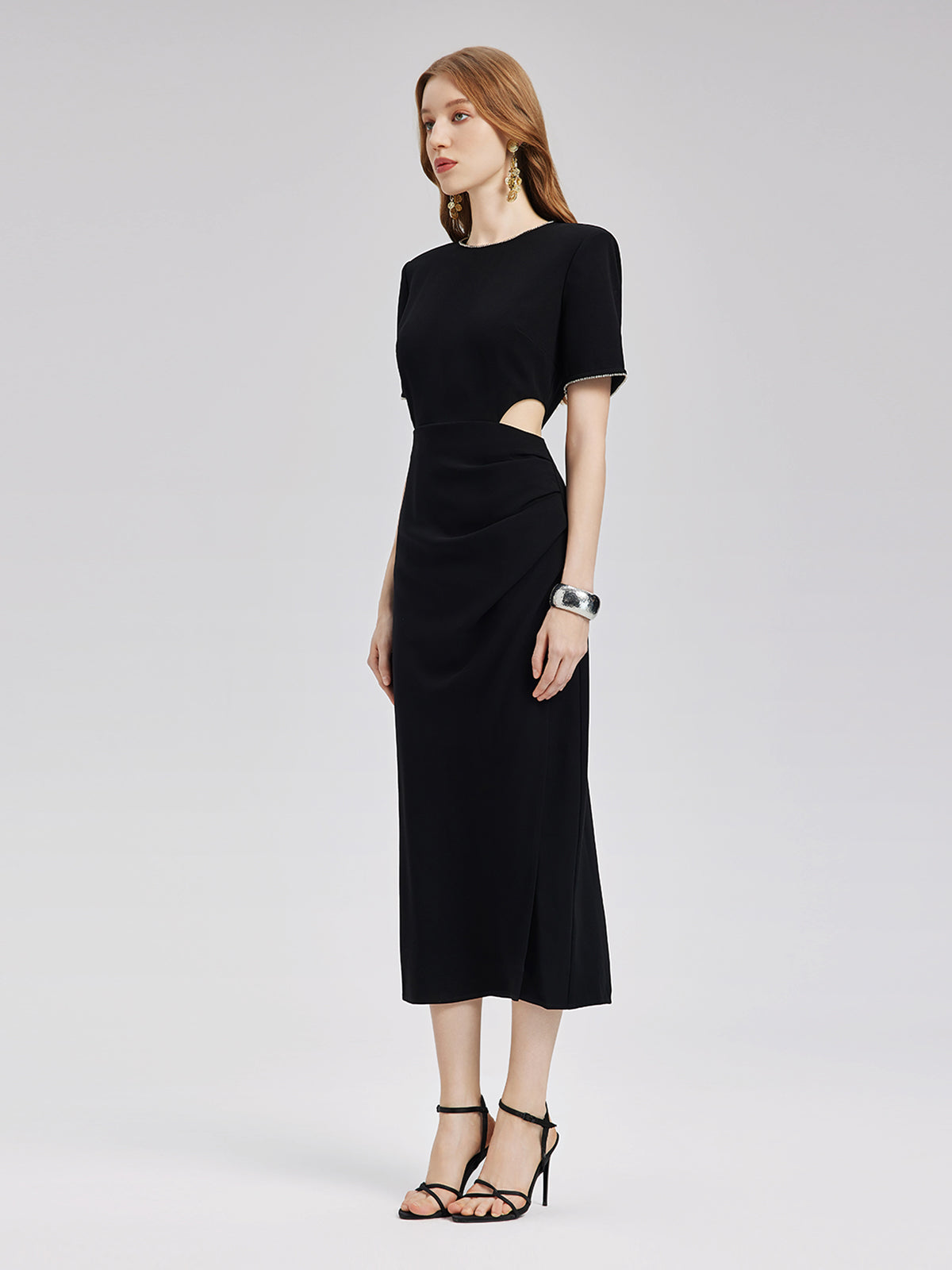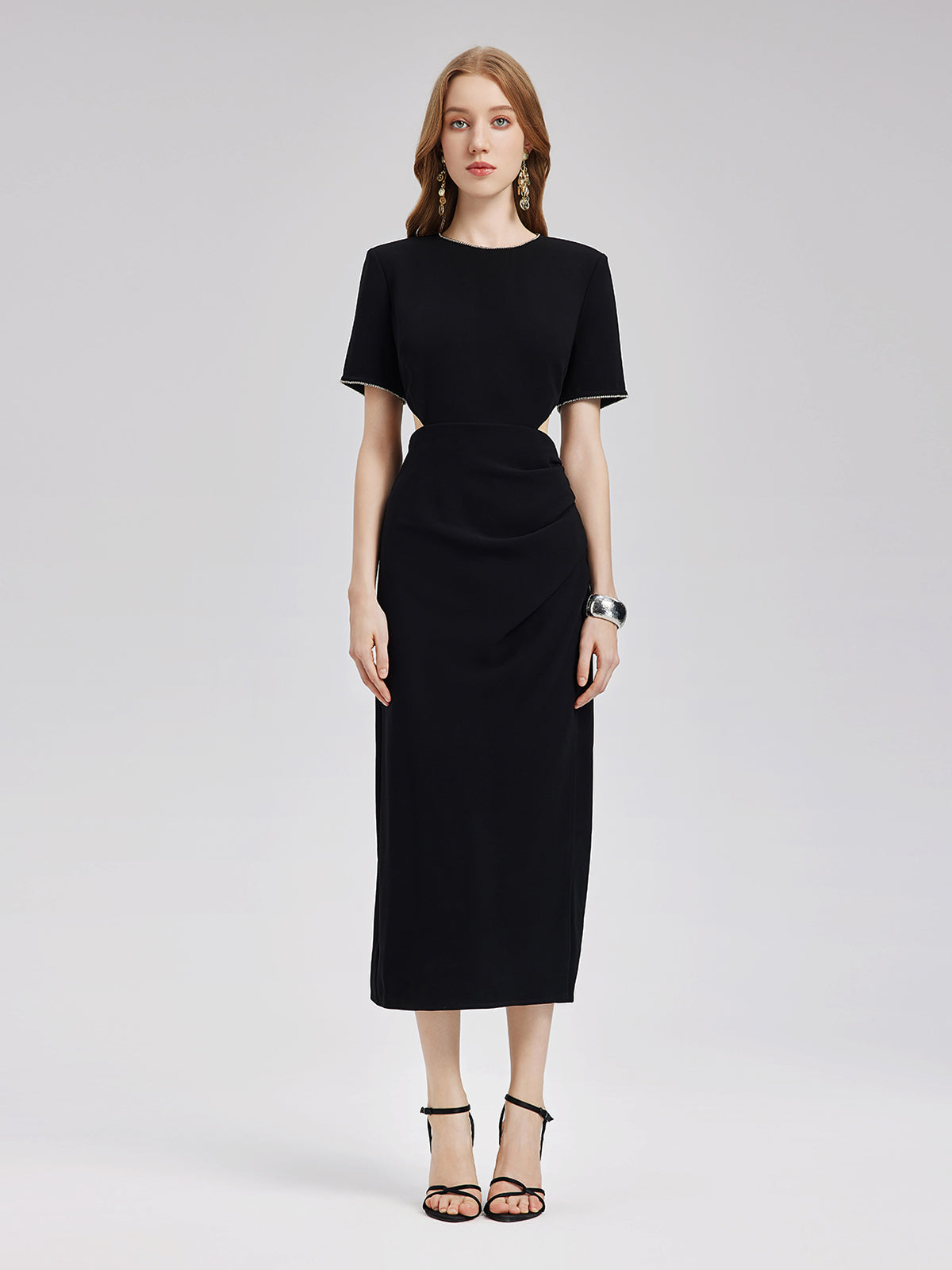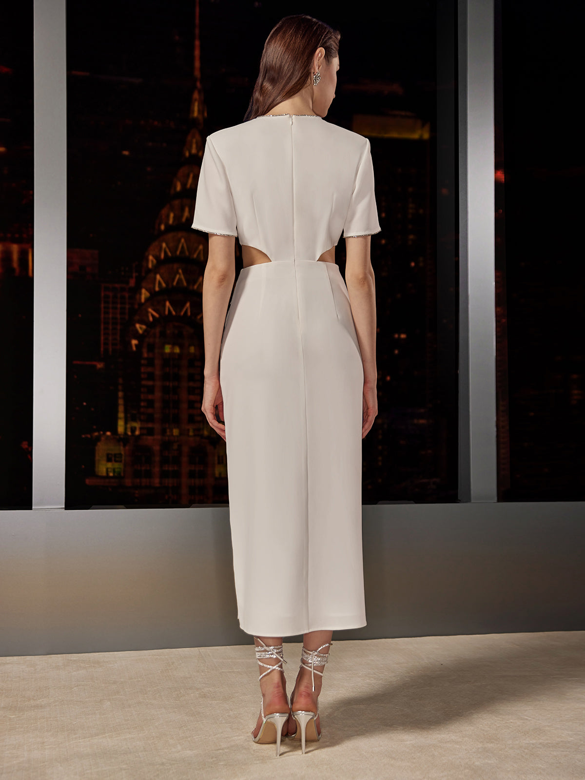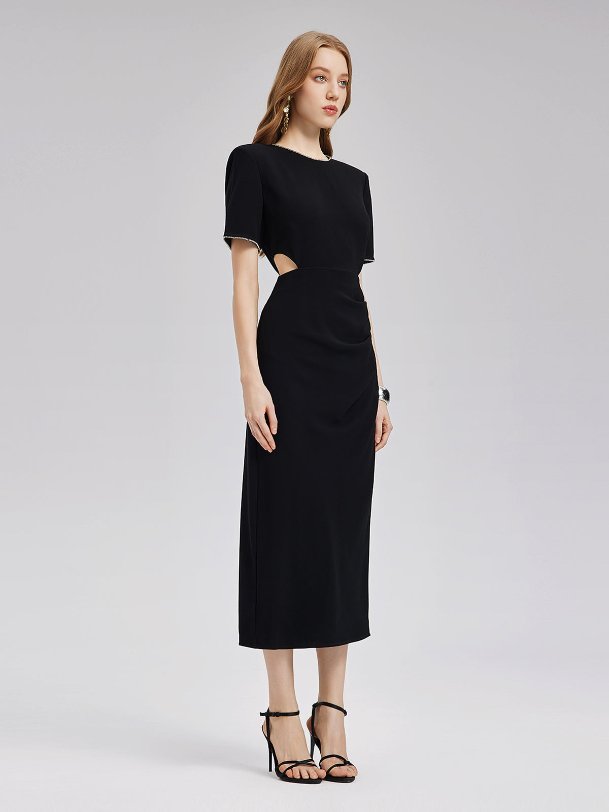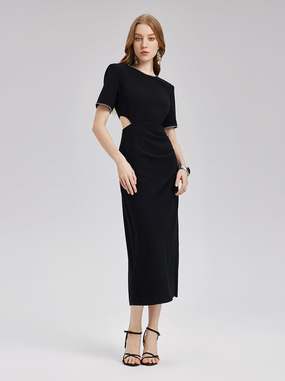 Advanced three-dimensional cut dress body gorgeous eye-catching. The geometric hollow shape at the waist highlights the small waist. Set off the graceful body, and the design sense diamond chain decoration around the transition of the romantic fashion tone belongs to Miss Radi. Paired with the clipped cut and comfortable fabric, it creates a relaxed and stylish look for the body.