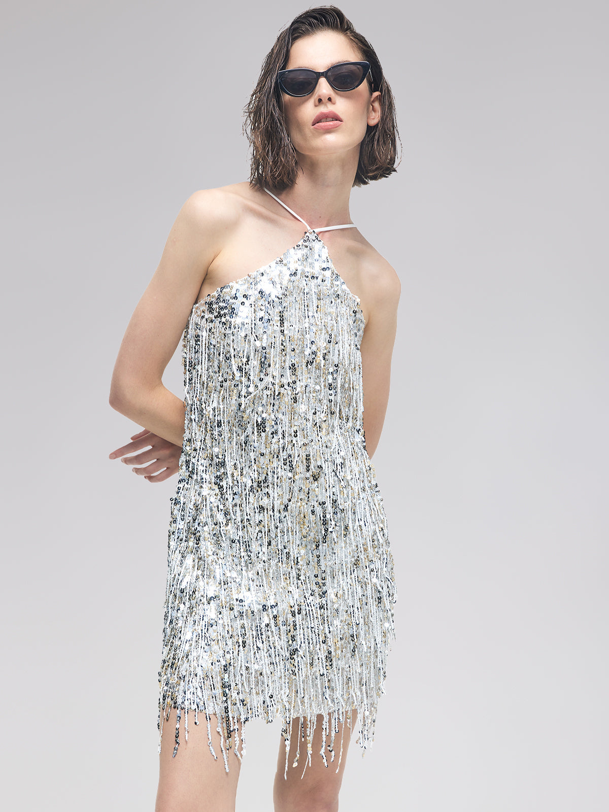 The classic gold and silver two-tone sparkly fringe beaded halter mini dress is from the Rock Star collection. Founder Radi wanted to capture a retro disco party in the 70s that threw away all inhibitions on the dance floor and paid tribute to the feminine light that was ignited in the disco era.